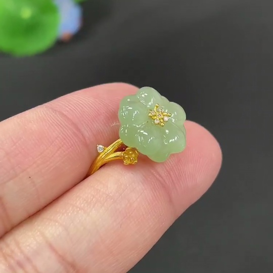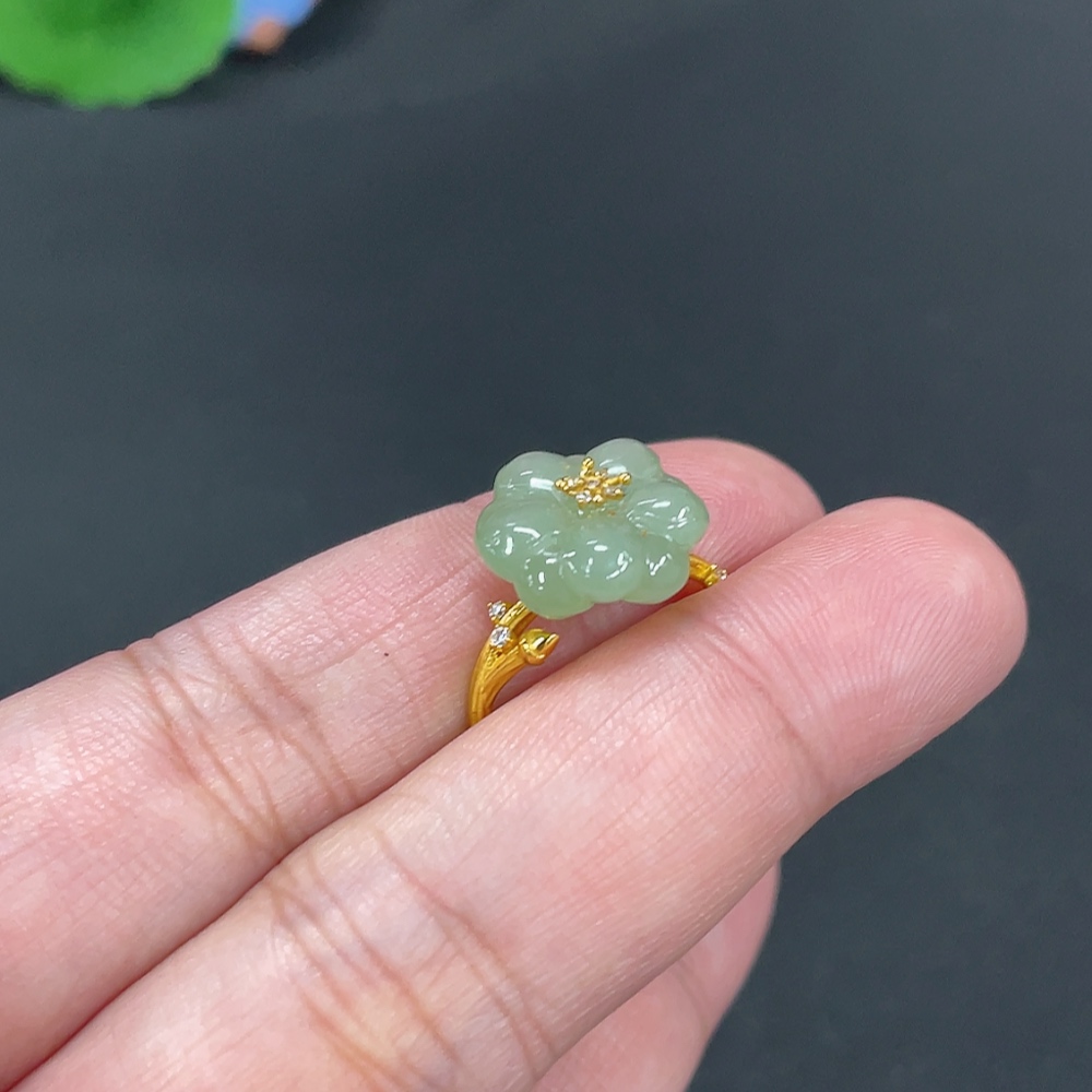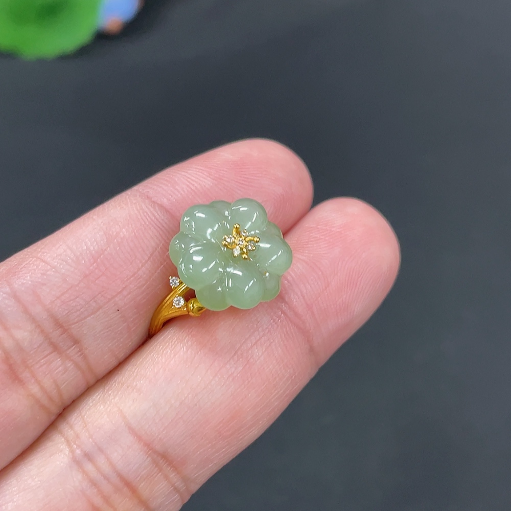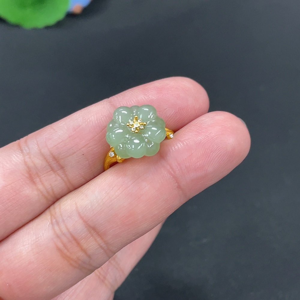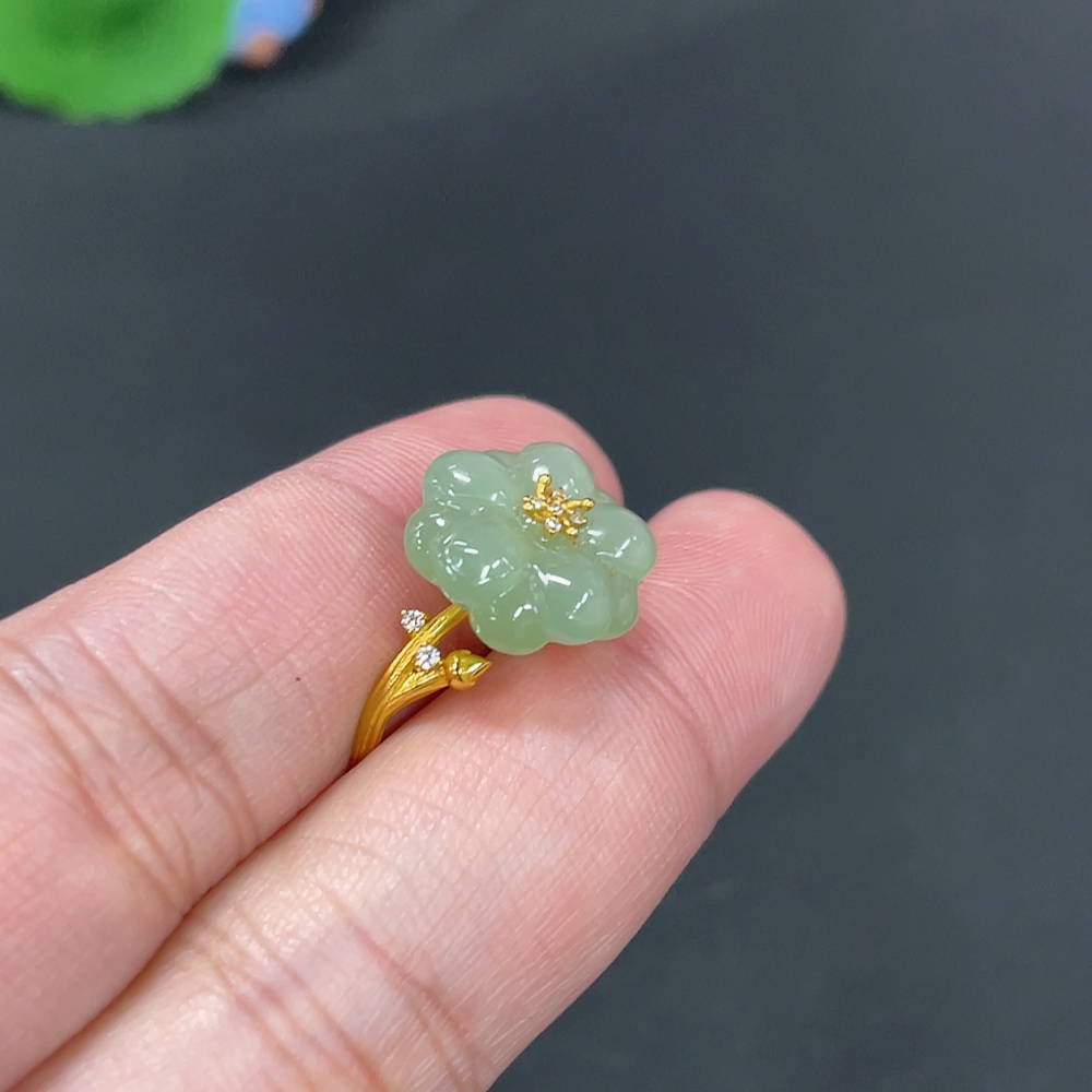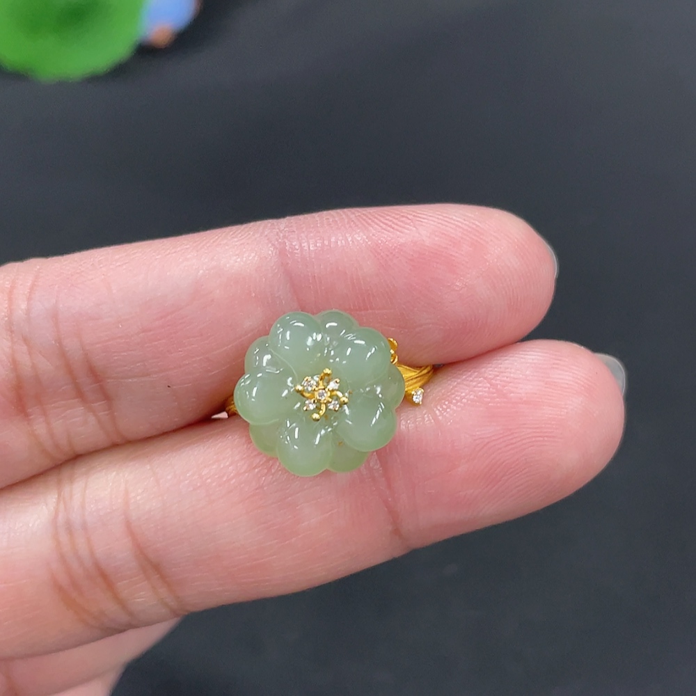 Hetian Jade Inlaid Ring "Flower Blooms and Wealth Flourishes" Size 15.5 Total Weight Approx. 2.9g 18K Band Gold Content 72%