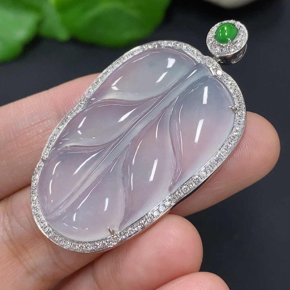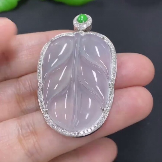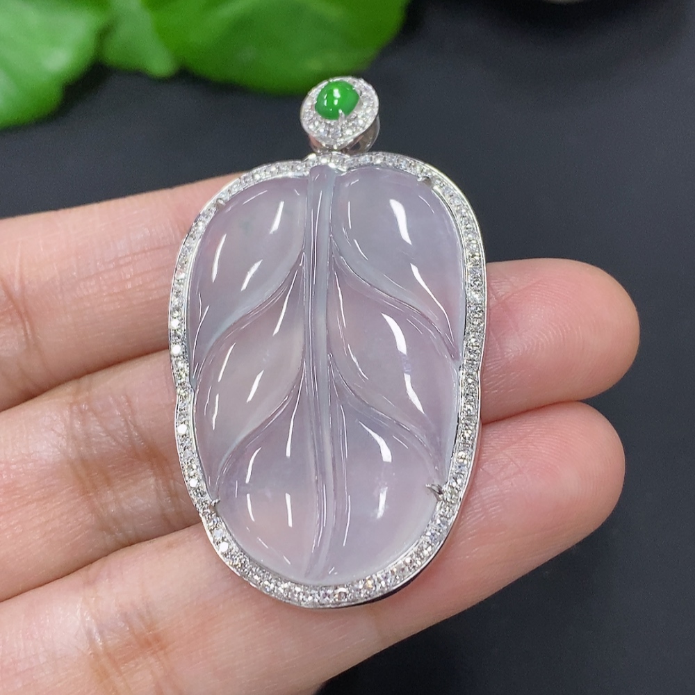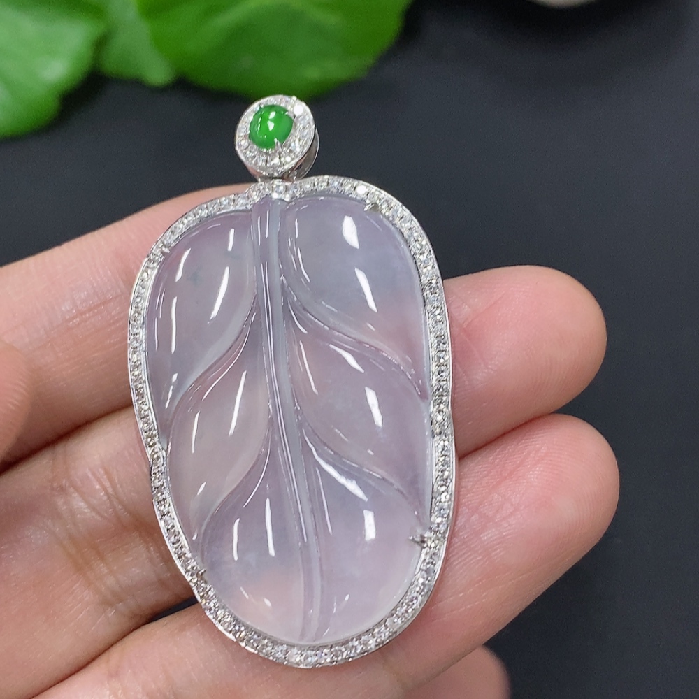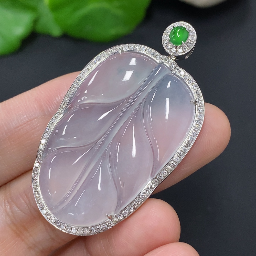 Jadeite Leaf Inlaid Pendant 18K Gold Total Weight Approx. 10.5g (With Diamond Accents)