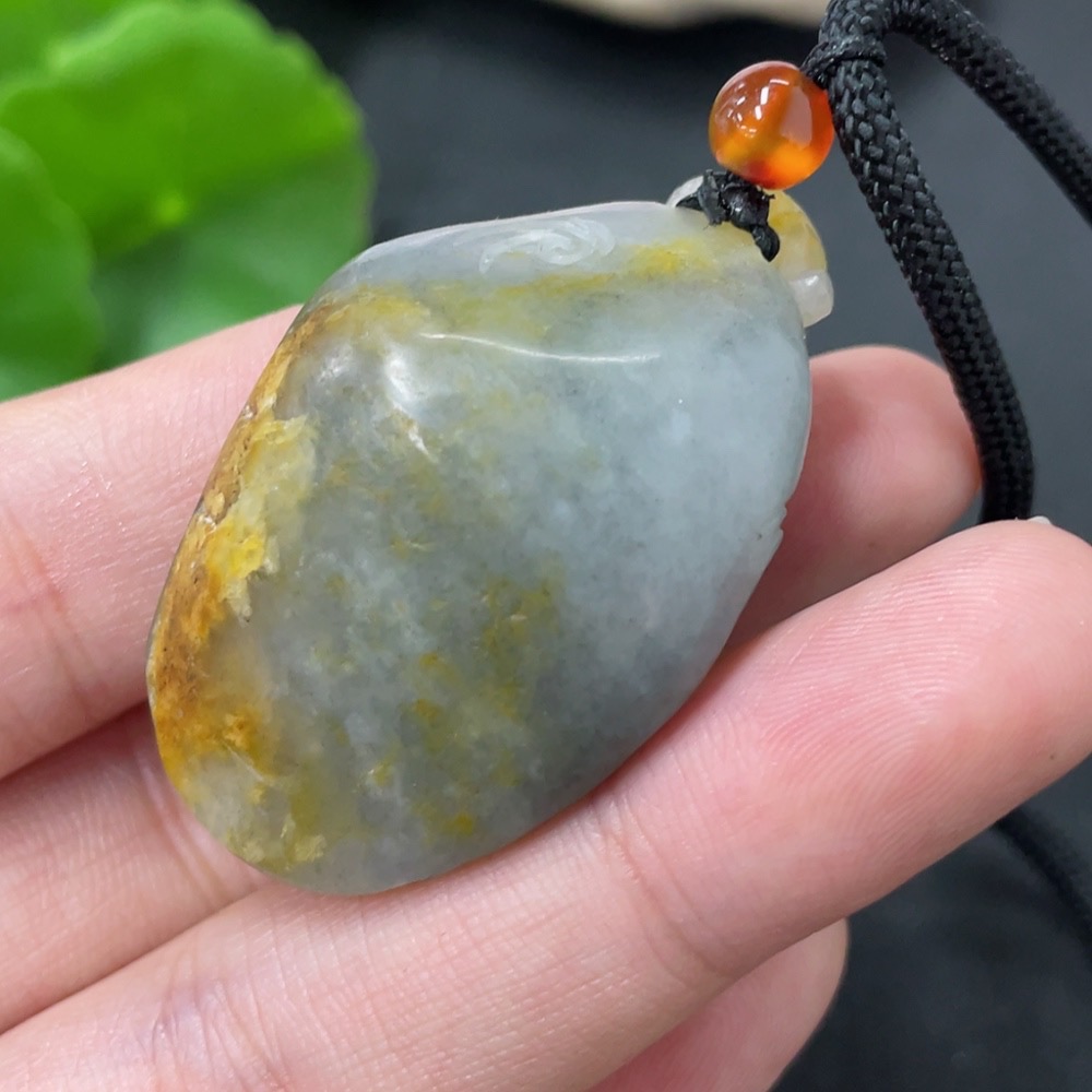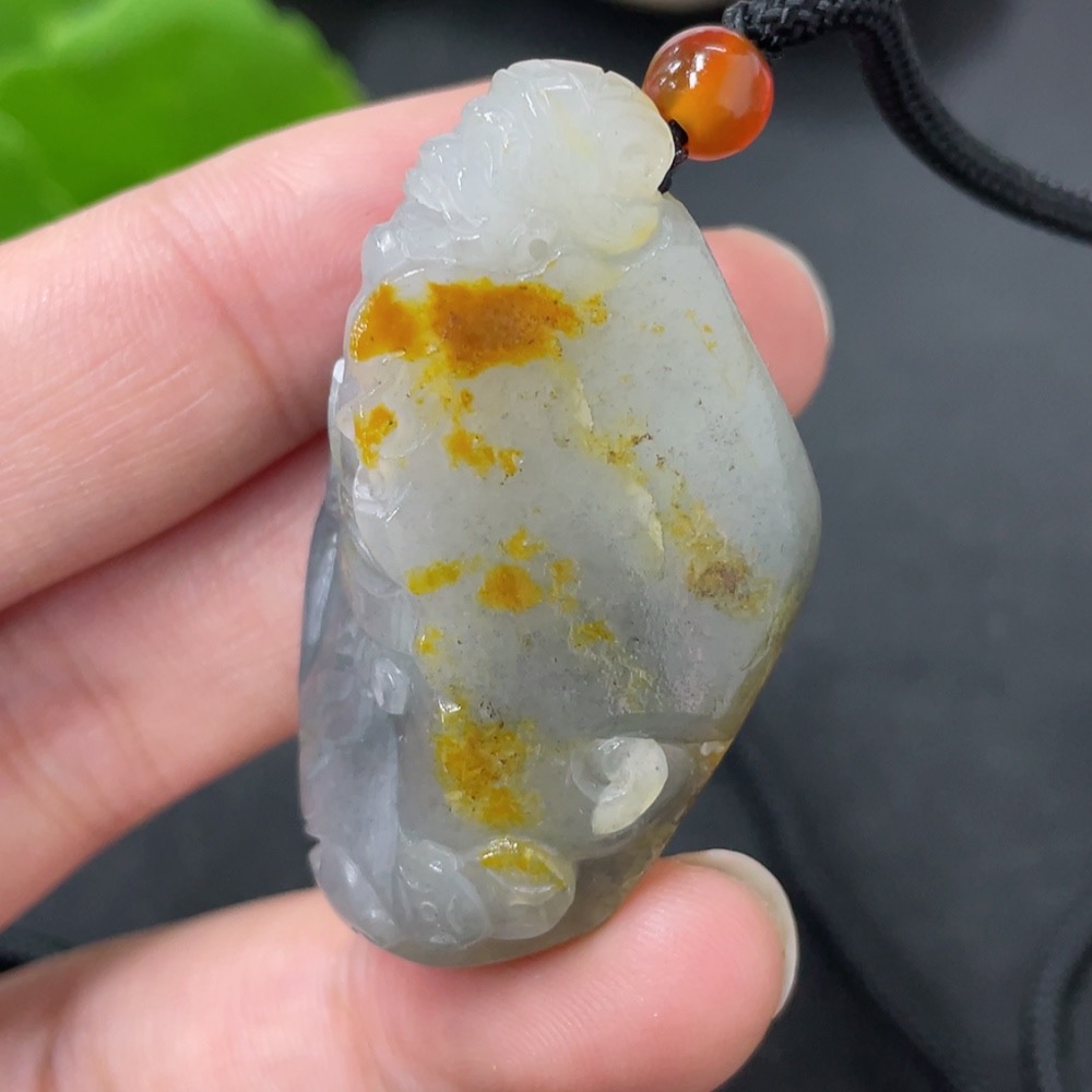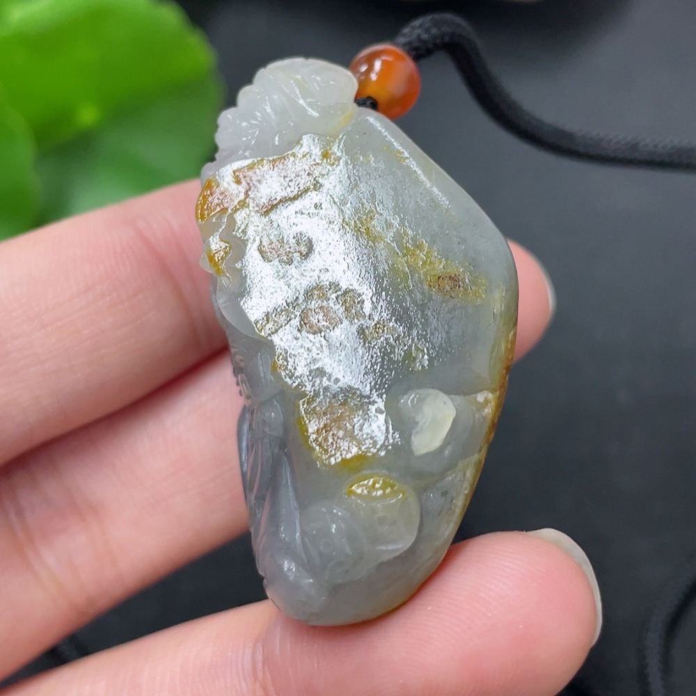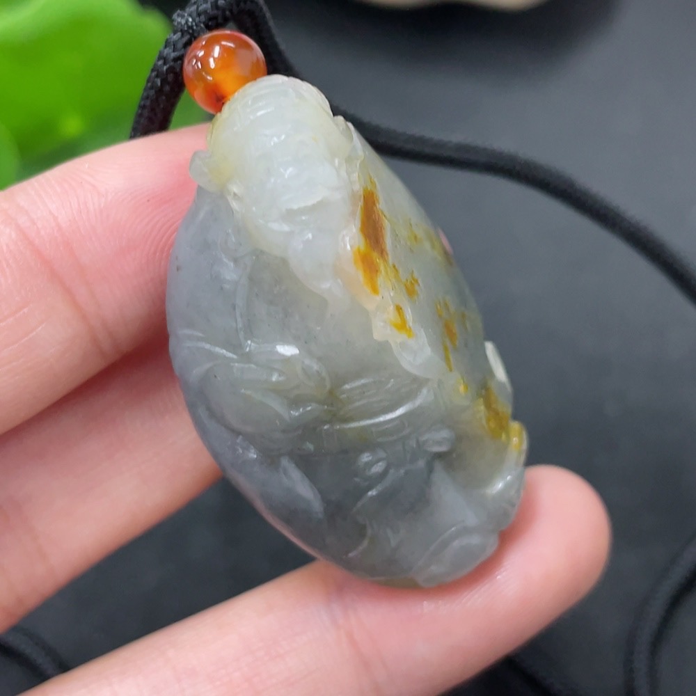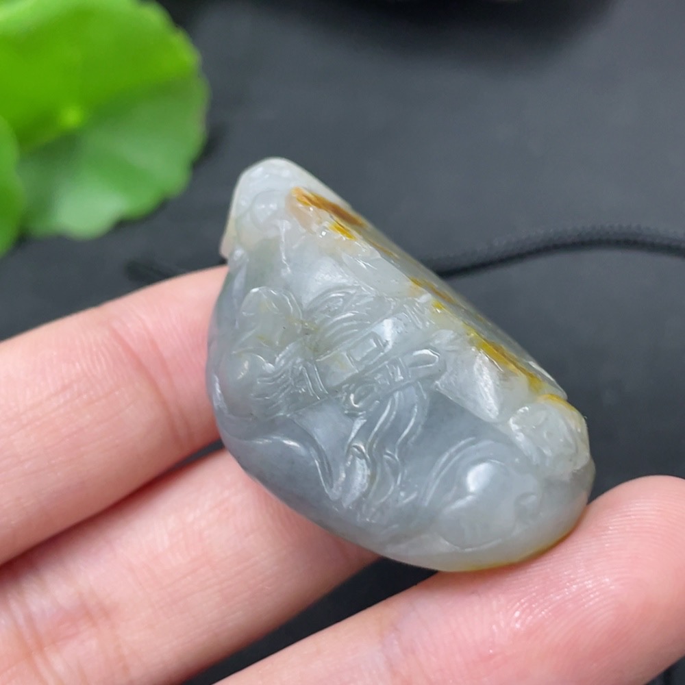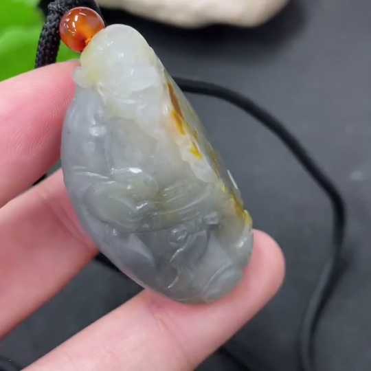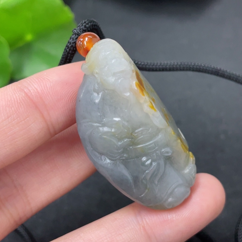 Hetian Jade Pendant - God of Wealth, Undetermined Skin Color Origin, Contains Other Mineral Components, Total Weight (Including Rope) Approx. 28.5g