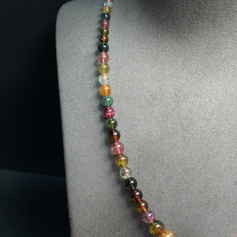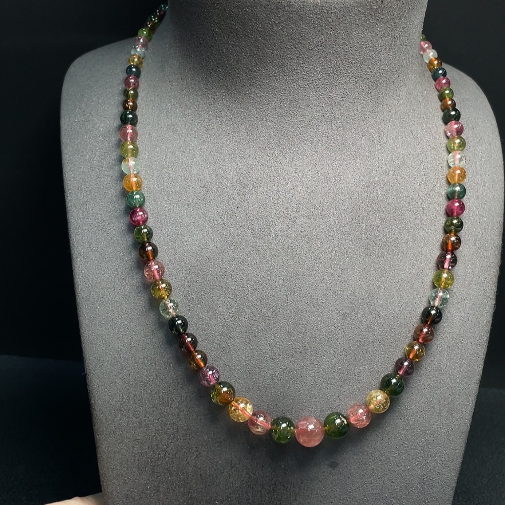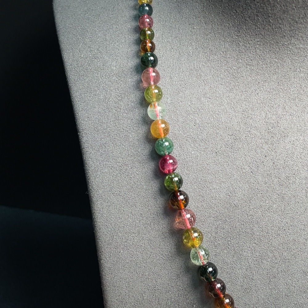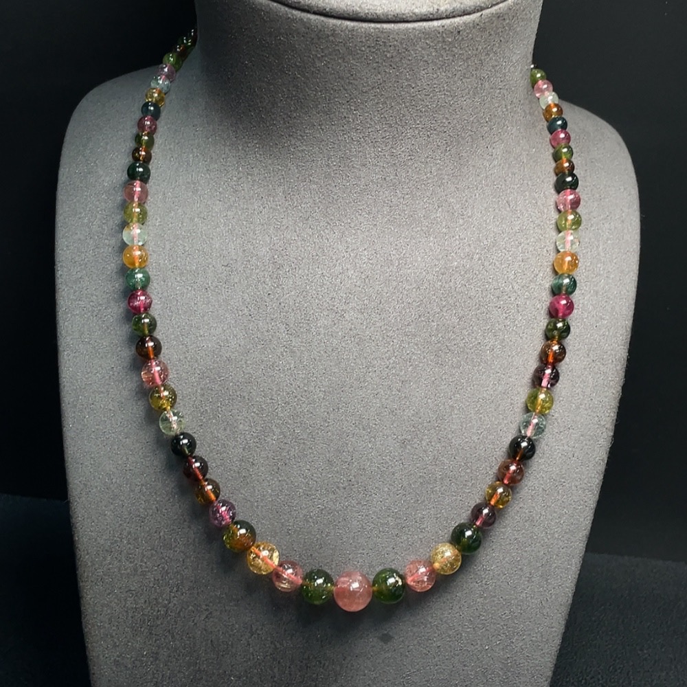 Tourmaline bead necklace containing other mineral components with visible organic matter, total weight approximately 37.18g, bead size 4.3-10.2mm, non-gold
