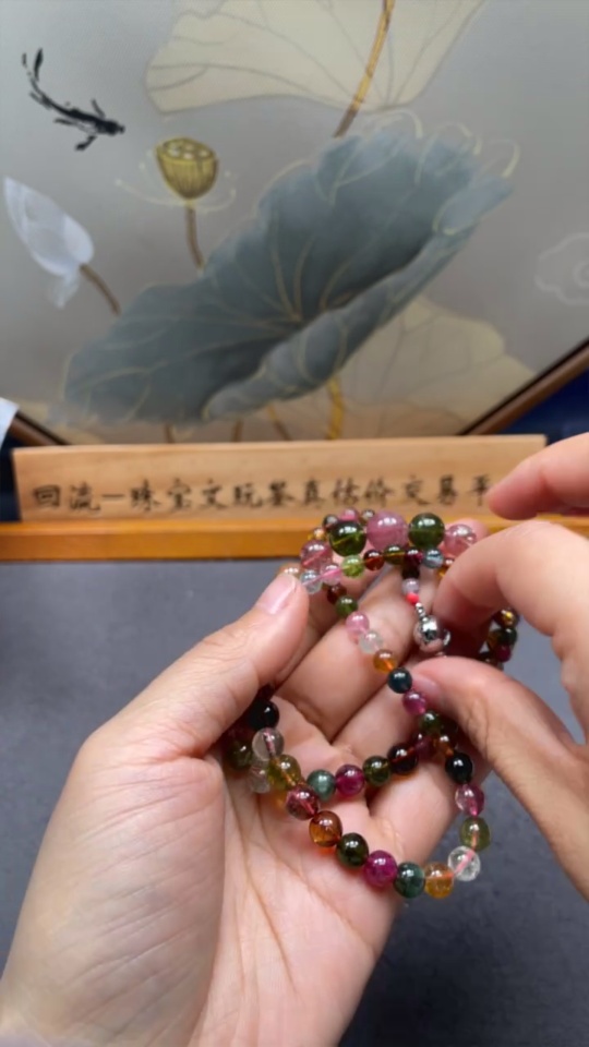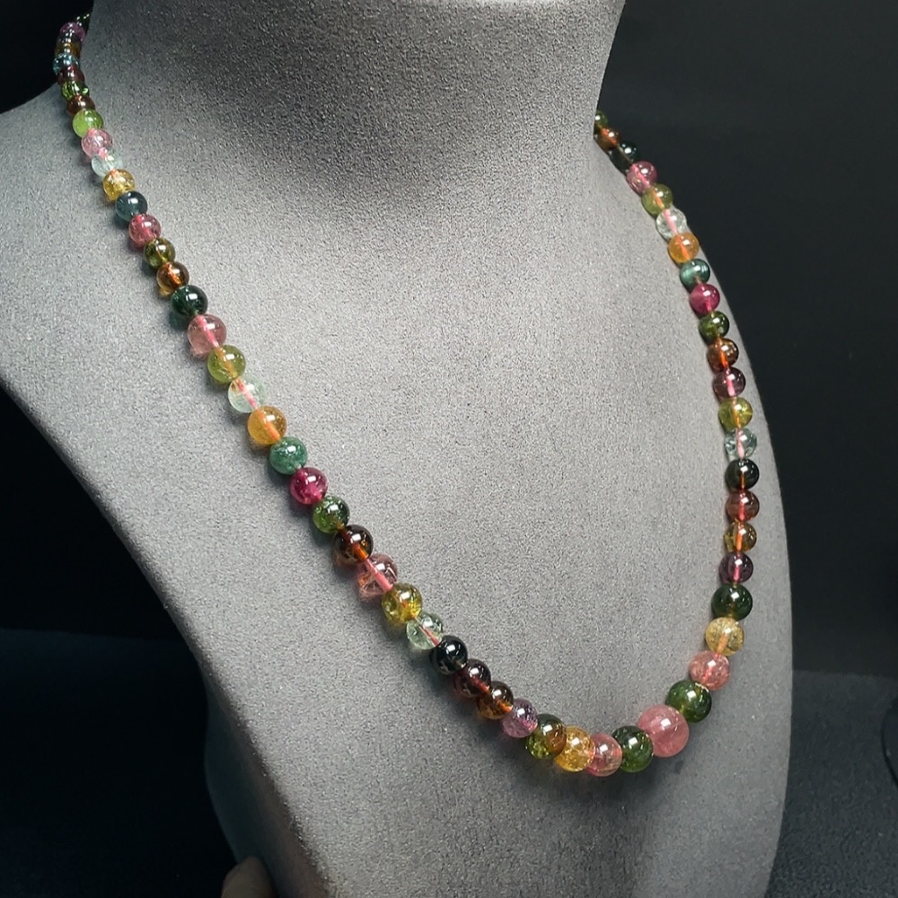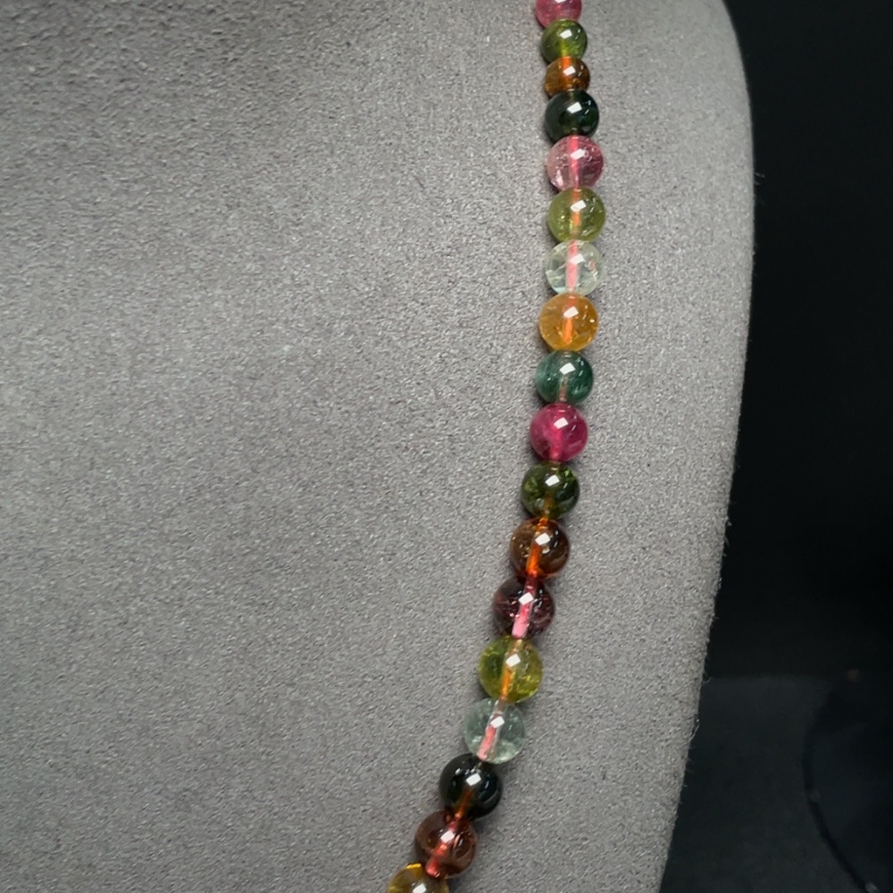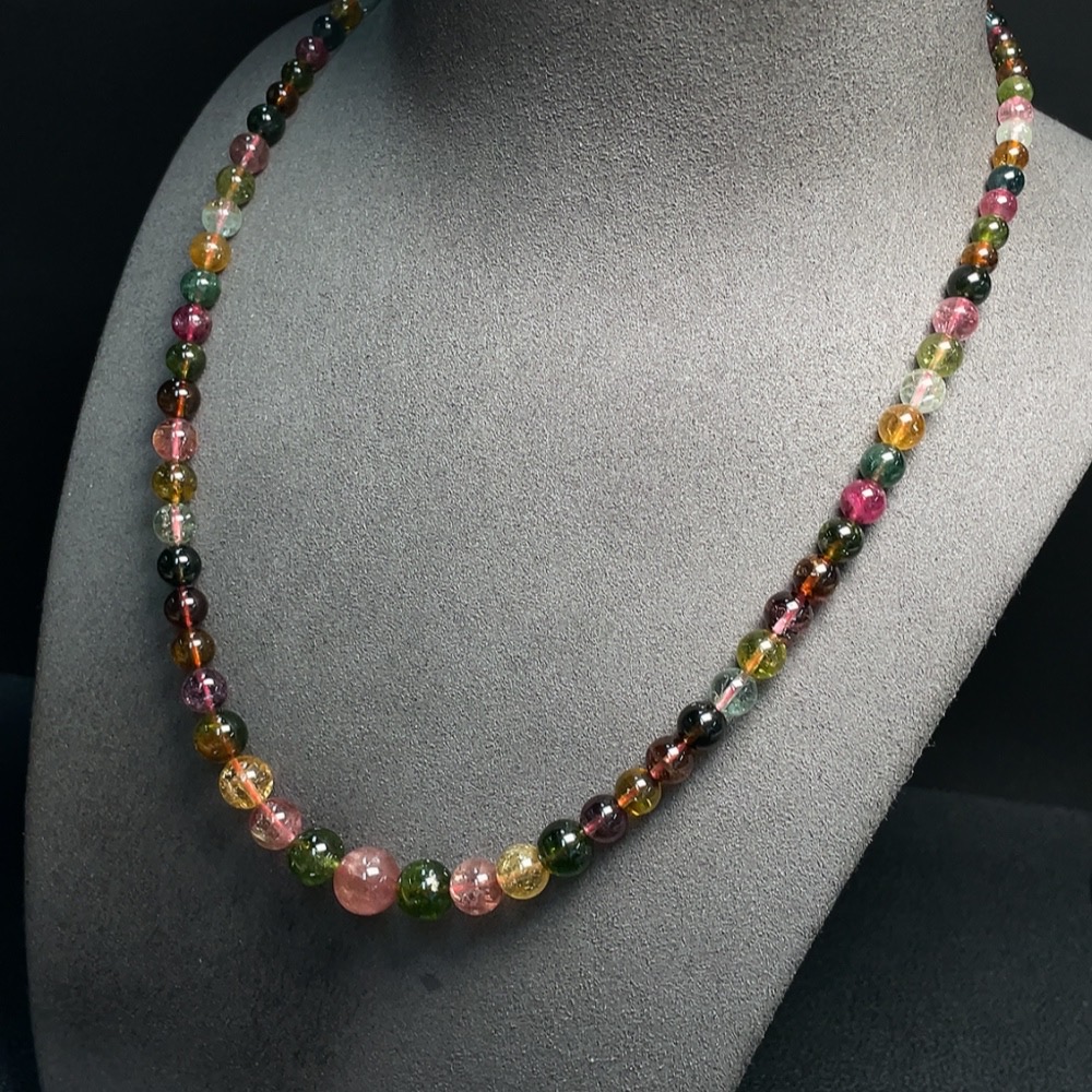 Tourmaline bead necklace containing other mineral components with visible organic matter, total weight approximately 37.18g, bead size 4.3-10.2mm, non-gold