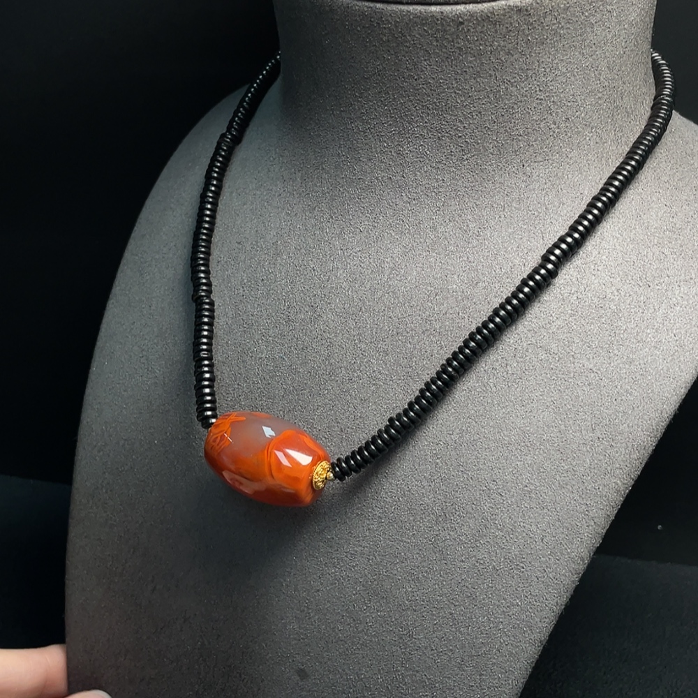 South Red Agate Bead Strand with Visible Organic Matter, Non-Natural Matching Chain (Non-Gold), Total Weight Approx. 28.85g Including Chain