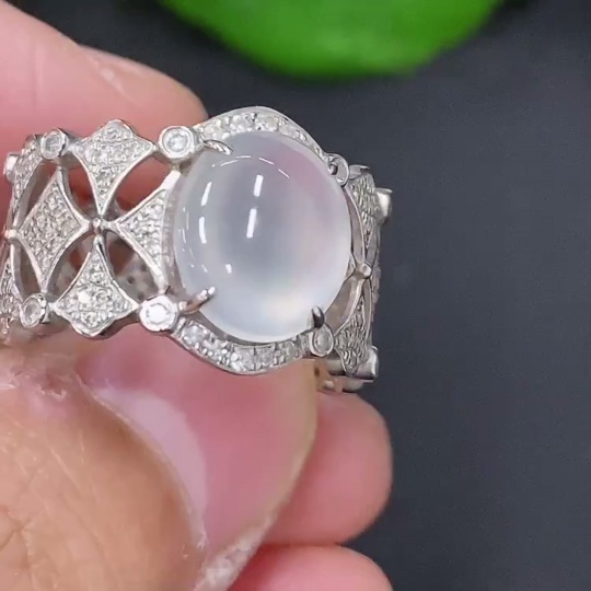 Jadeite Cabochon Inlaid Ring (No mark, Gold content tested Au75%) Size 14 Total weight approx. 5.3g (with diamond accents)