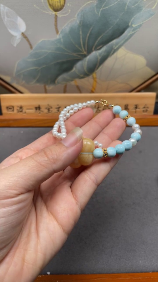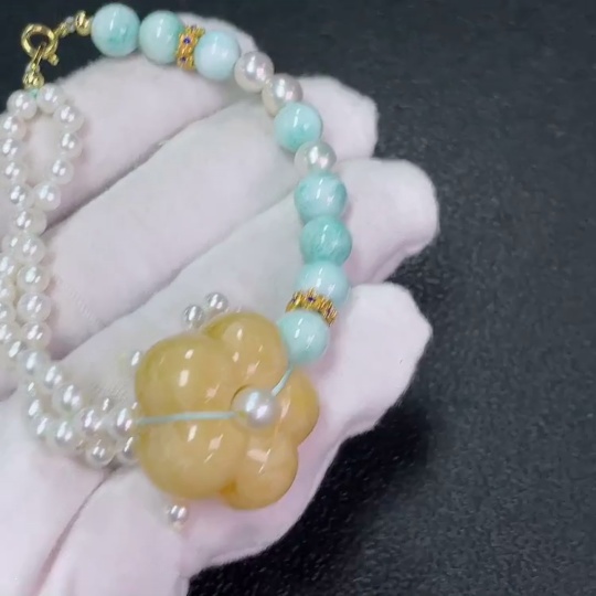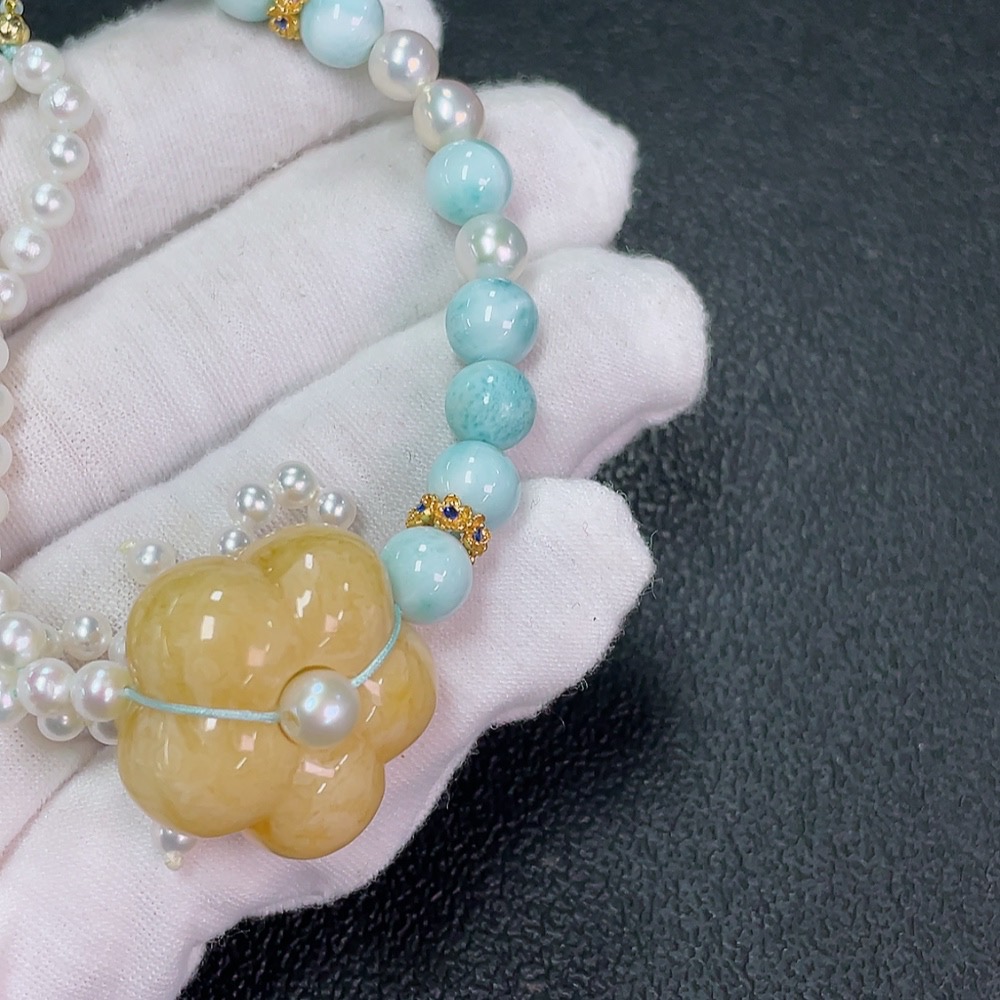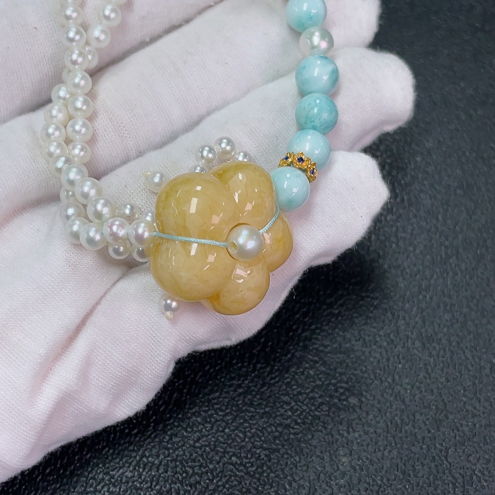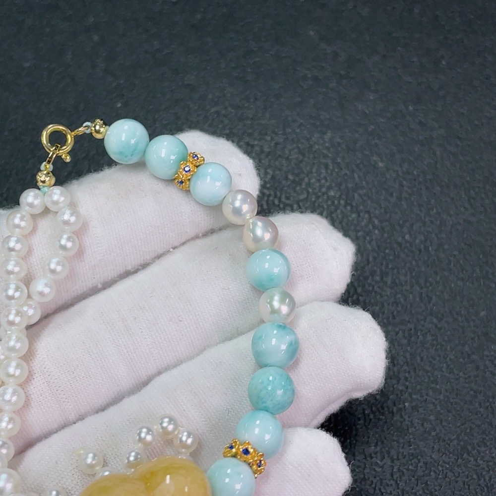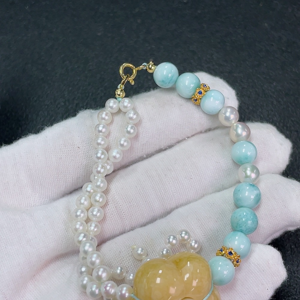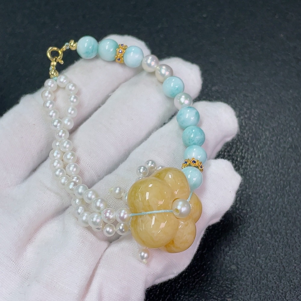 Amber Beeswax Bracelet with Larimar, Pearl, Non-Gold, Total Weight Approx. 17.5g, Size About 24mm