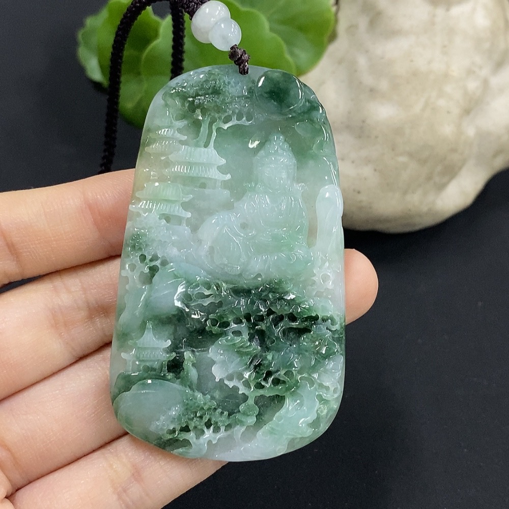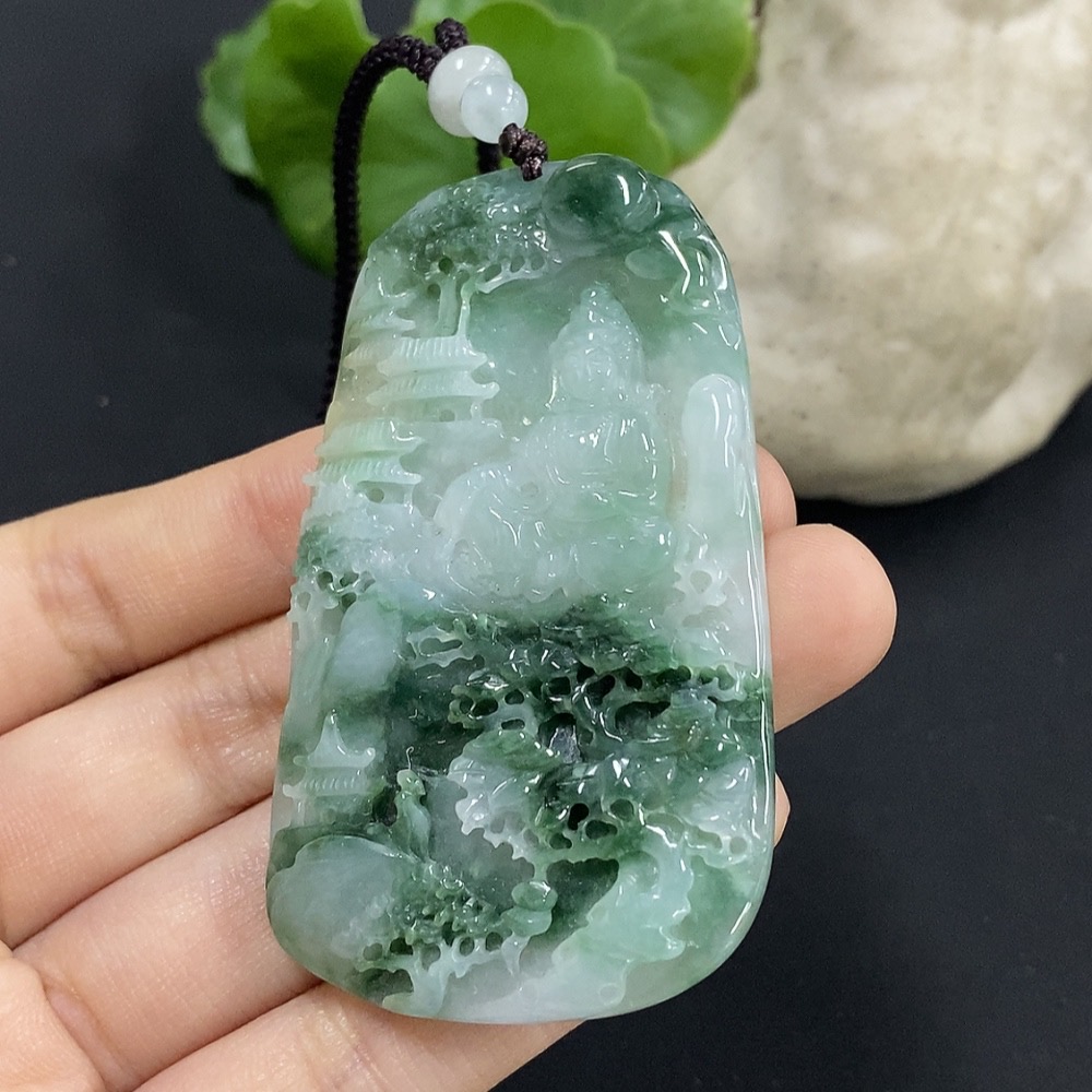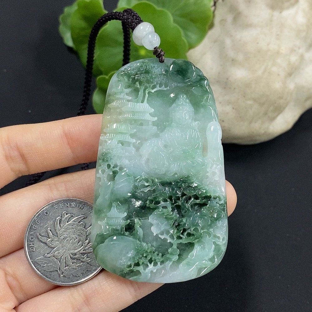 Jadeite Landscape Guanyin Pendant Total Weight Approx. 33.77g with Non-Grade A Beads