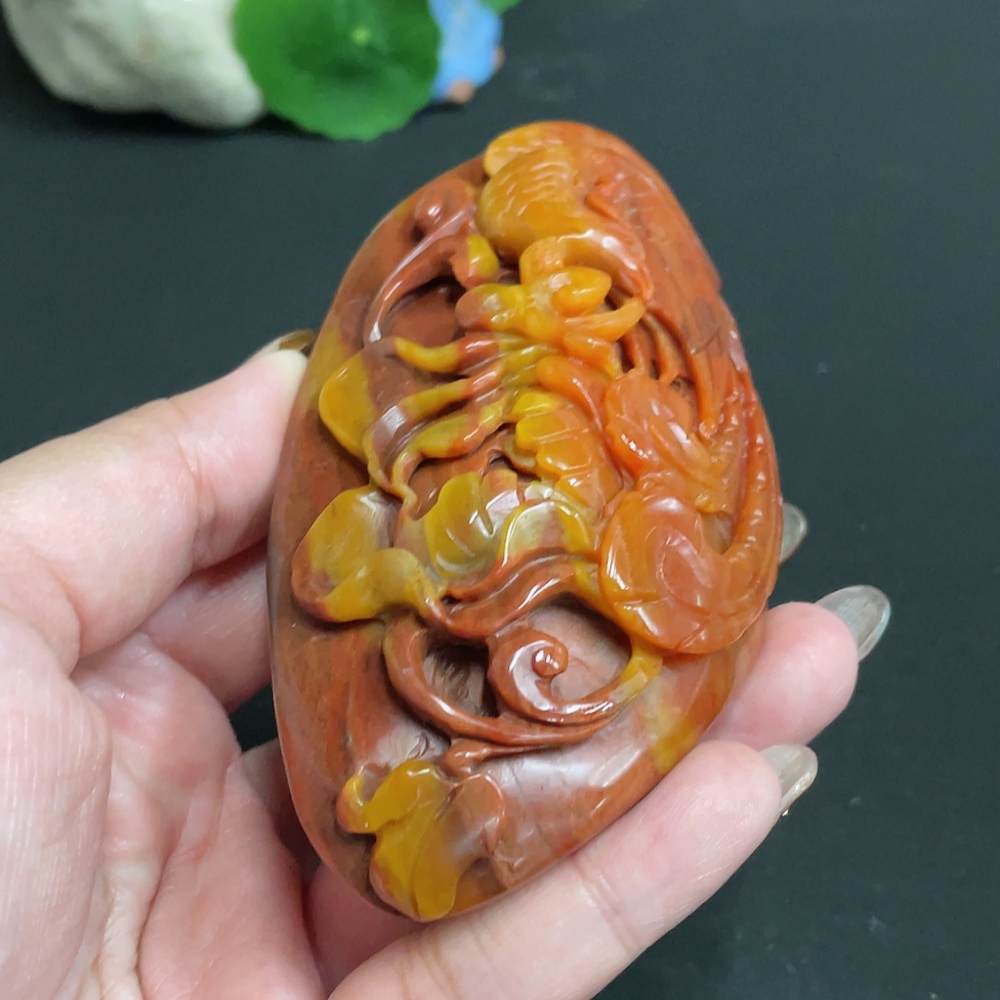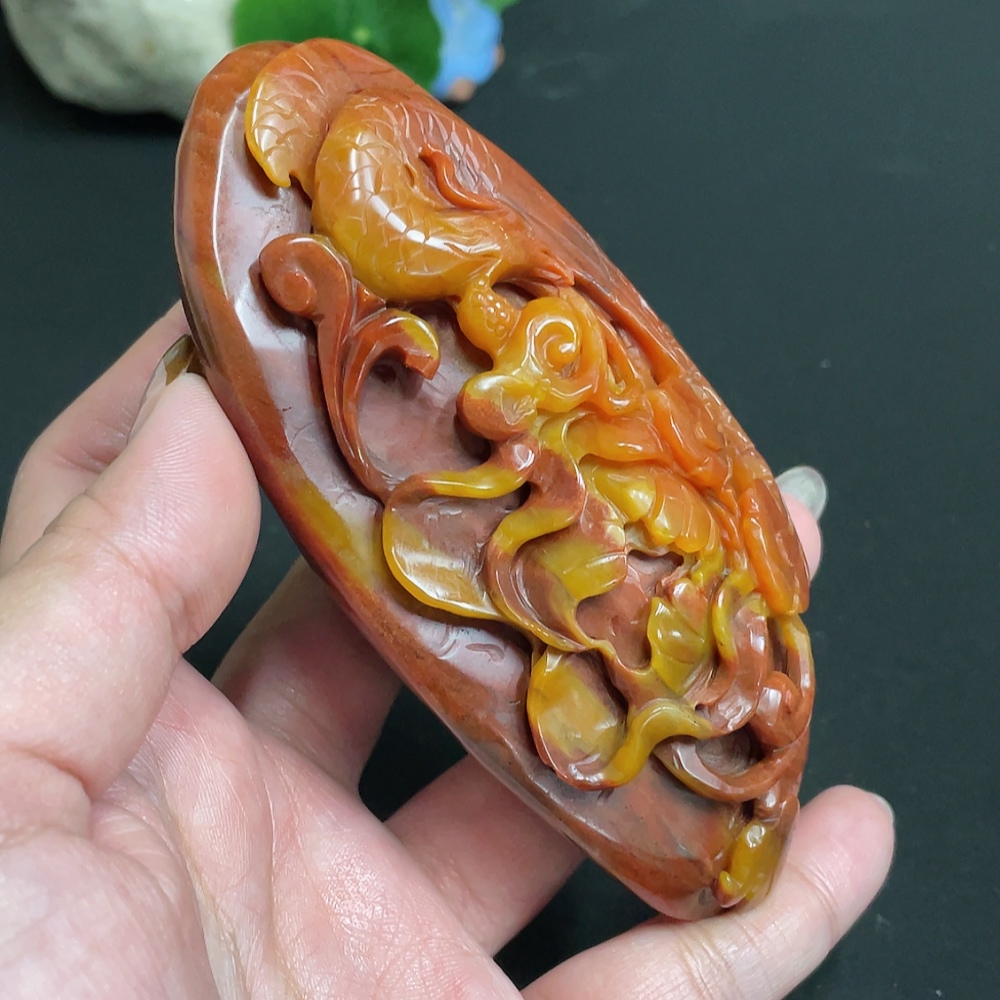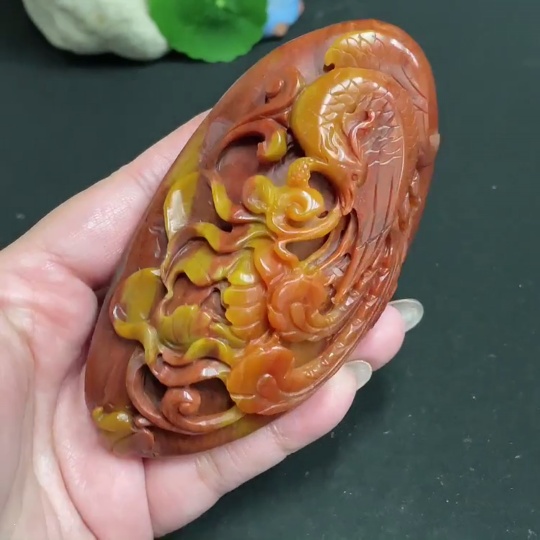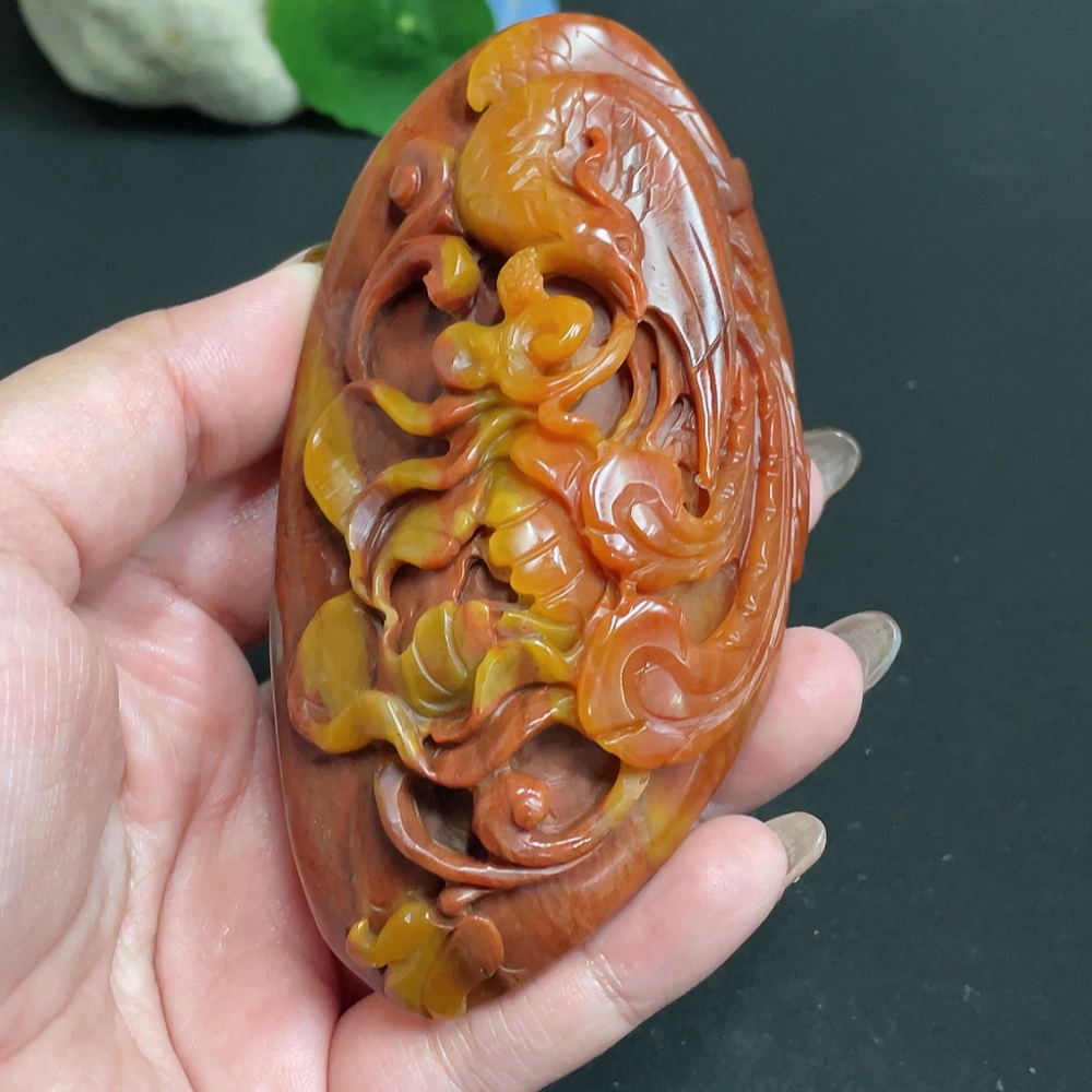 Huanglong Jade Hand Piece - Phoenix and Peony Design, Total Weight Approx. 291.9g