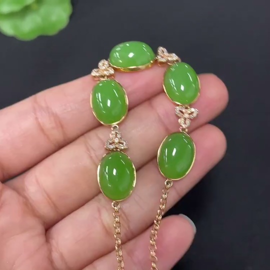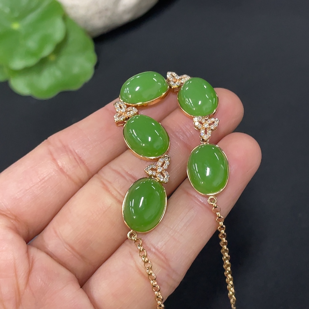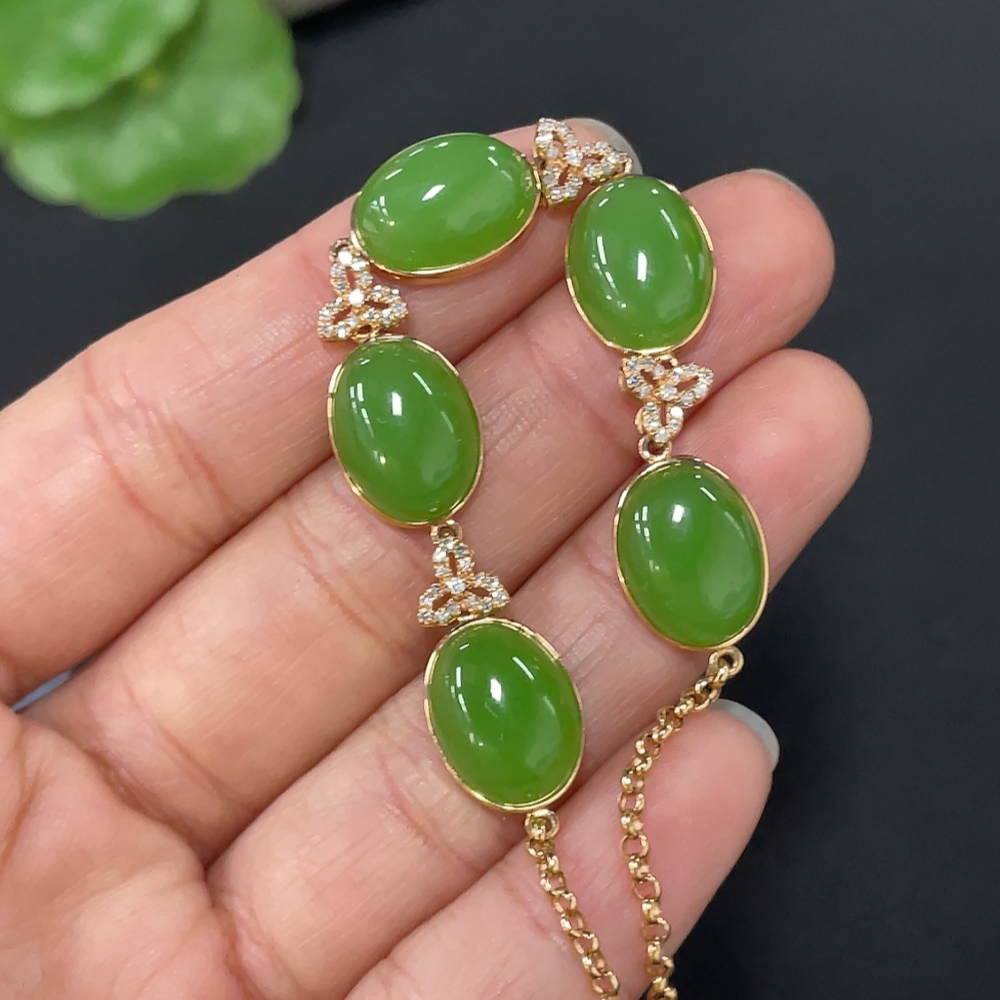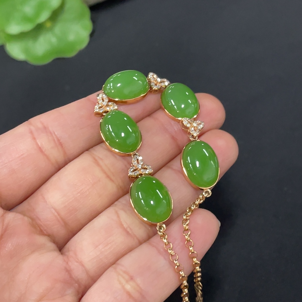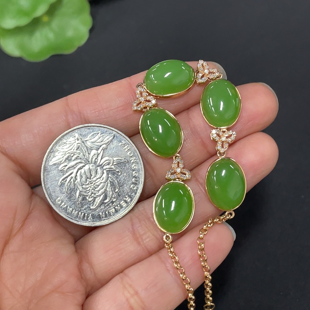 Hetian Jade cabochon inlay bracelet (suspected gold-plated parts marked in red, the rest in 18k gold, total weight approx. 8.3g, accented with diamonds)