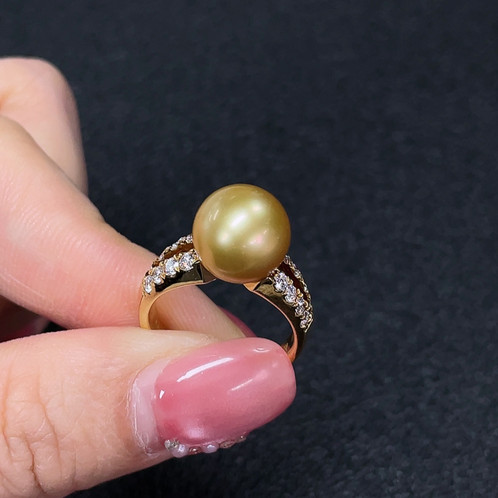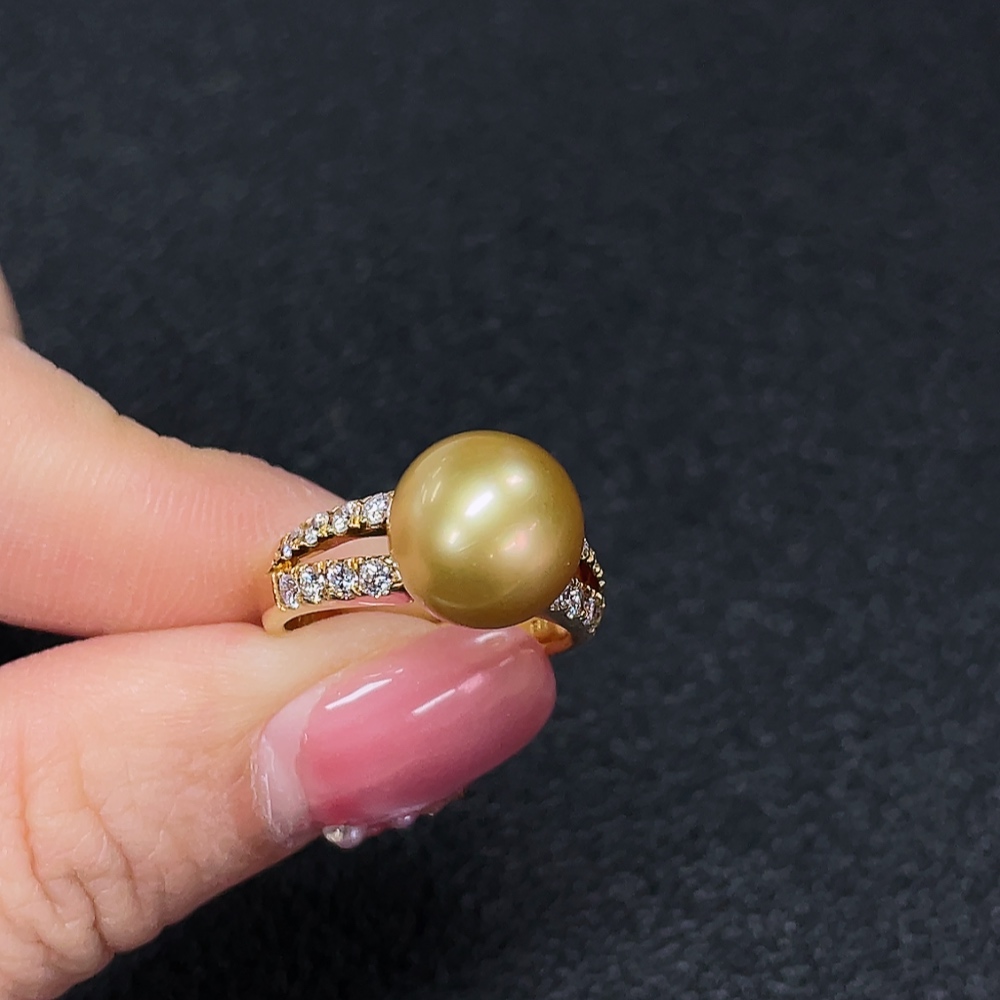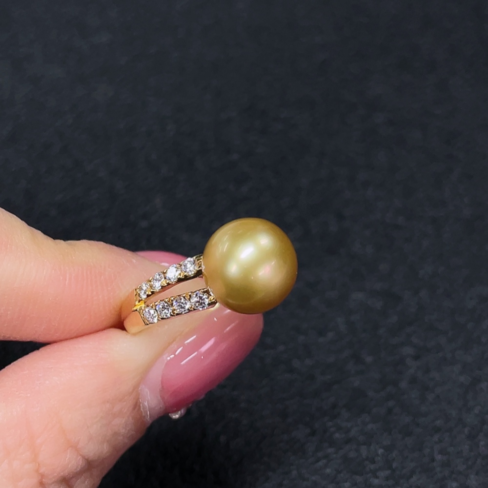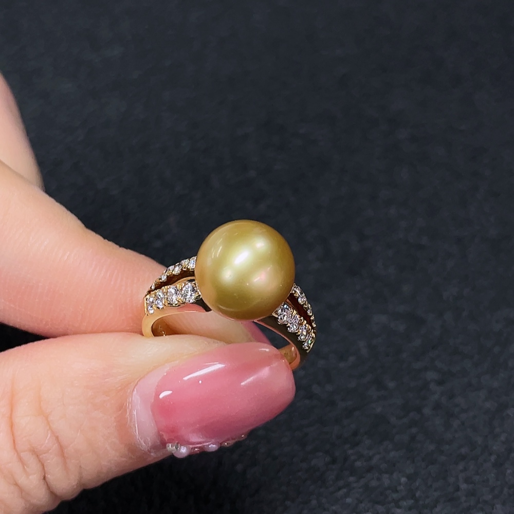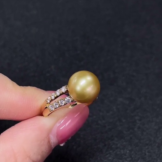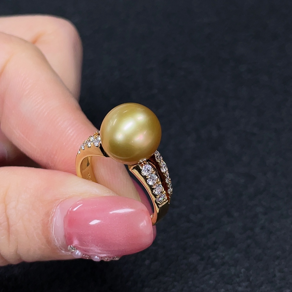 18K South Sea Pearl Ring with Undetermined Color Origin and Diamond Accents, Total Weight Approximately 5.87g, Size 12, Stone Measures About 10.4mm