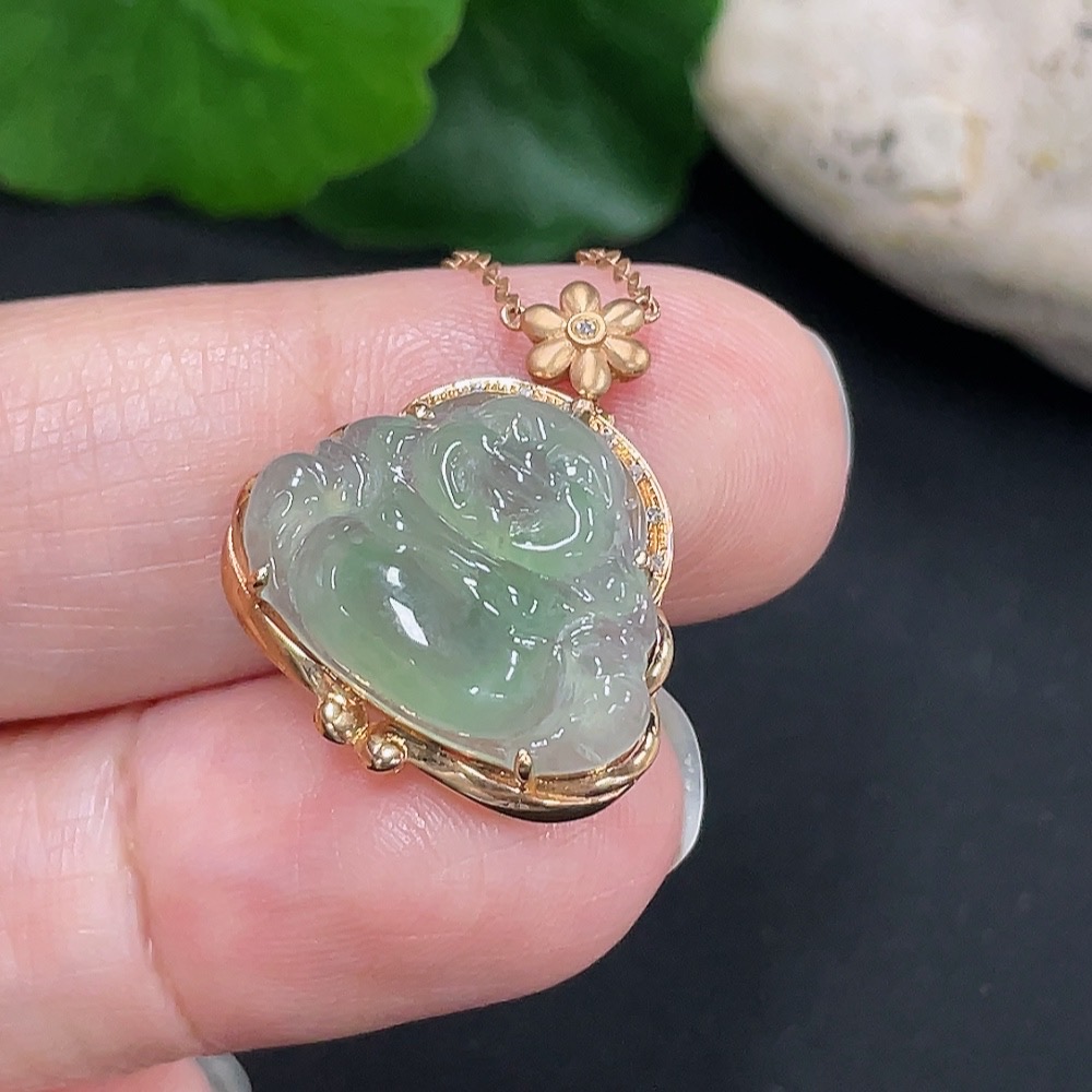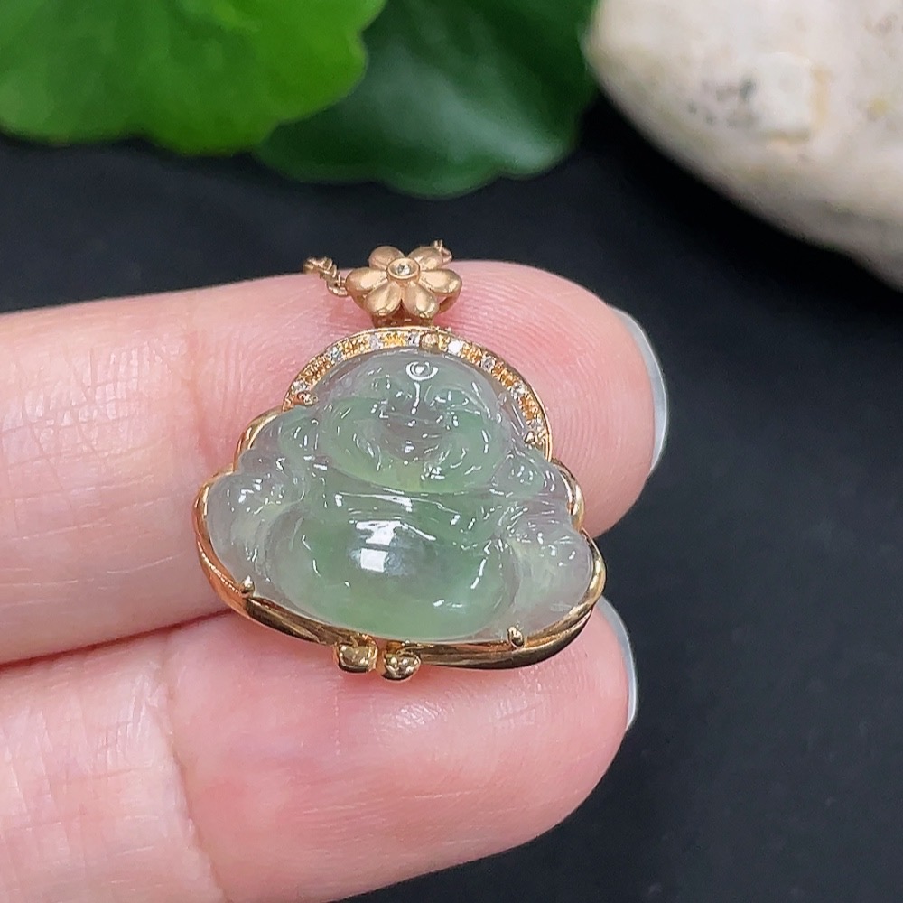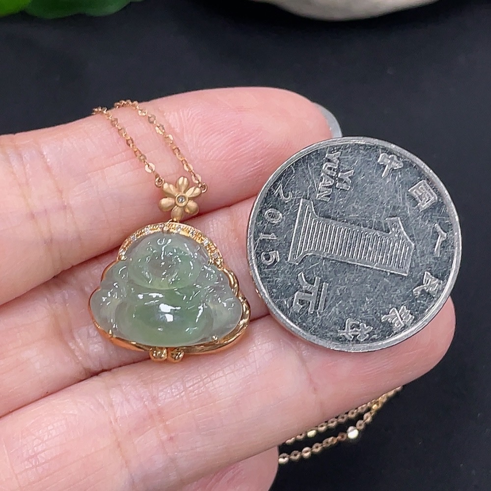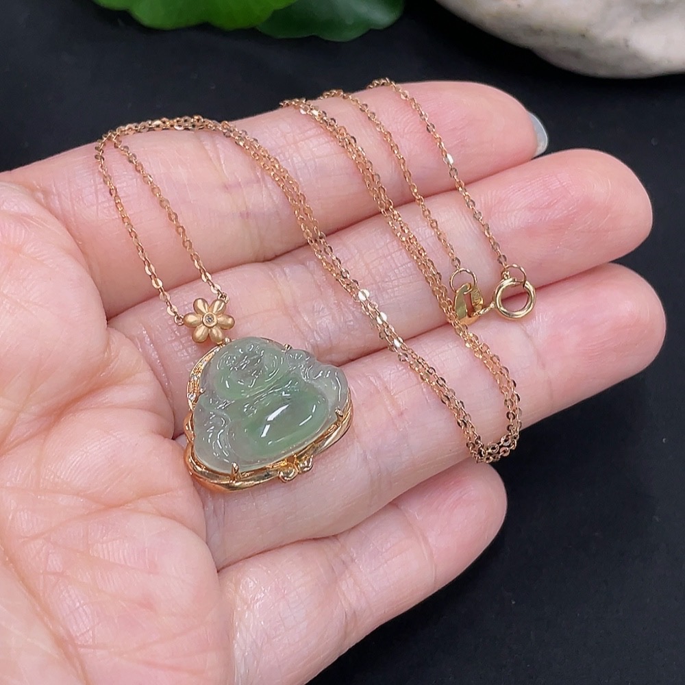 Jadeite Buddha Pendant 18K Gold Total Weight Approx. 3g with Diamond Accent Single Non-Diamond Stone Including Chain