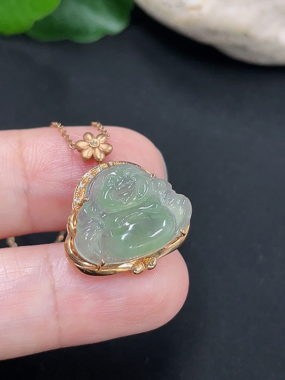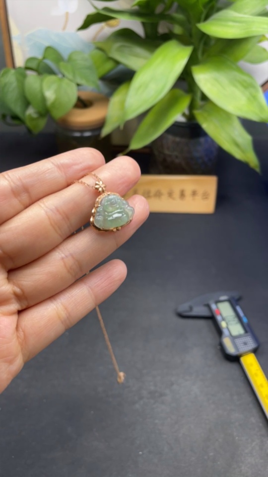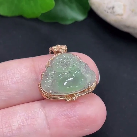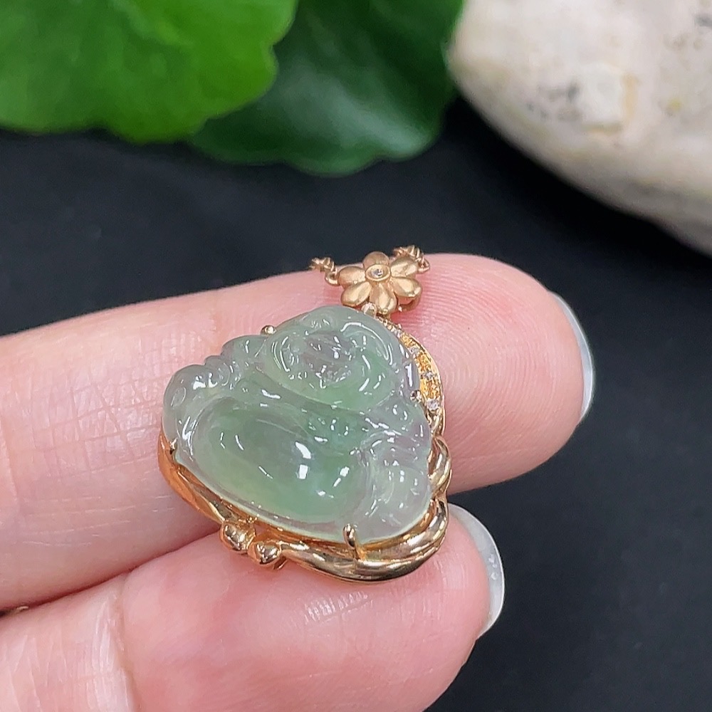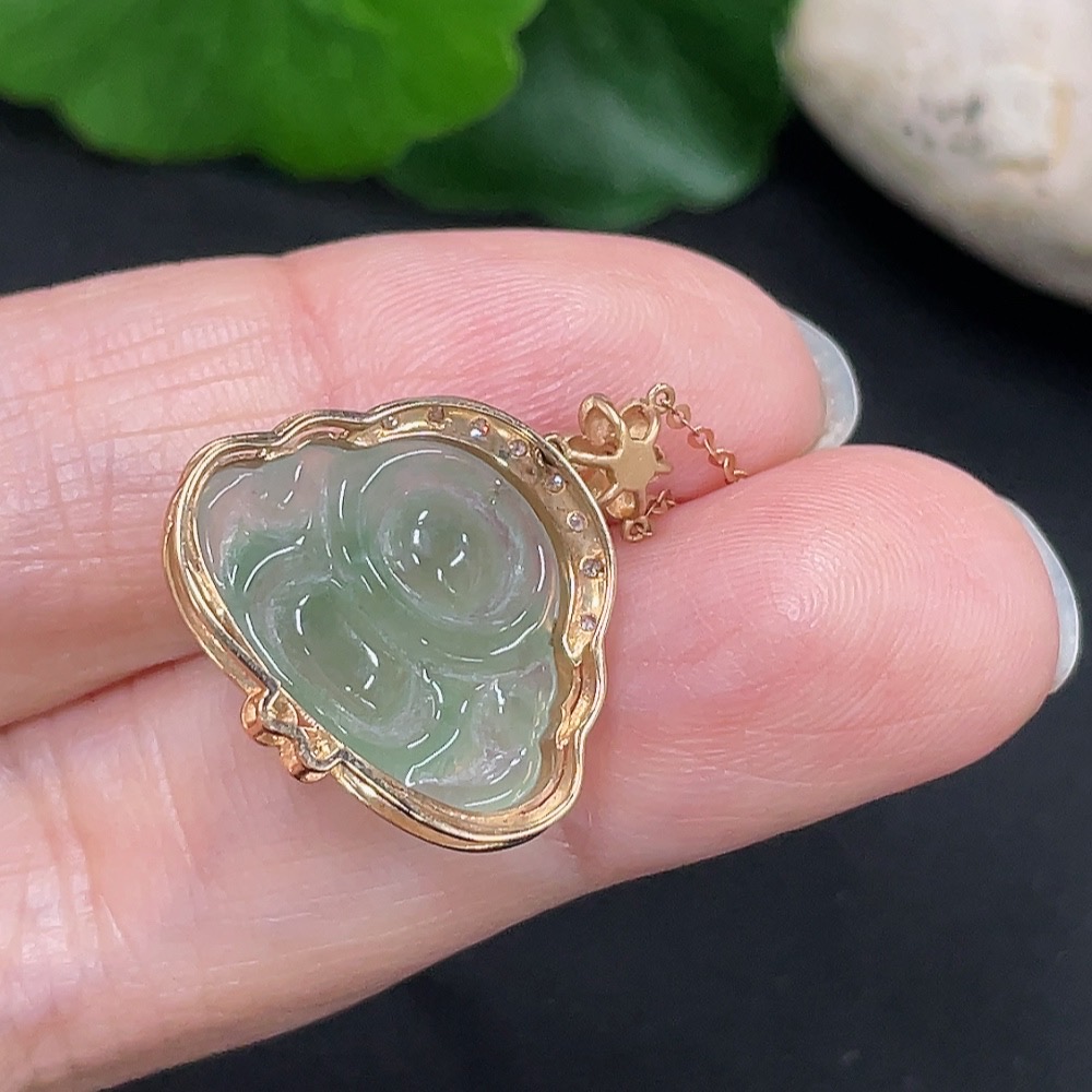 Jadeite Buddha Pendant 18K Gold Total Weight Approx. 3g with Diamond Accent Single Non-Diamond Stone Including Chain