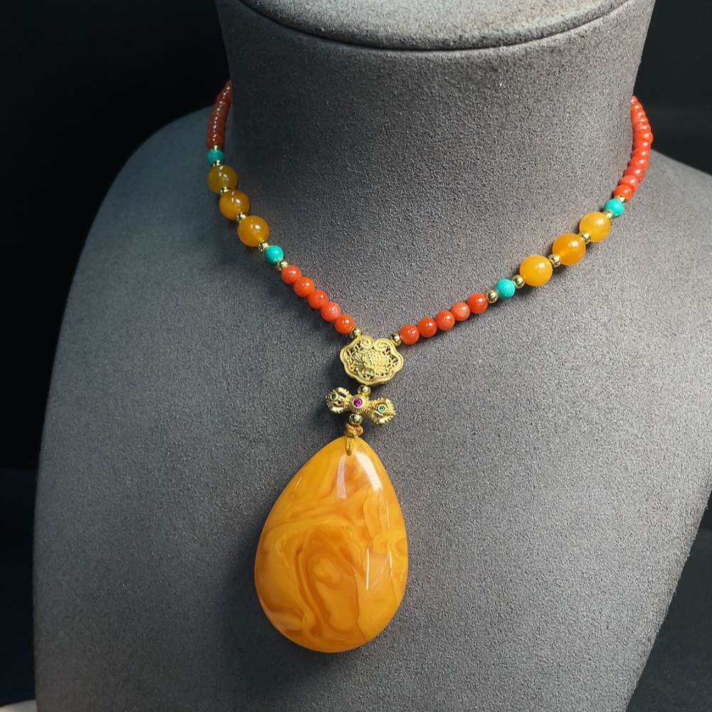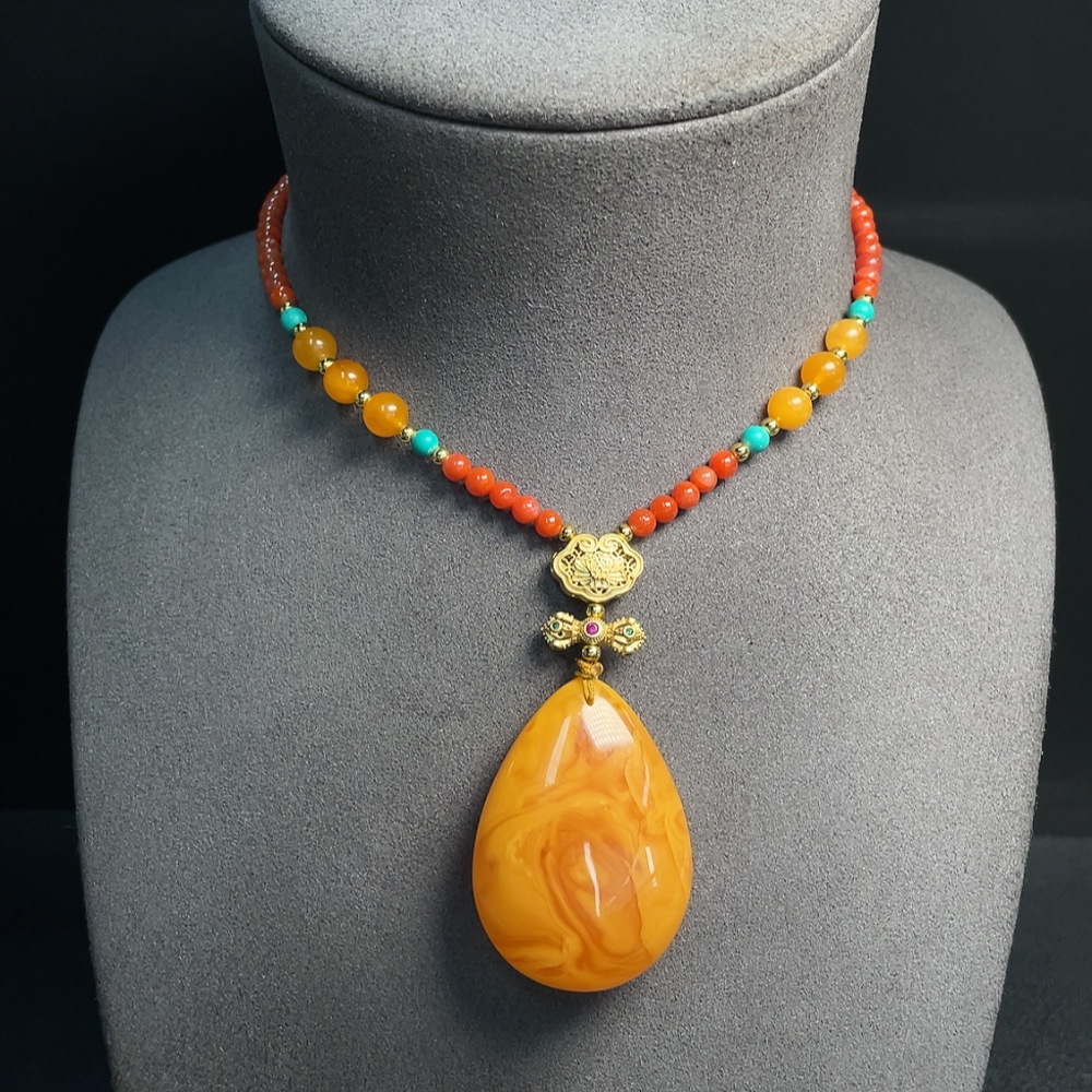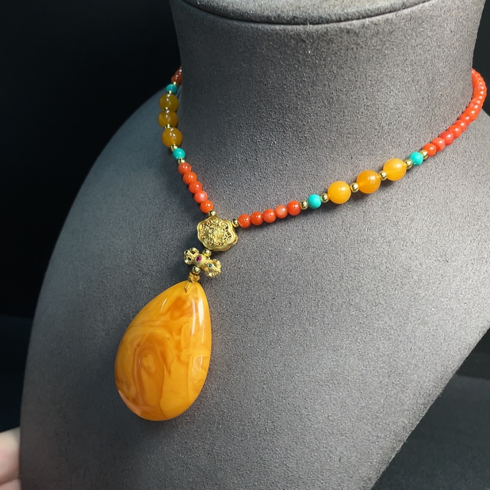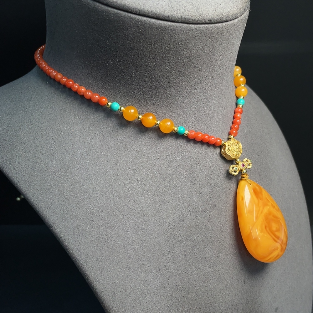 Amber beeswax pendant (color origin undetermined) with southern red agate, non-gold, stones may be non-natural, total weight approx. 26.97g including chain