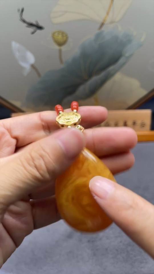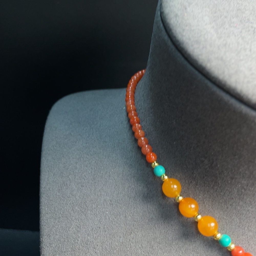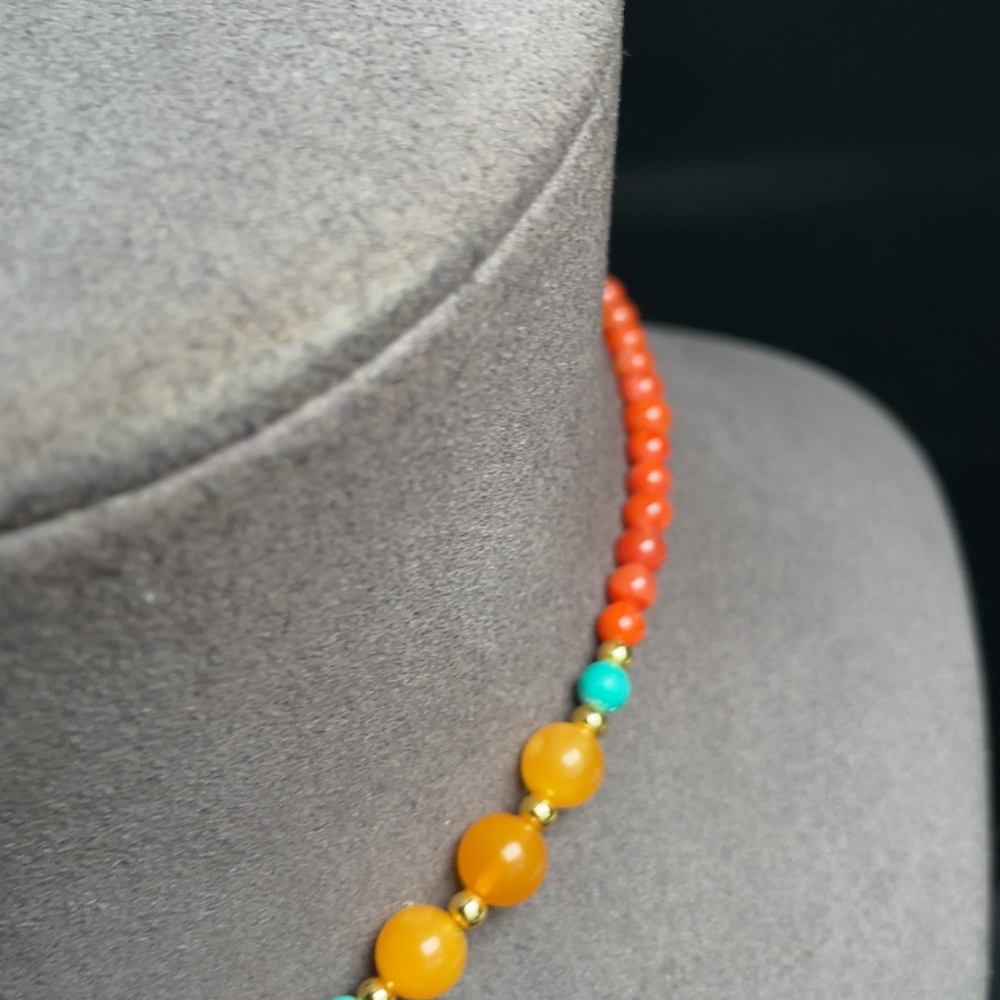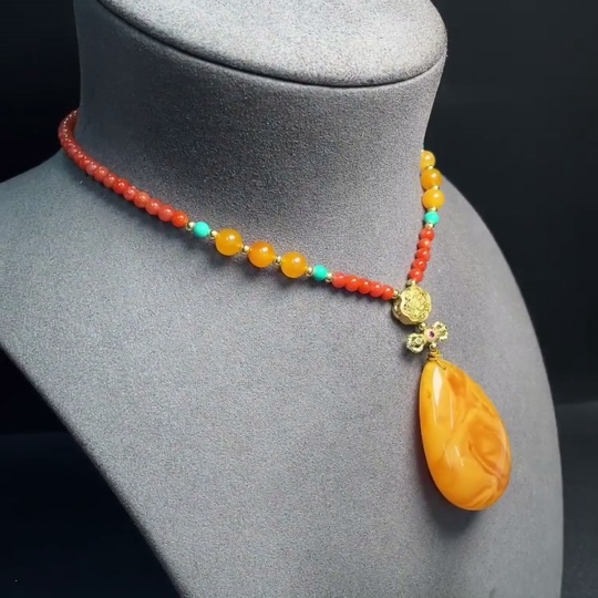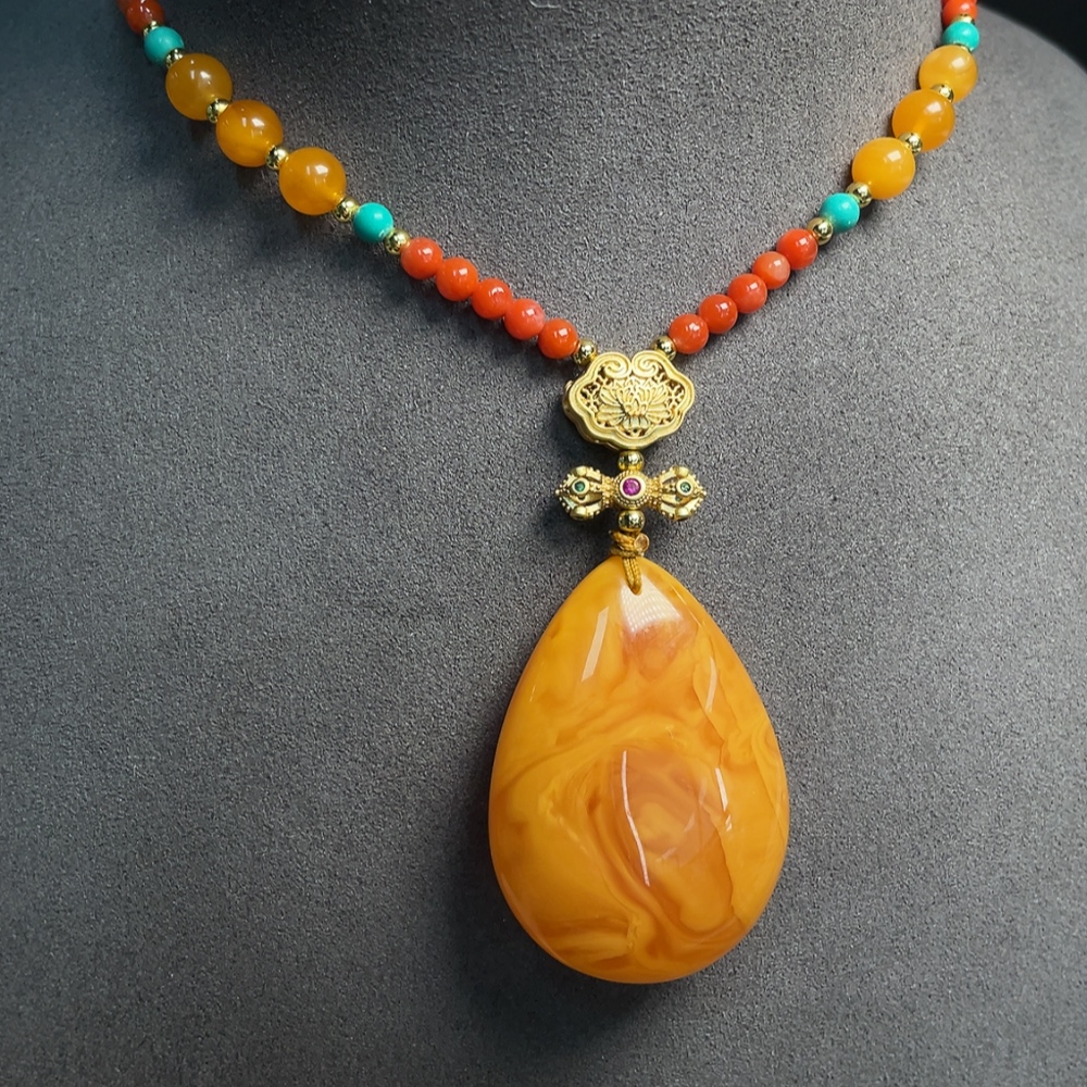 Amber beeswax pendant (color origin undetermined) with southern red agate, non-gold, stones may be non-natural, total weight approx. 26.97g including chain