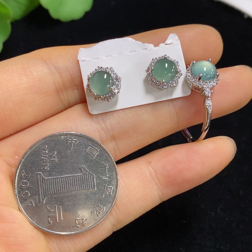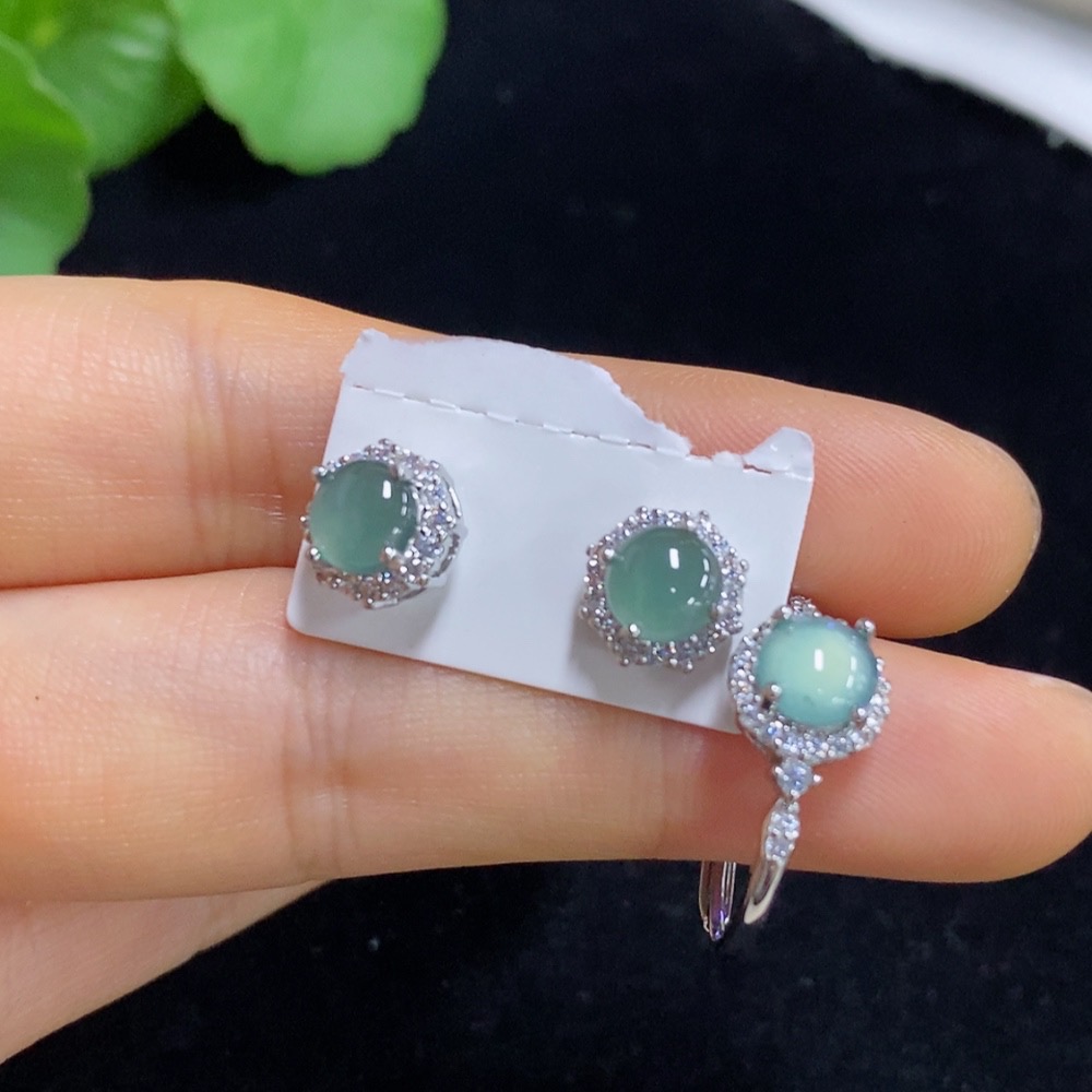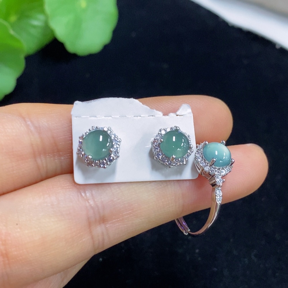 Jadeite Inlaid Earrings/Ring Non-Gold Adjustable
