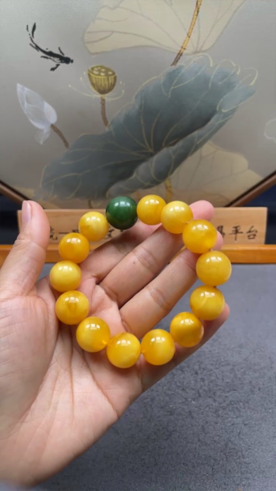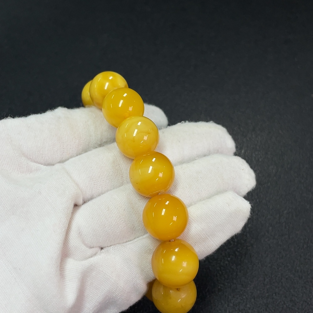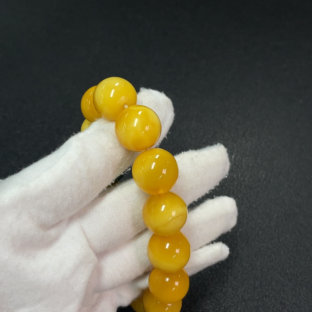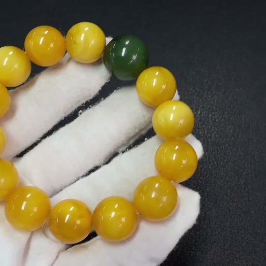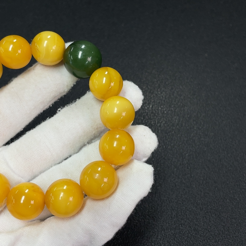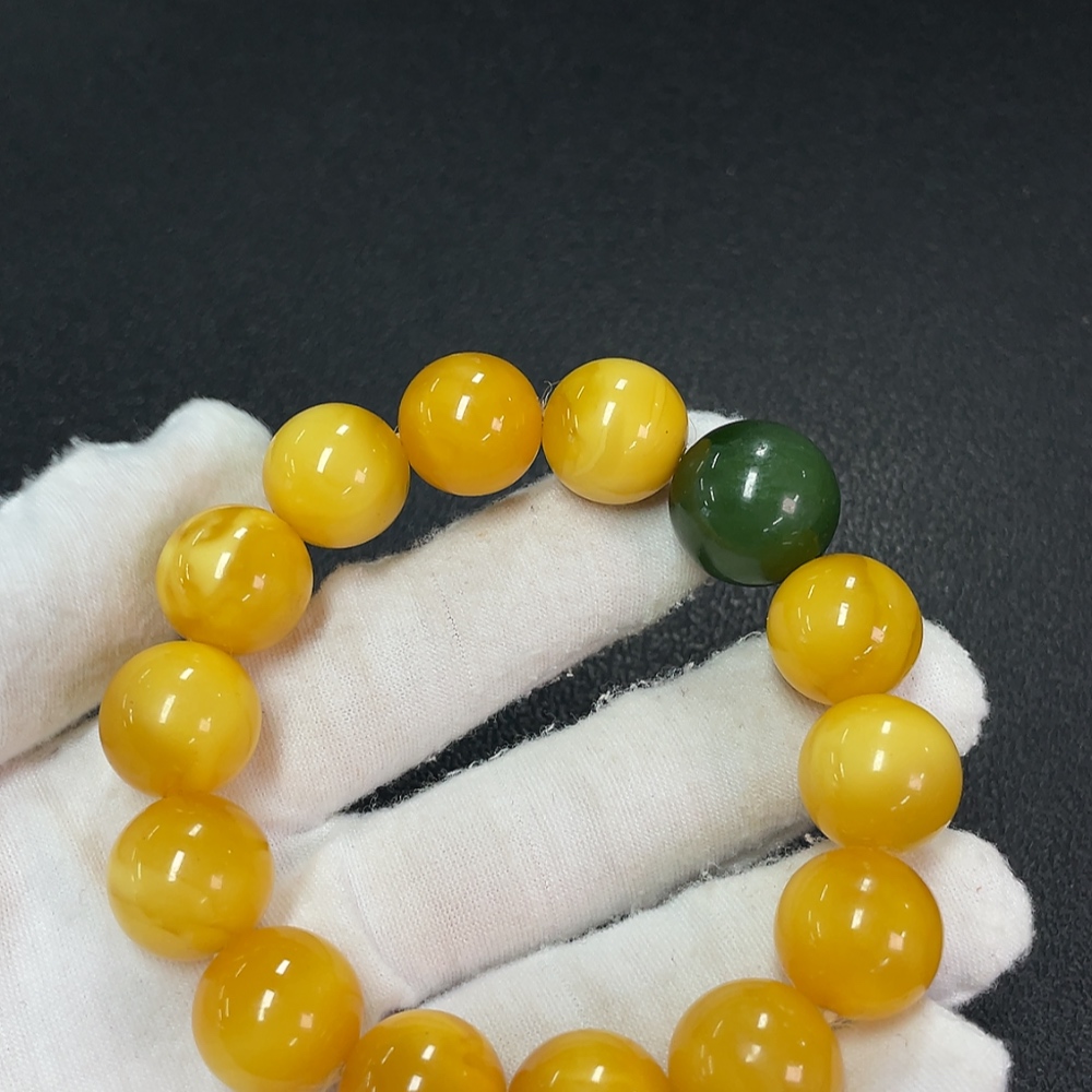 Amber Beeswax Bracelet with Hetian Jade, Partial Repair, Total Weight Approx. 34.16g, Size About 15mm