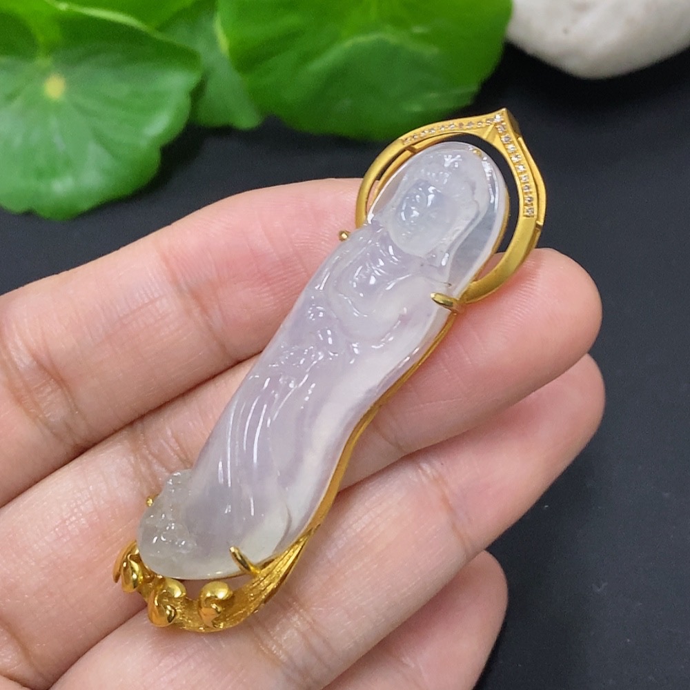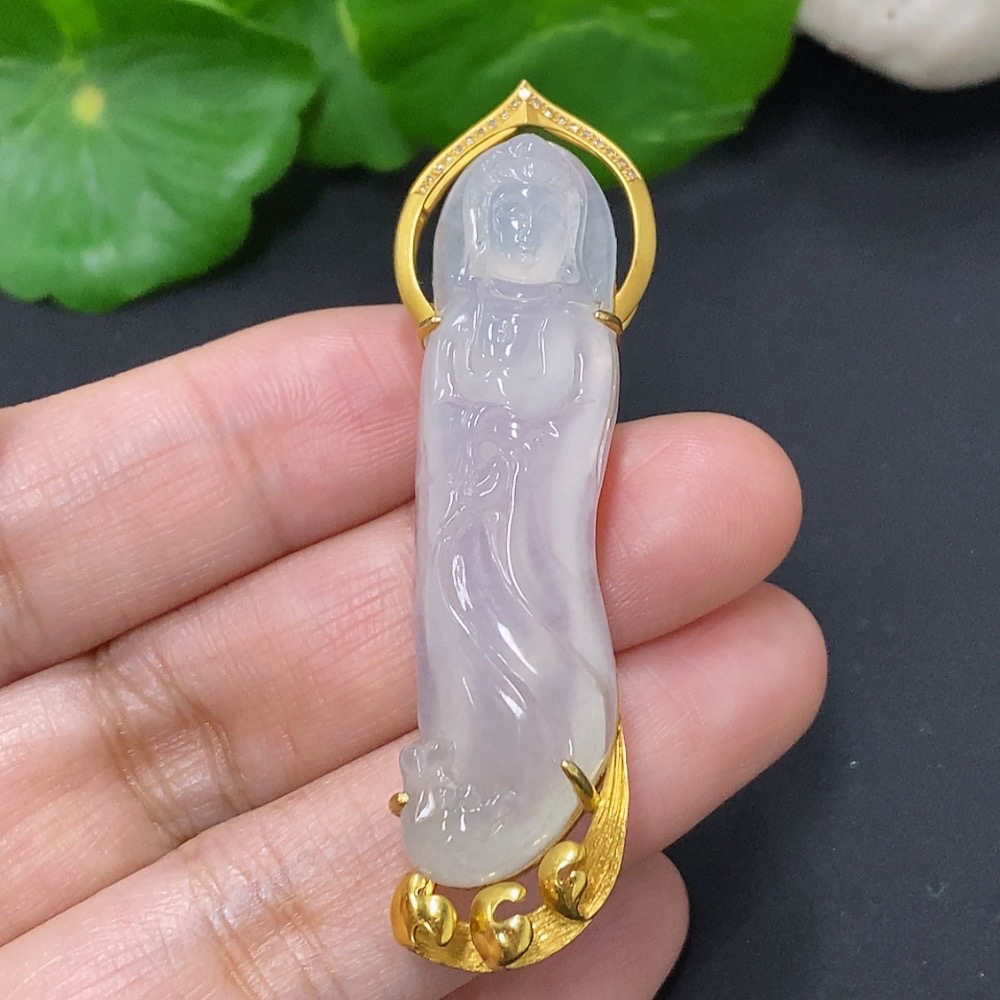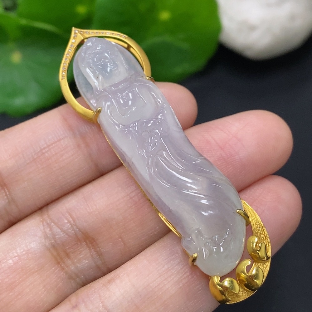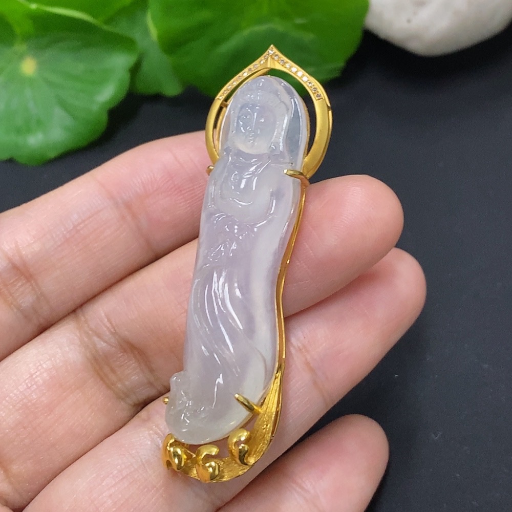 Jadeite Guanyin Pendant 18k Gold Total Weight Approx. 11.3g with Diamond Accents