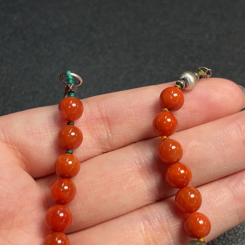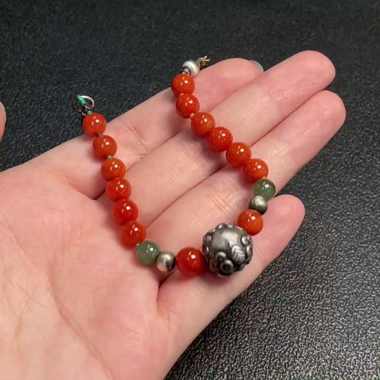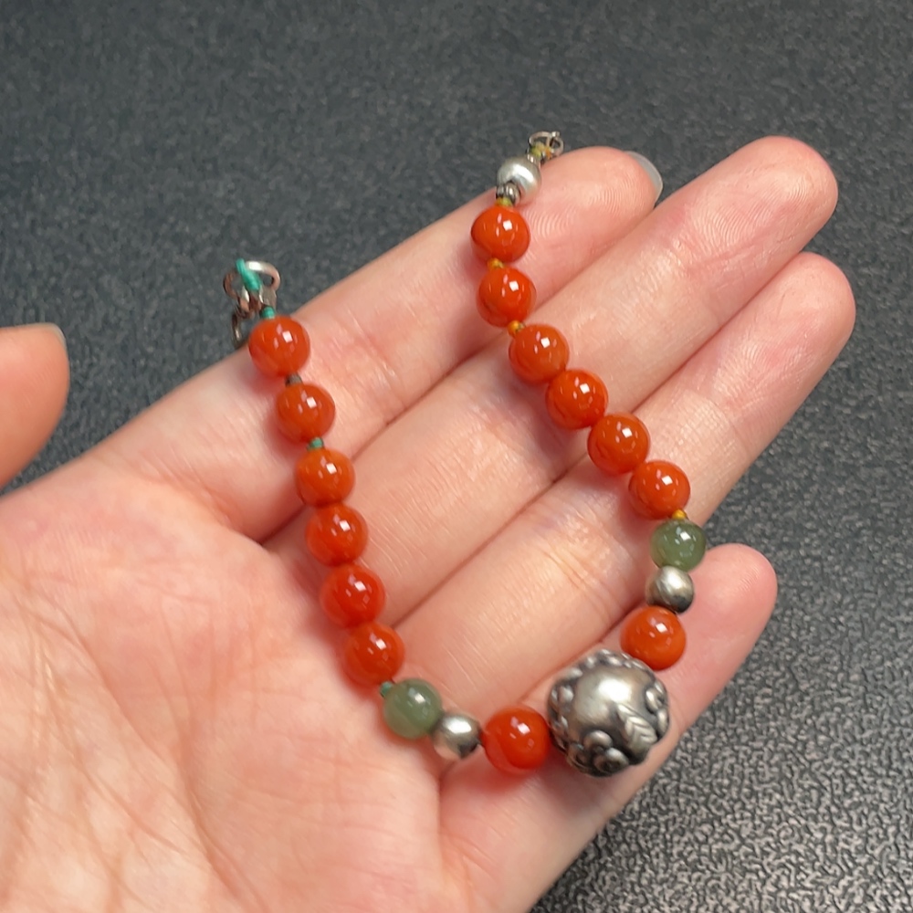 South Red Agate Bracelet with Visible Organic Matter, Paired with Jadeite, Non-Gold, Total Weight Approximately 8.31g, Size About 6.4mm