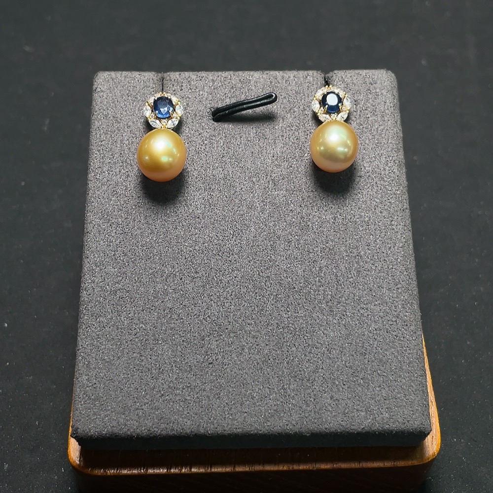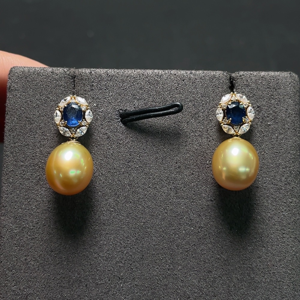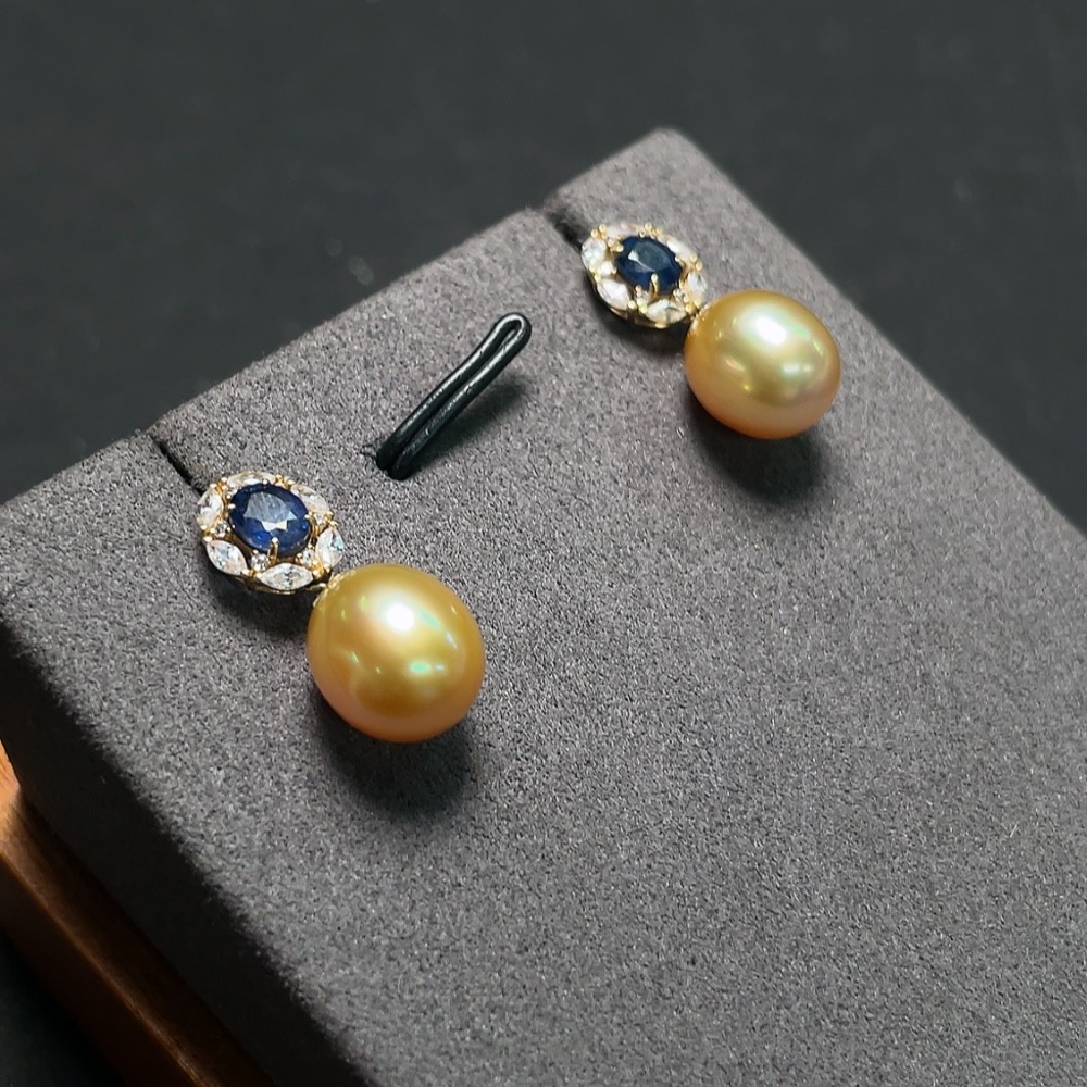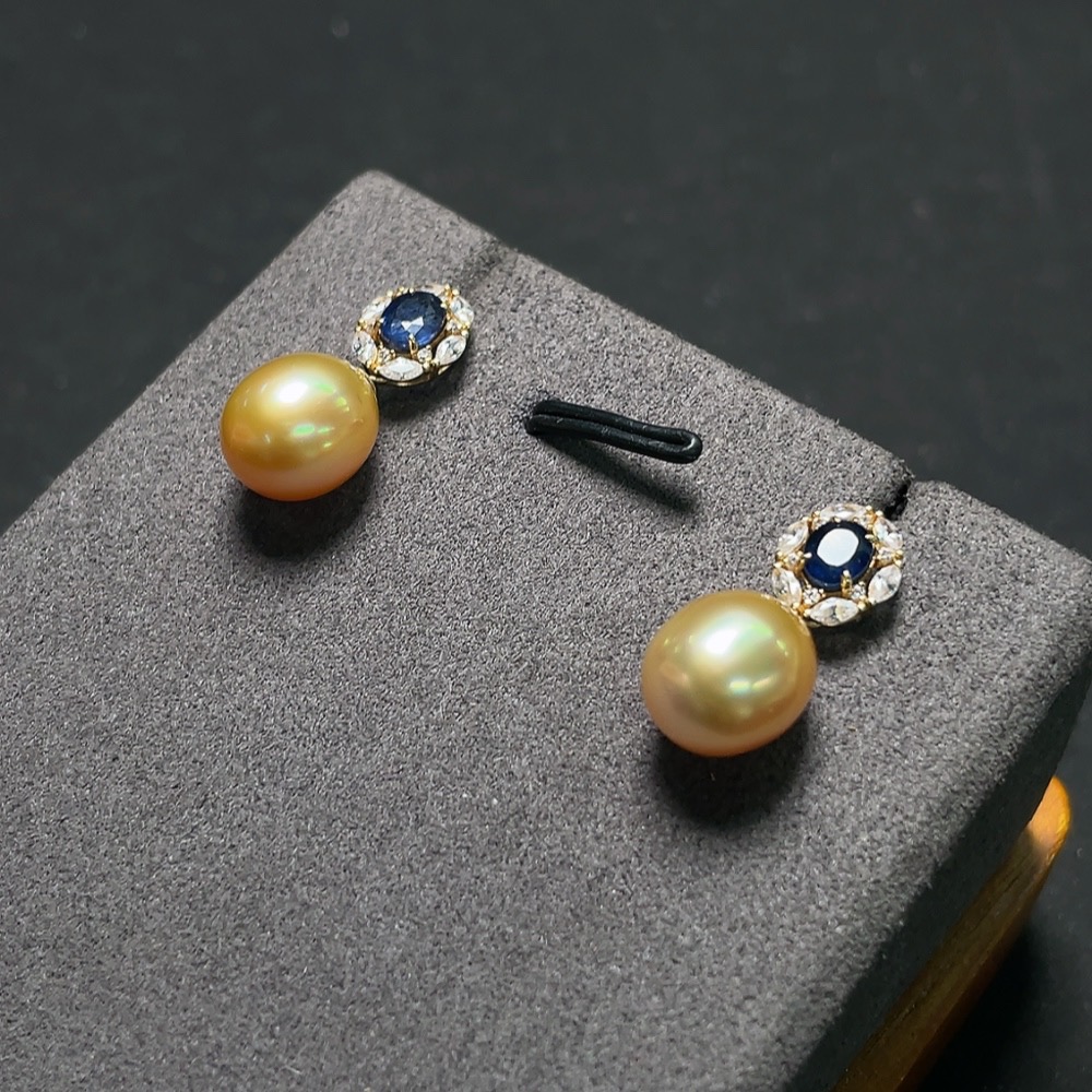 Seawater pearl earrings with sapphire, 18k gold, non-diamond, color origin undetermined, total weight approximately 3.75g, size about 9.1mm