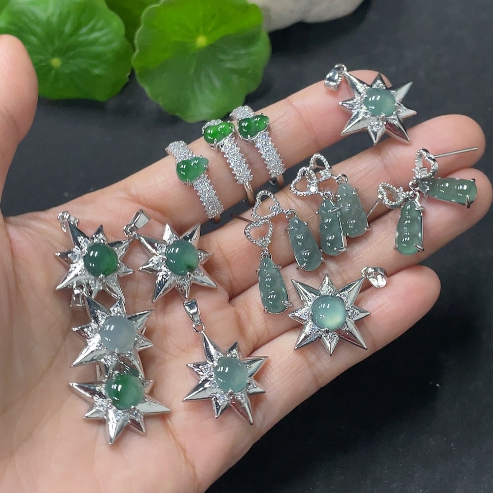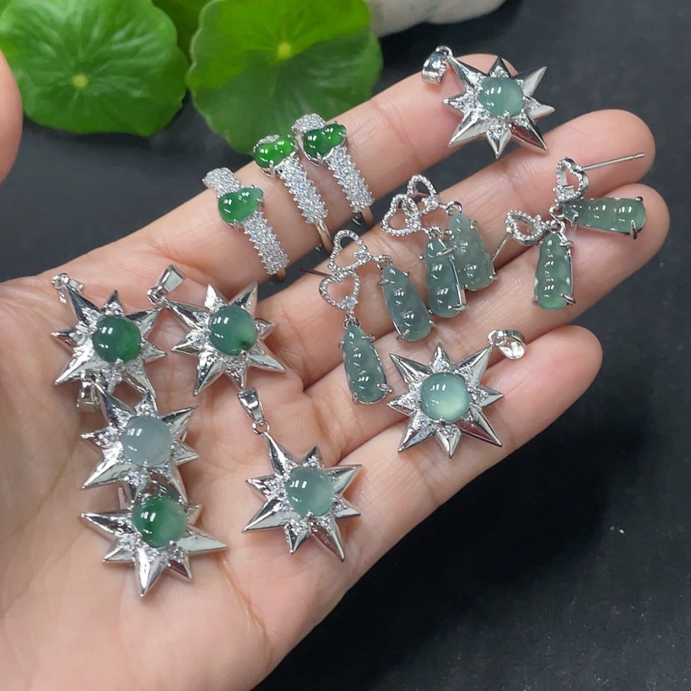 Jadeite Inlaid Pendant Earrings Sell as a Lot Non-Gold