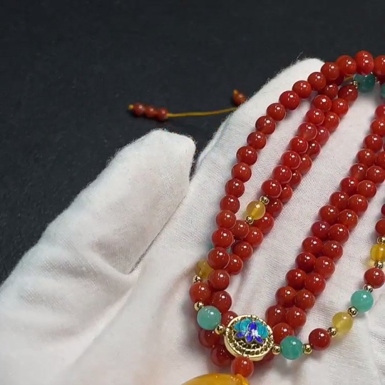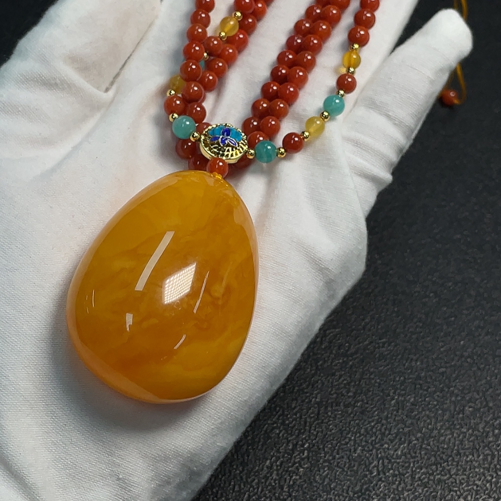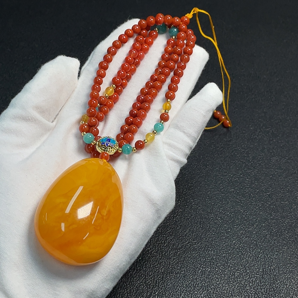 Amber beeswax pendant with non-natural/non-gold accents, set with southern red agate (visible organic inclusions), total weight approx. 52.65g including chain