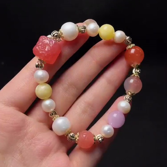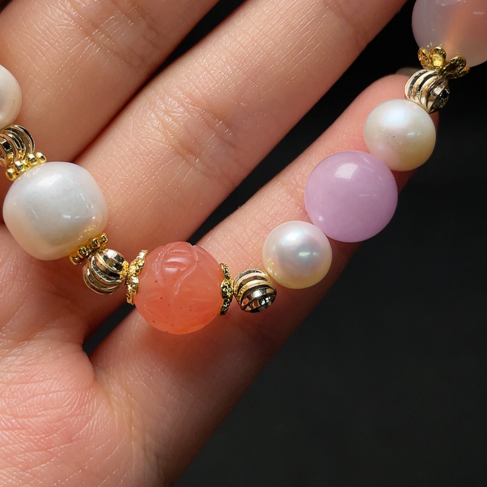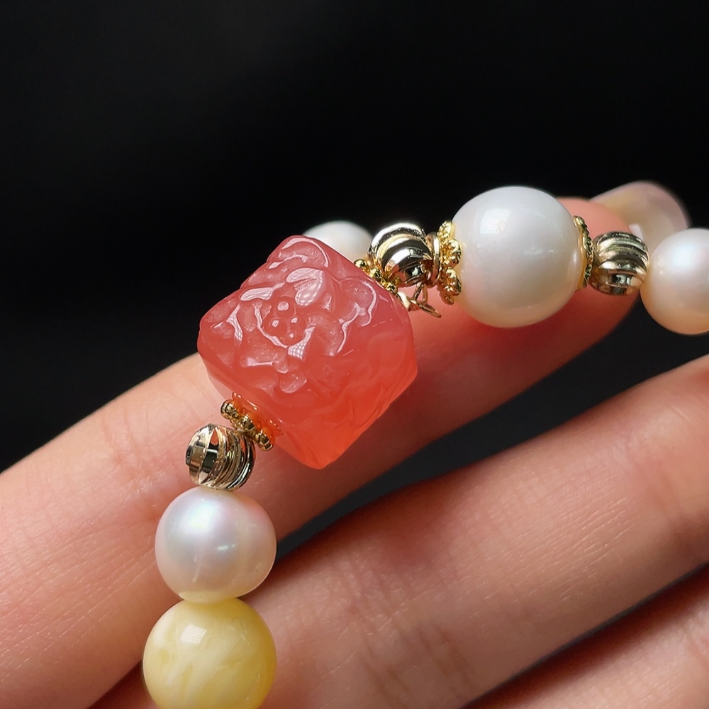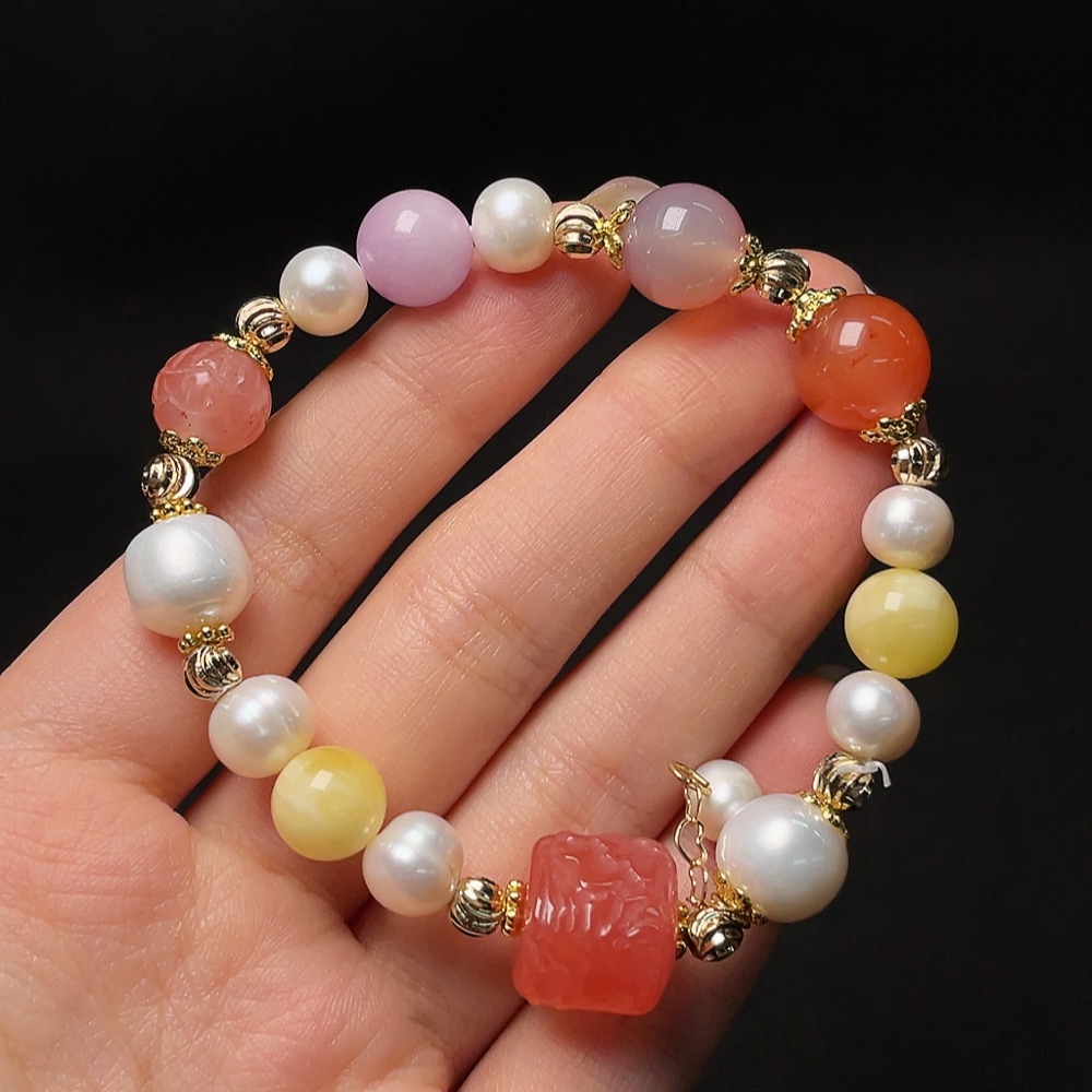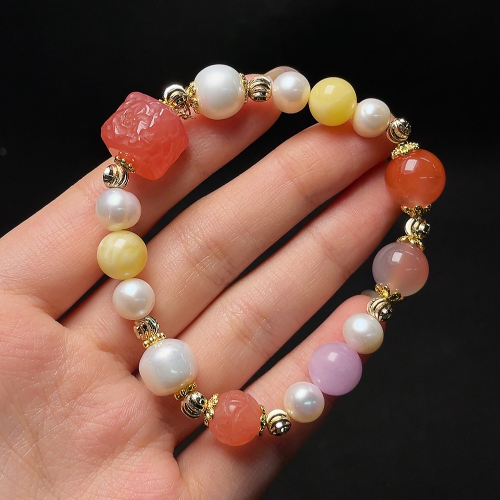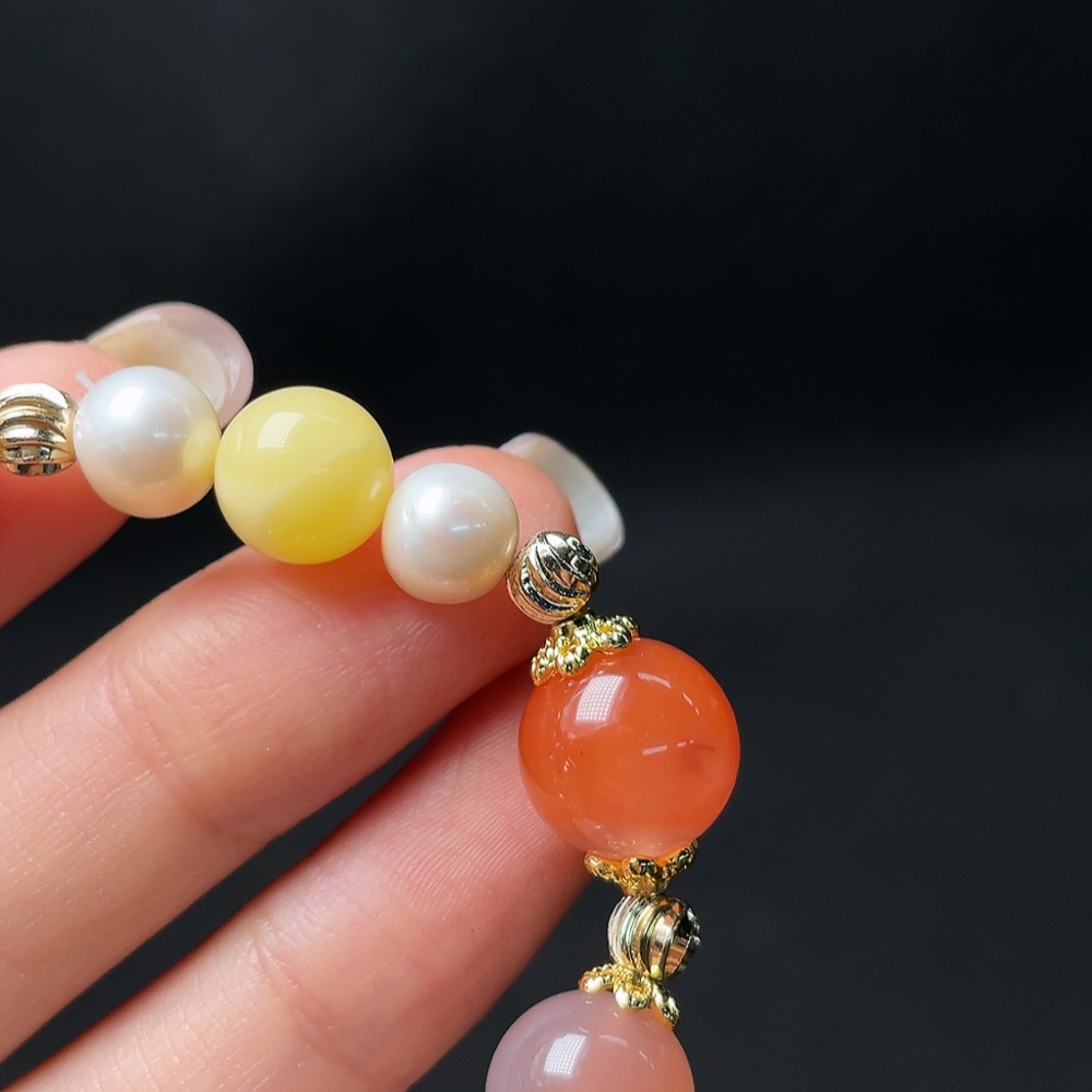 Red Agate Bracelet with Pearl and Amber Beeswax, Visible Organic Matter, Non-Natural Inlaid Stones, Total Weight Approx. 22.88g