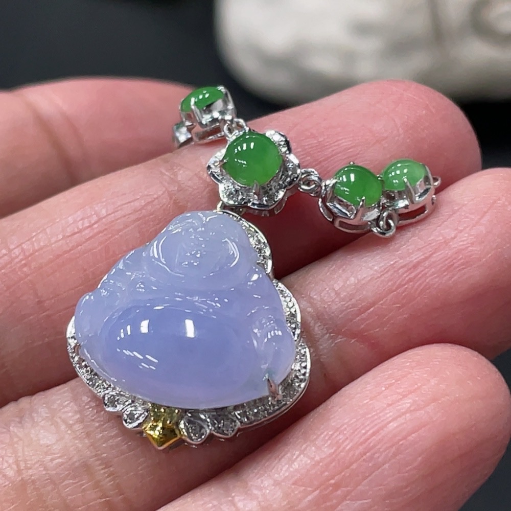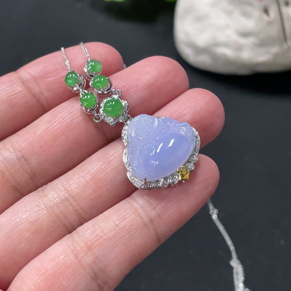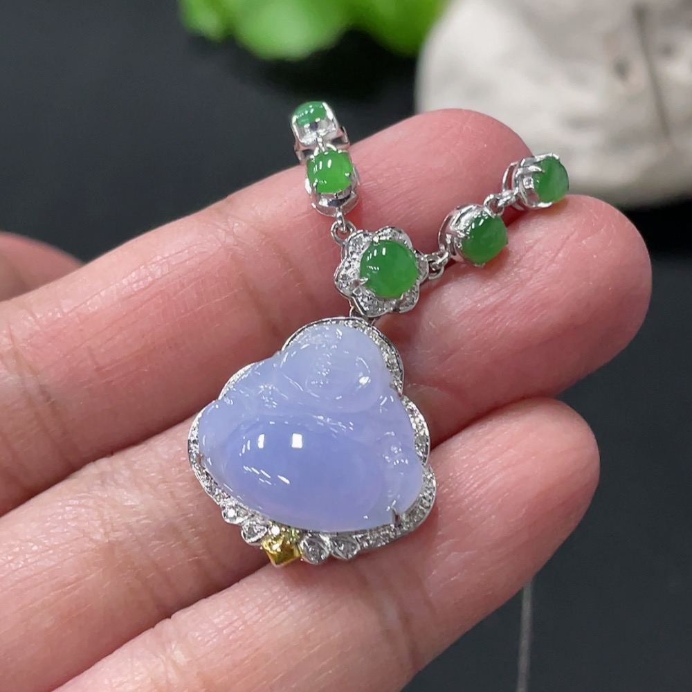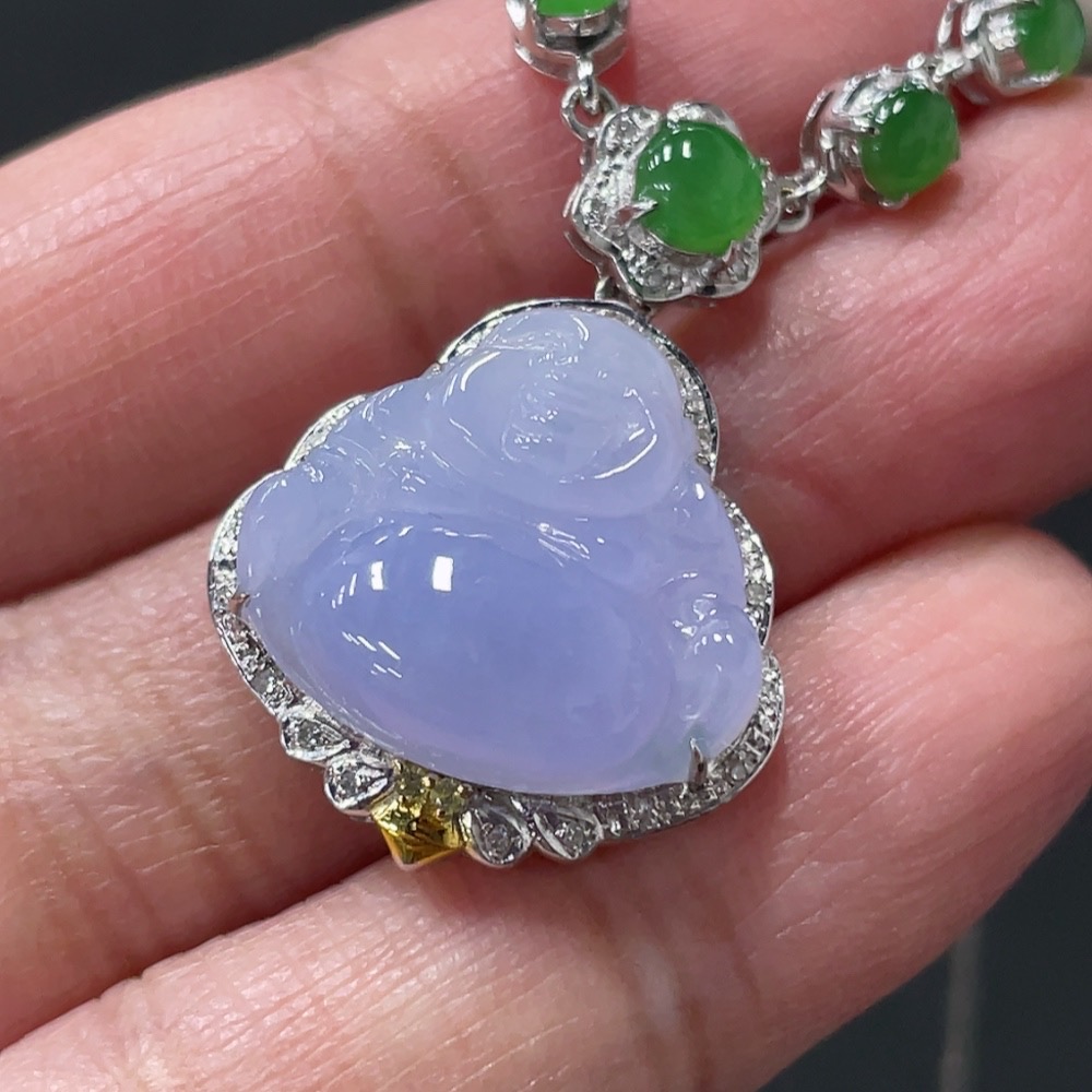 Jadeite Inlaid Buddha Pendant with 18k Gold and Colorless Diamonds, Total Weight Approximately 5.87g Including Chain