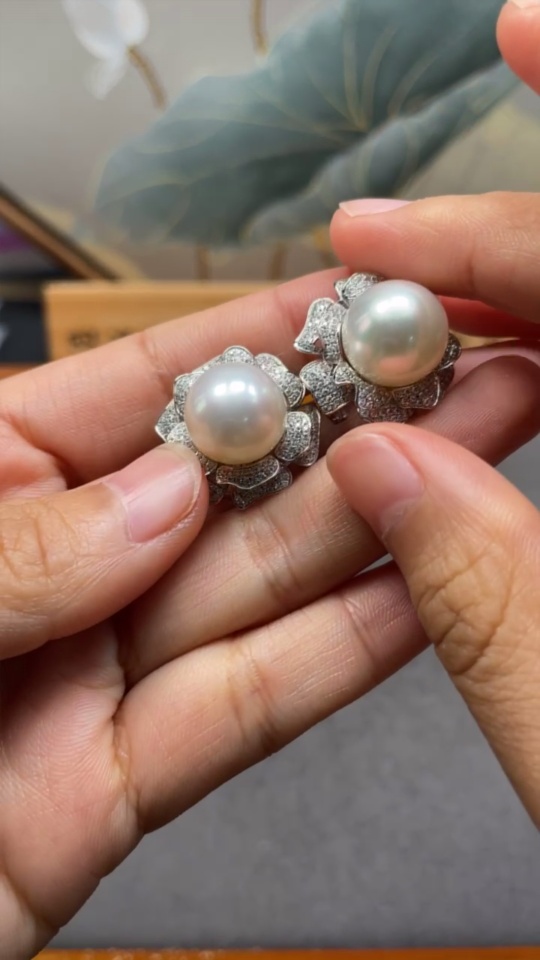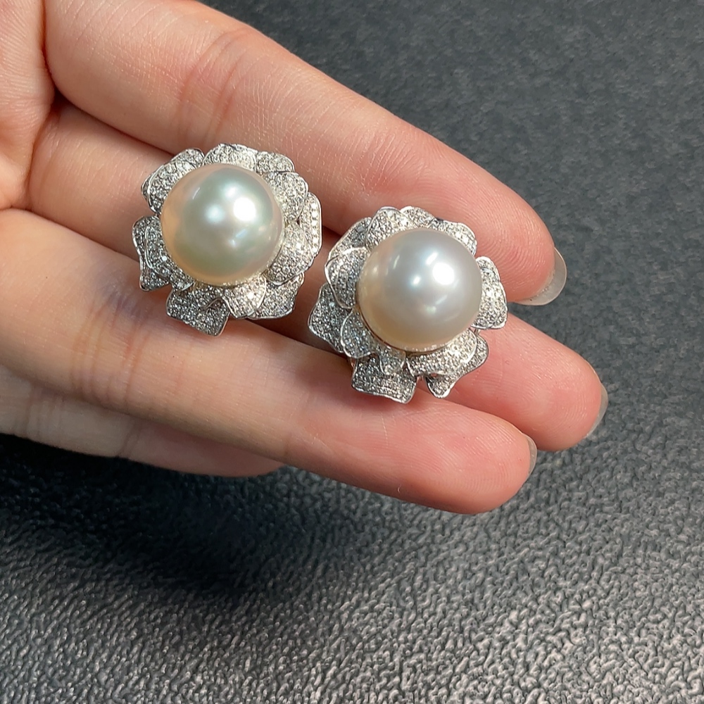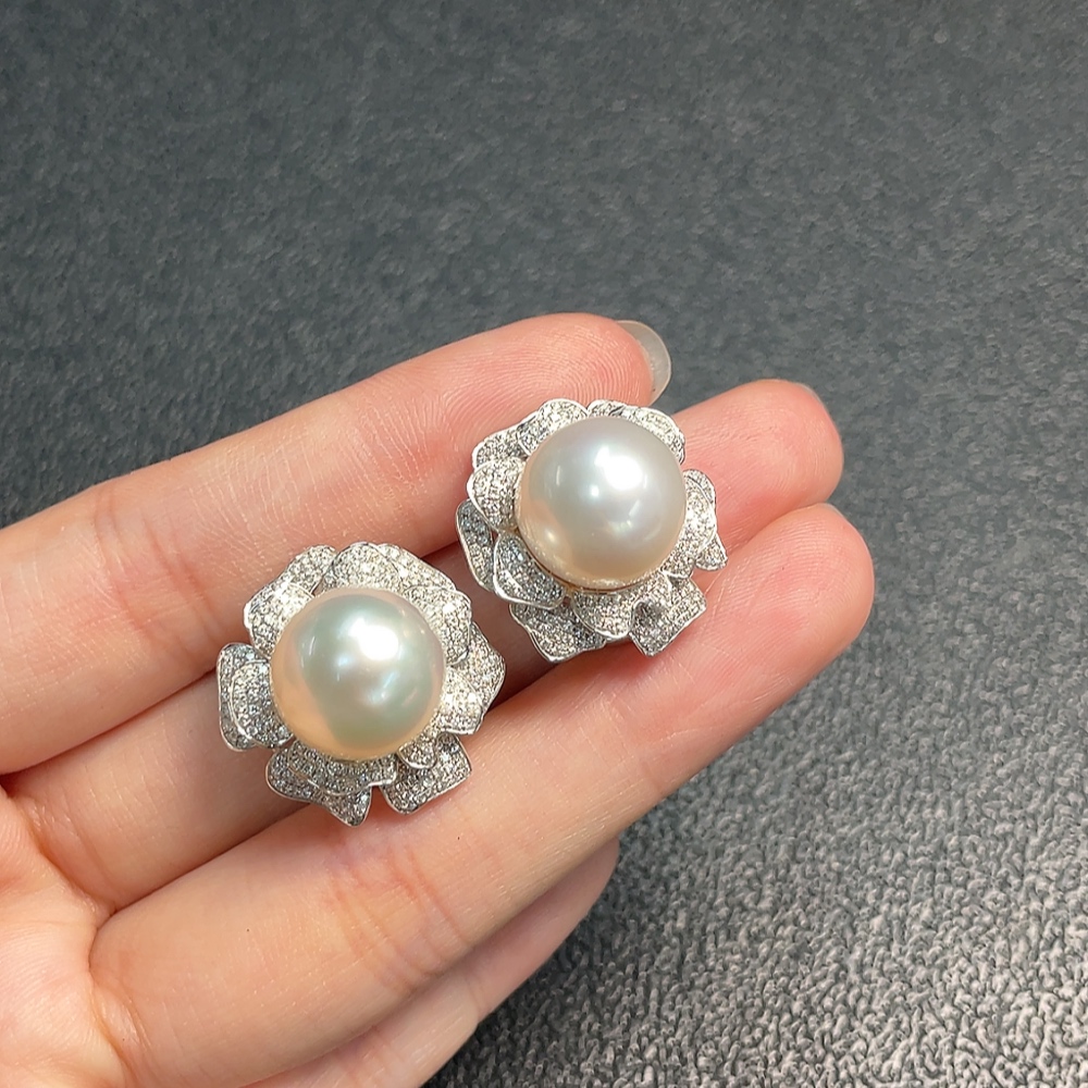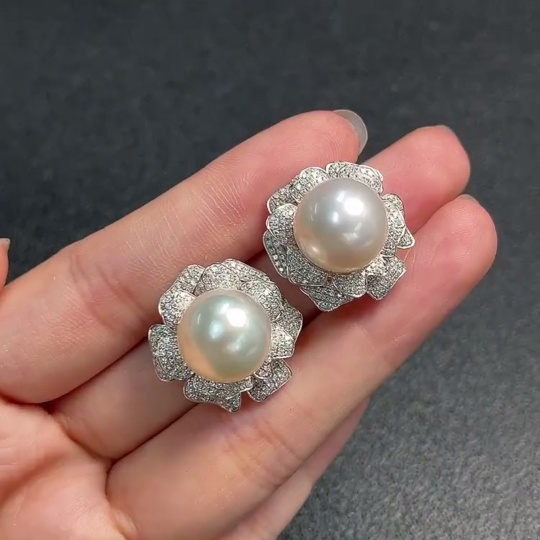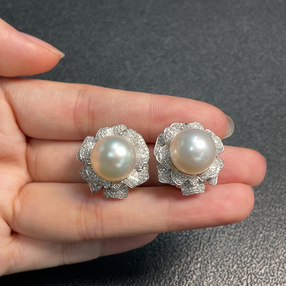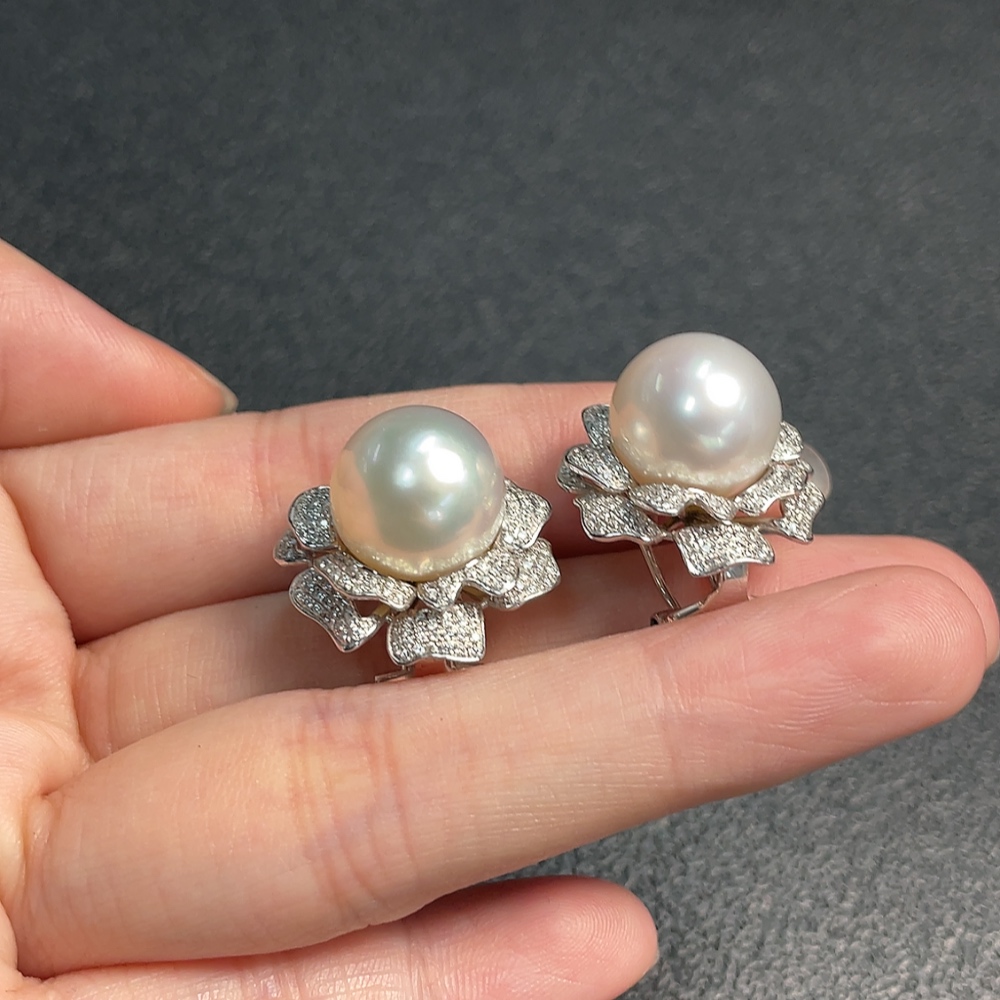 18K Seawater Pearl Earrings with Diamond Accents, Total Weight Approximately 14.04g, Pearl Size About 12.6mm