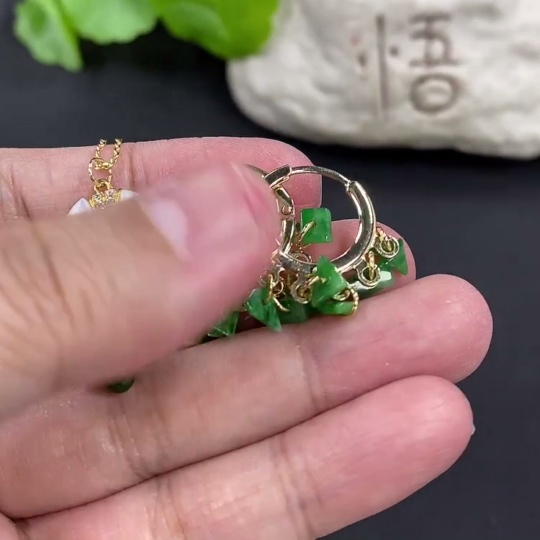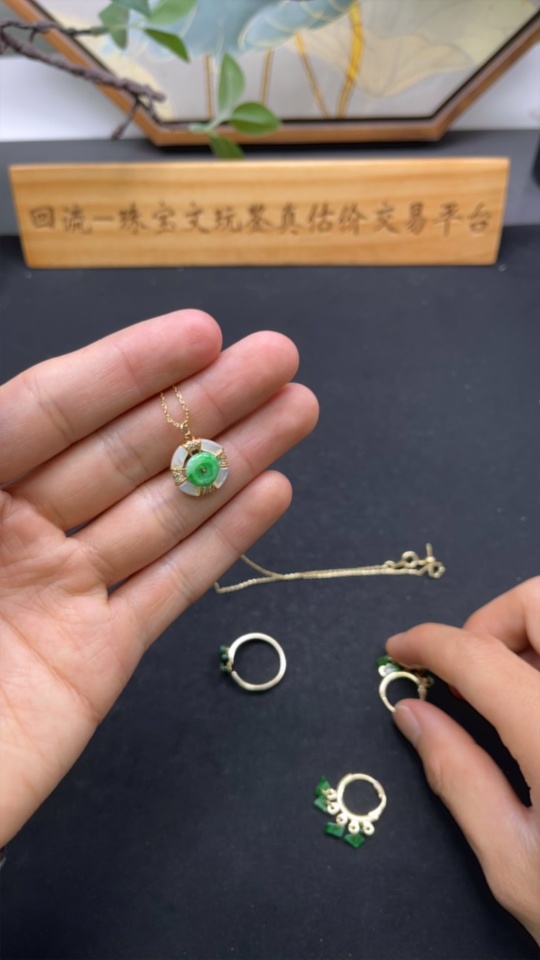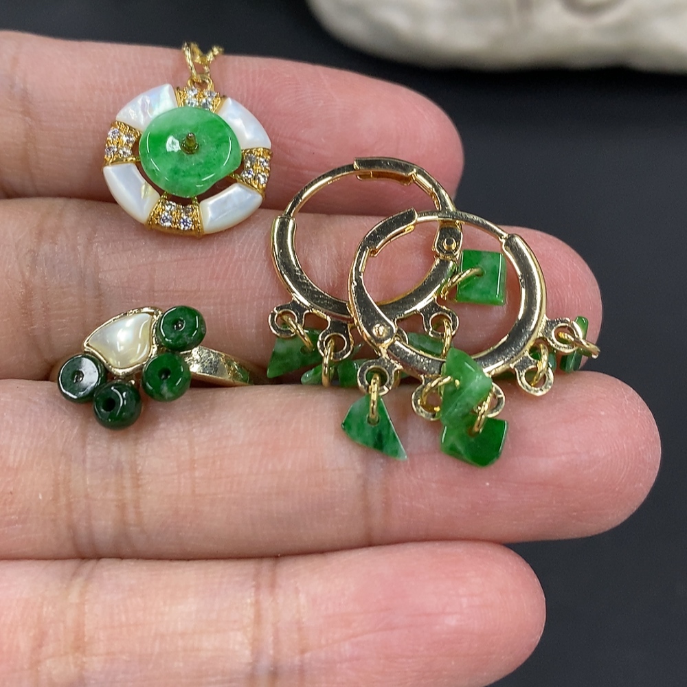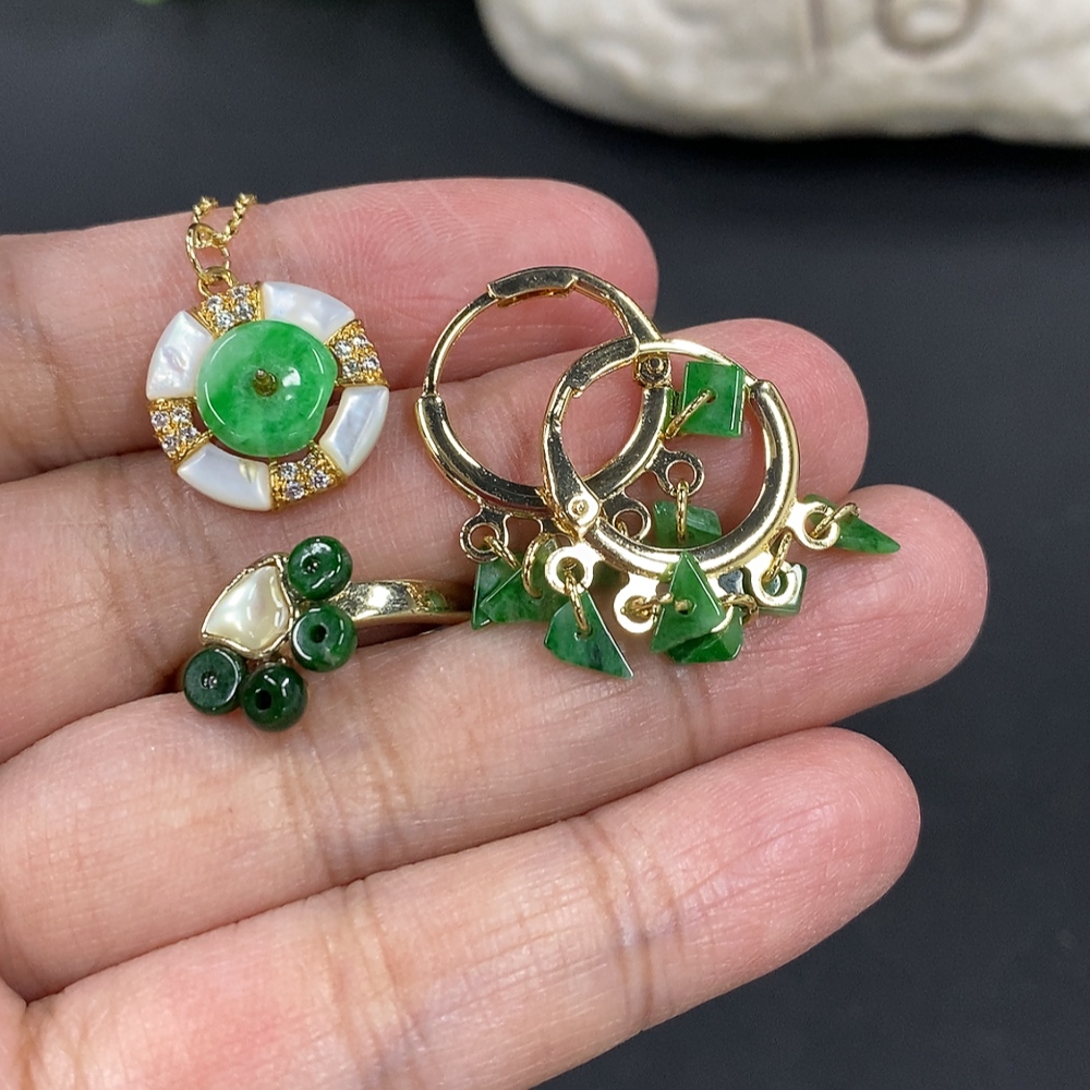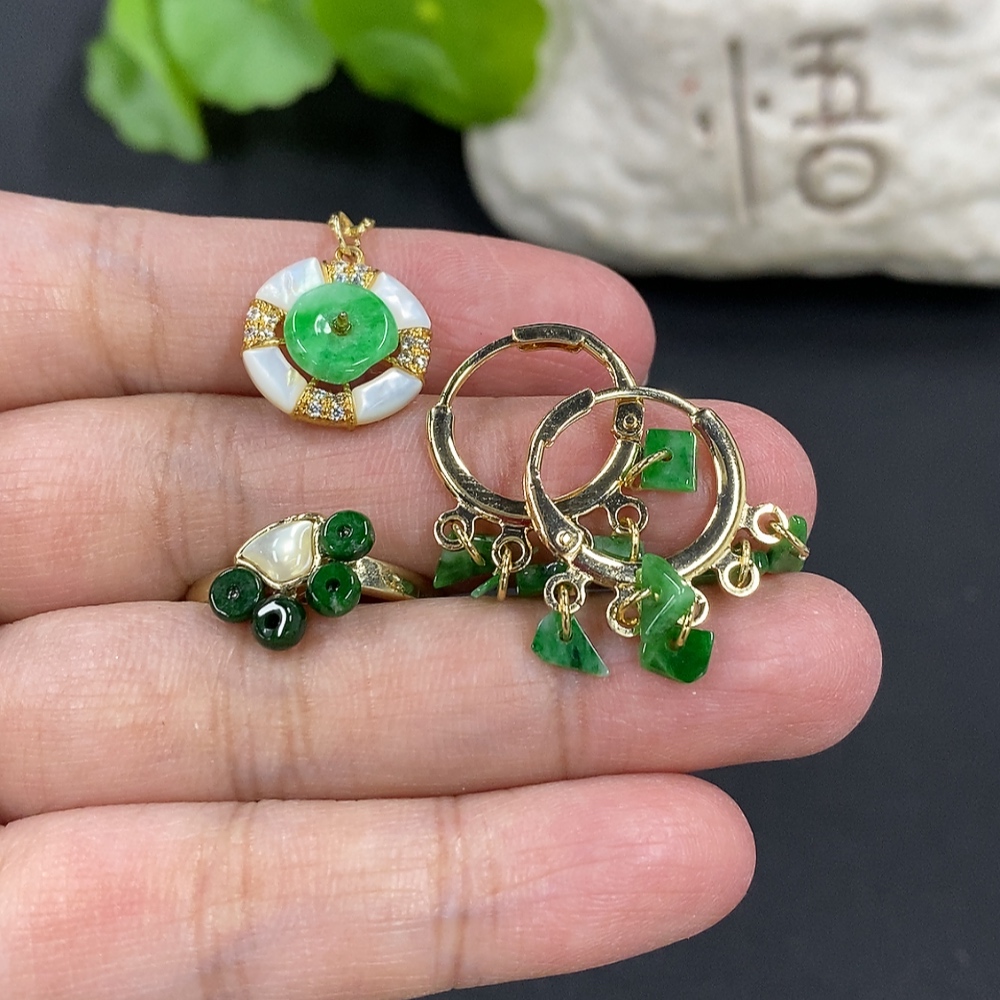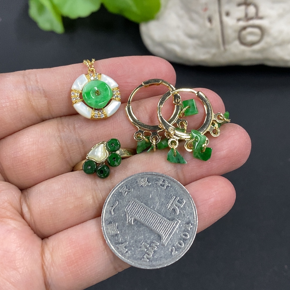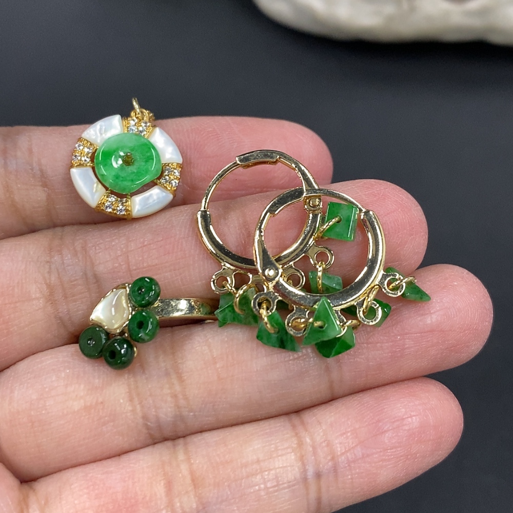 Jadeite inlaid earrings ring pendant non-gold inlaid total weight about 8g