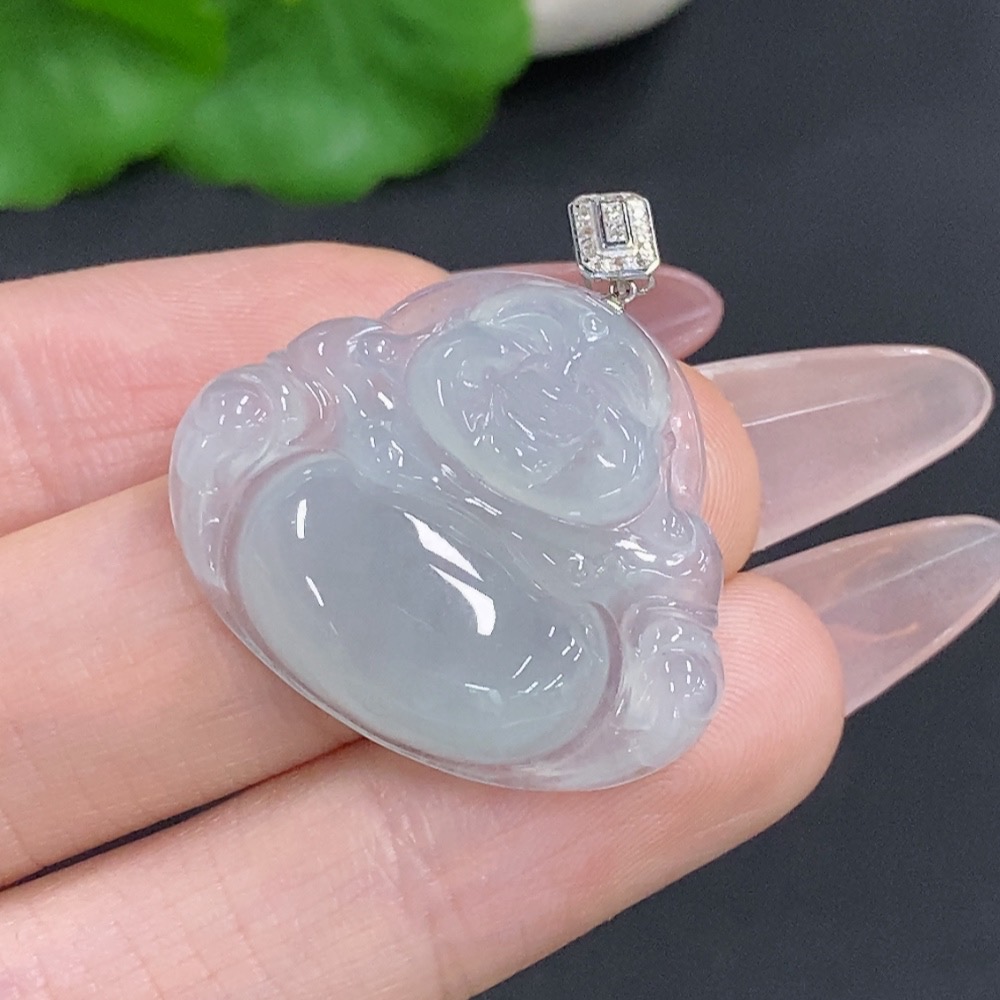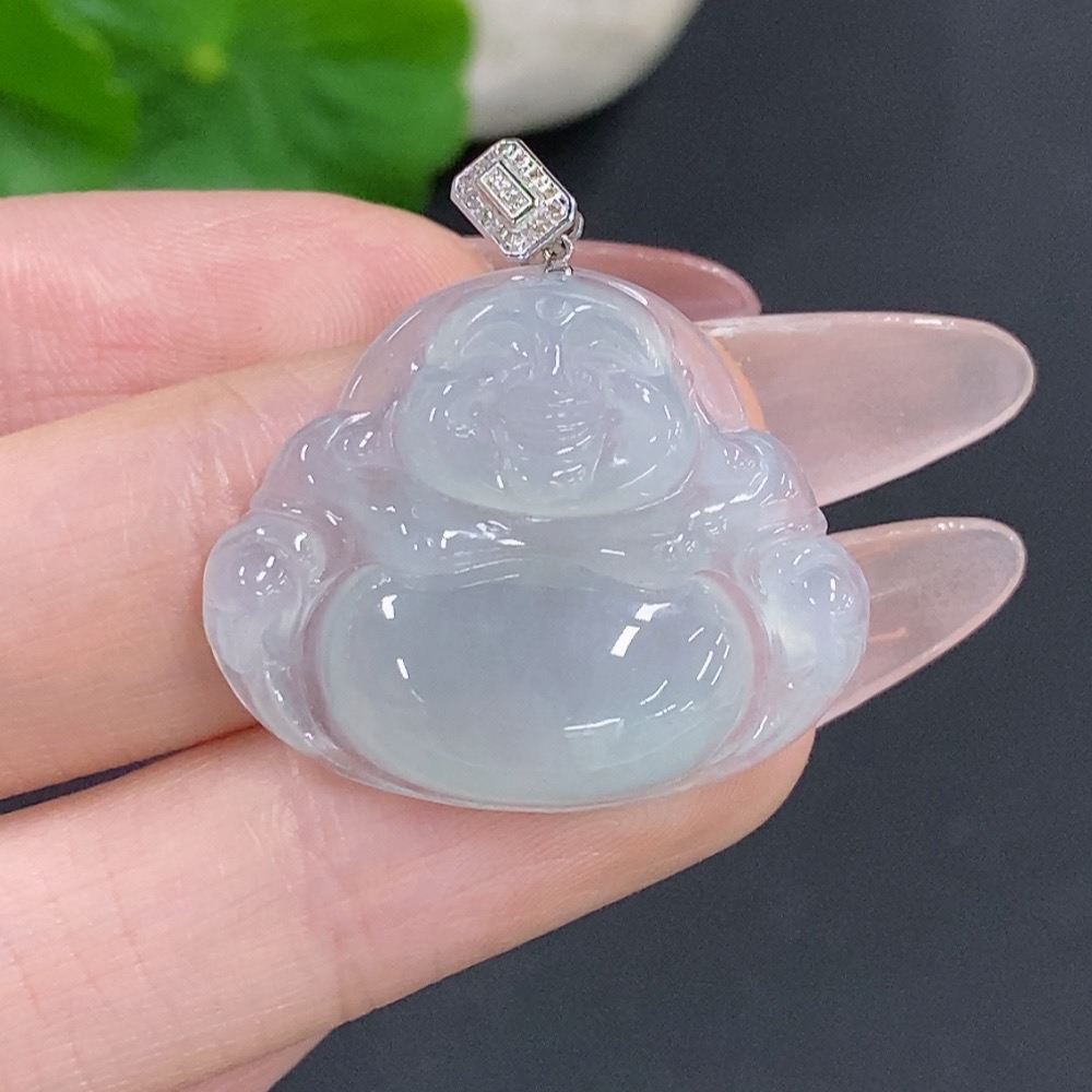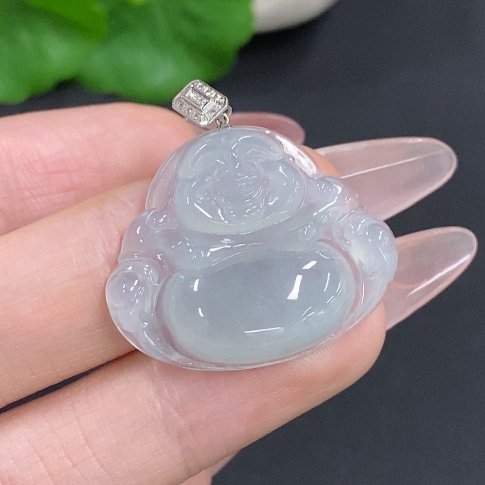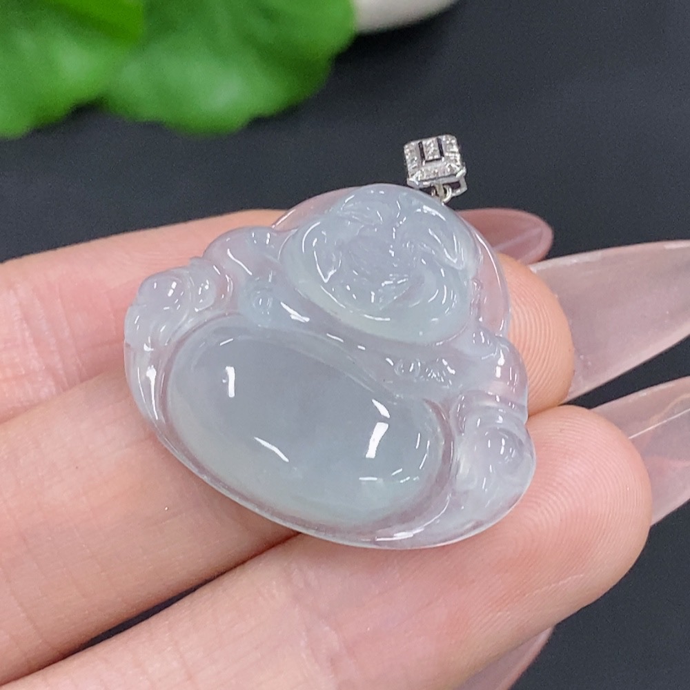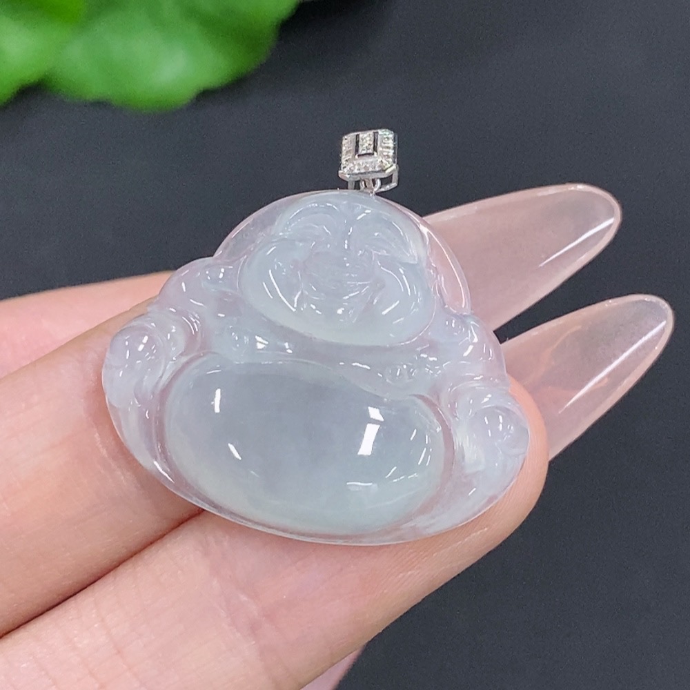 Jadeite Buddha Pendant with 18K Gold Clasp, Total Weight Approximately 5.5g, Set with Diamonds