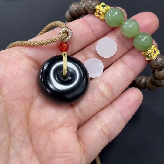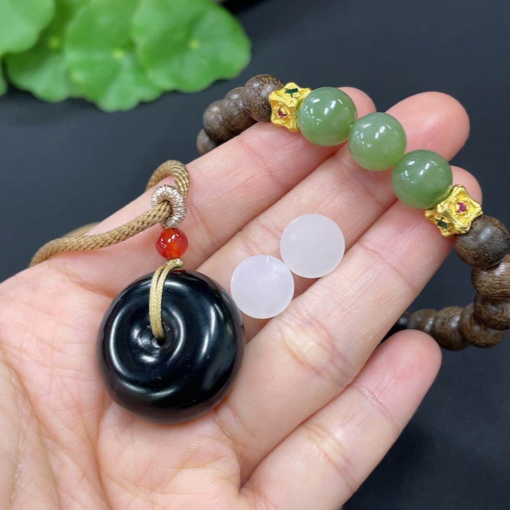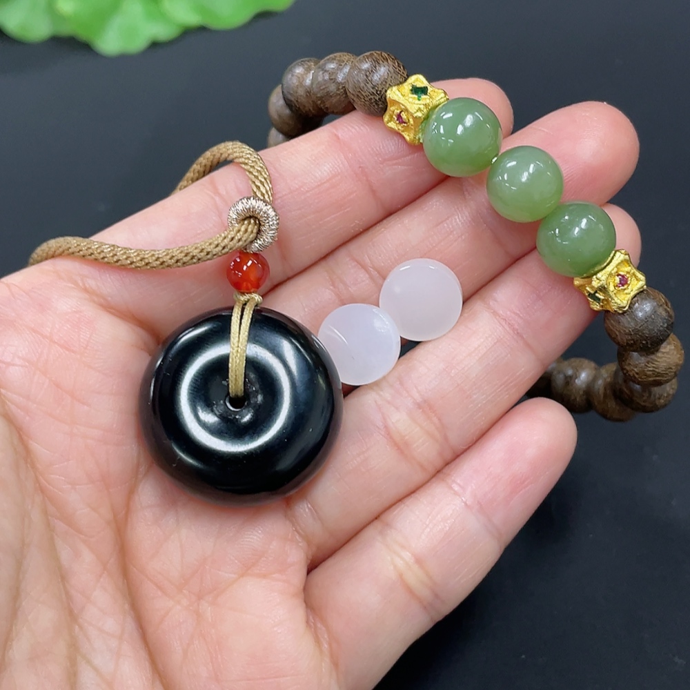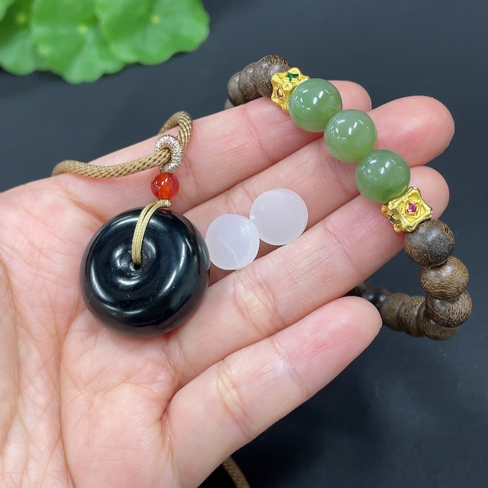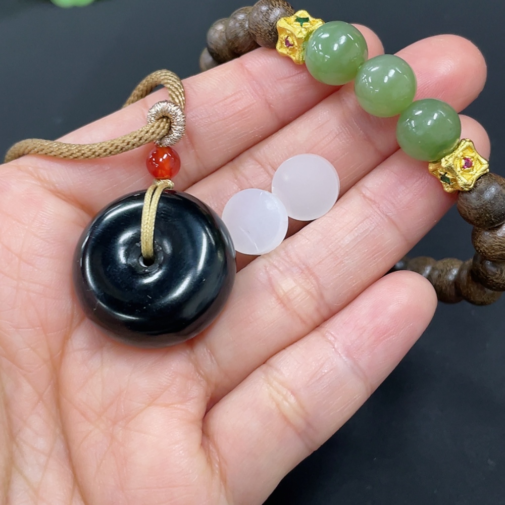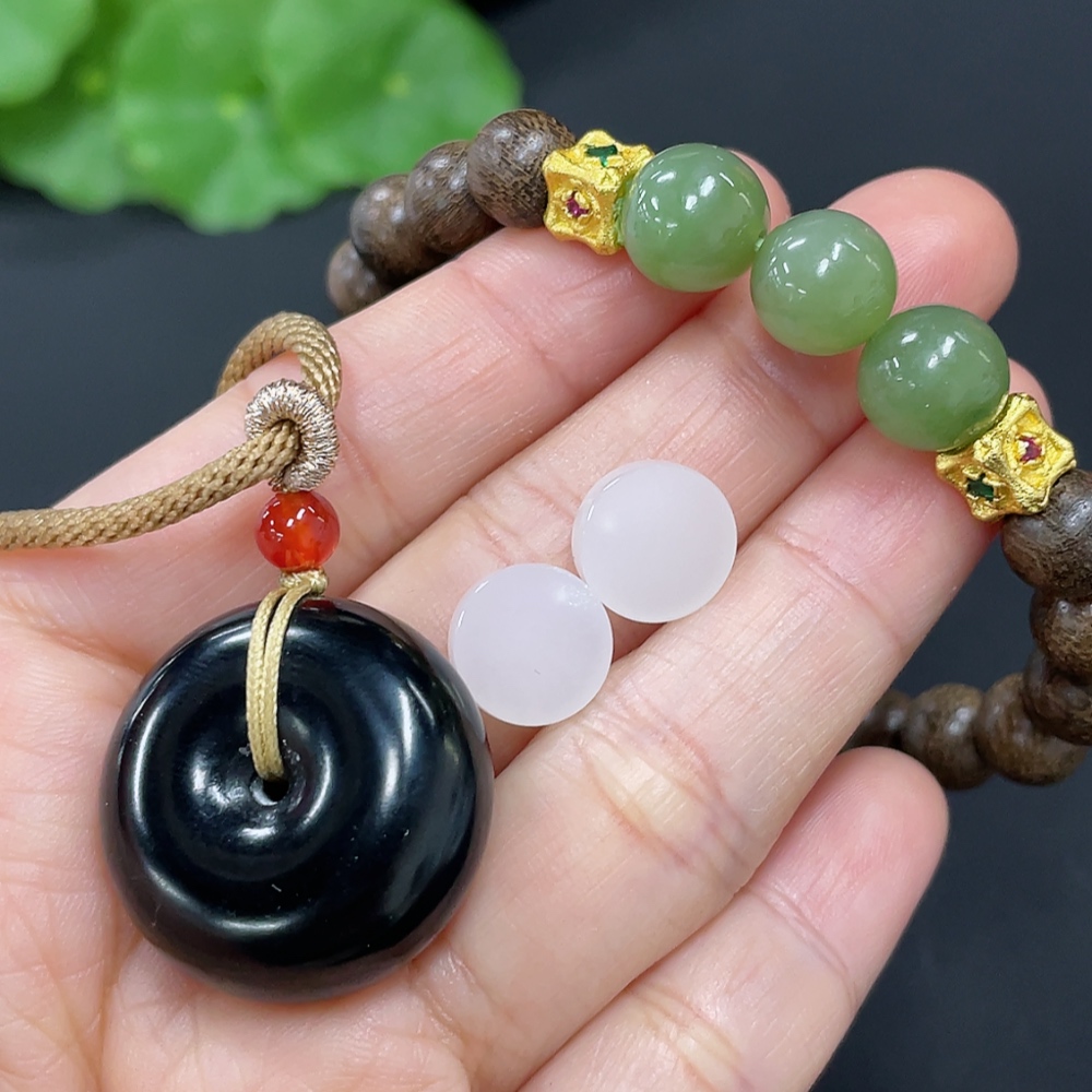 Hetian Jade Pendant, Peace Buckle, Wood Bead Bracelet Approx. 8.8mm, Non-Gold Inlaid, Inlaid Piece, Total Weight Approx. (Including Rope) 27.2g, Matching Beads Not Hetian Jade