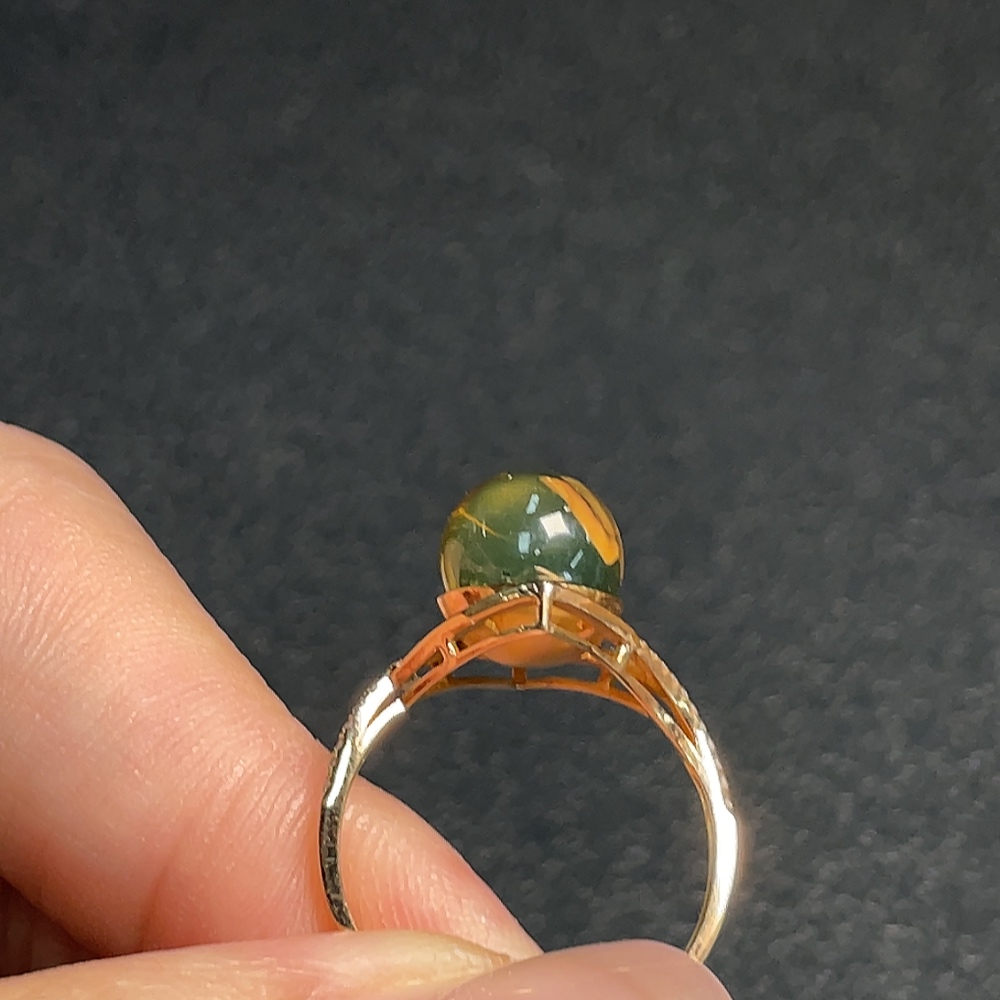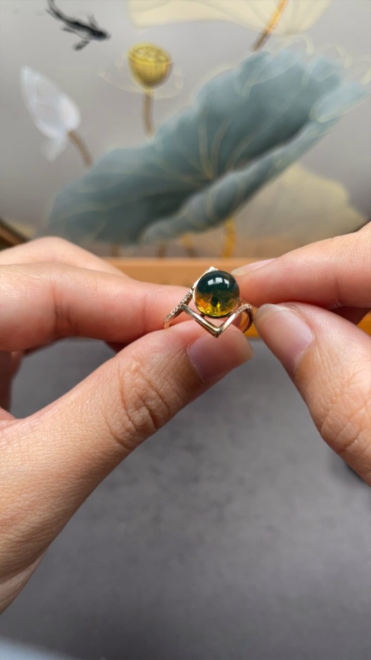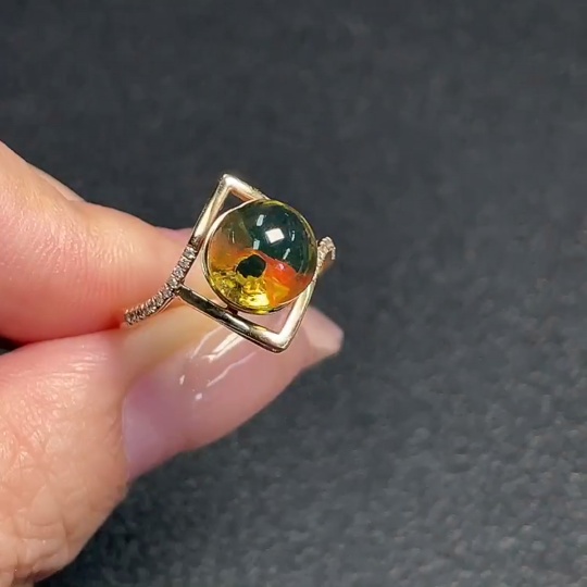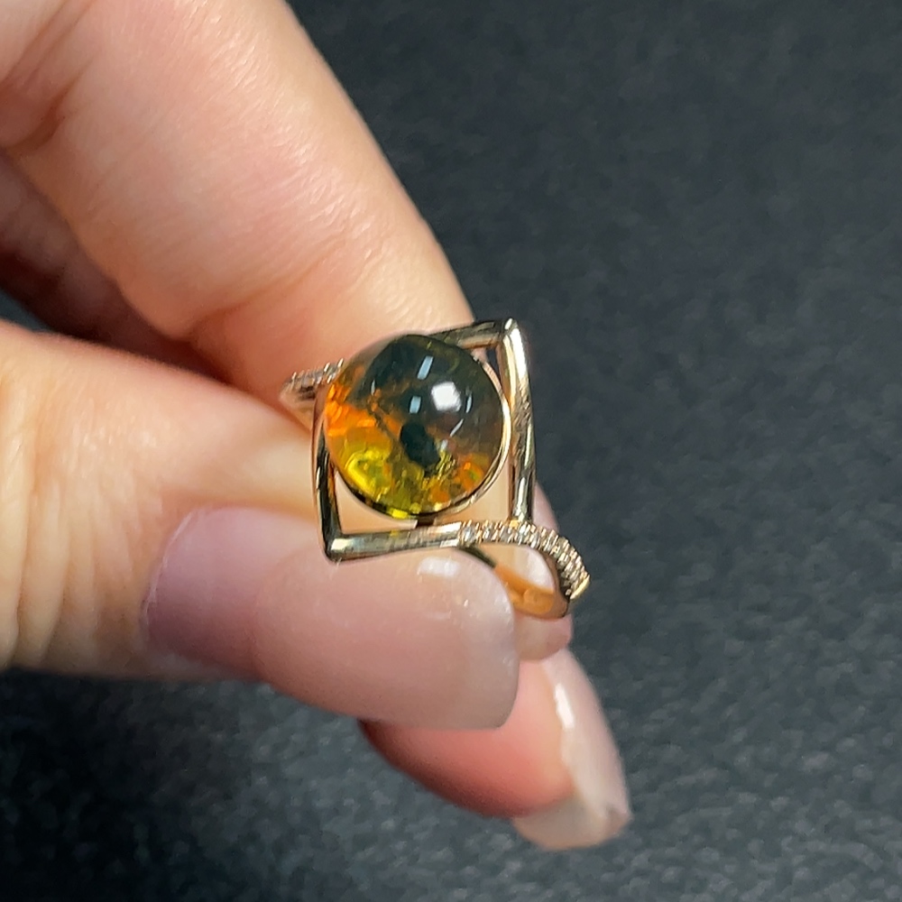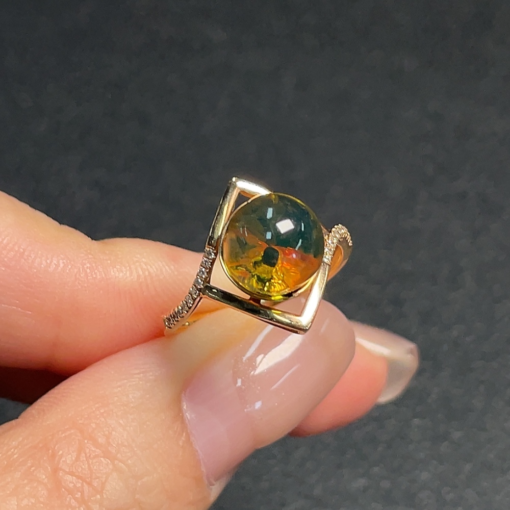 Amber Beeswax Ring 18K Gold with Diamond Accents, Total Weight Approx. 2.31g, Stone Size 8.1mm, Size 13