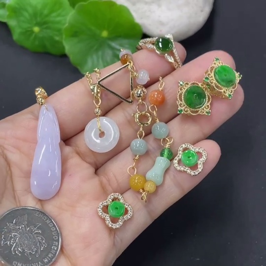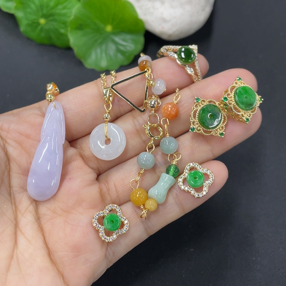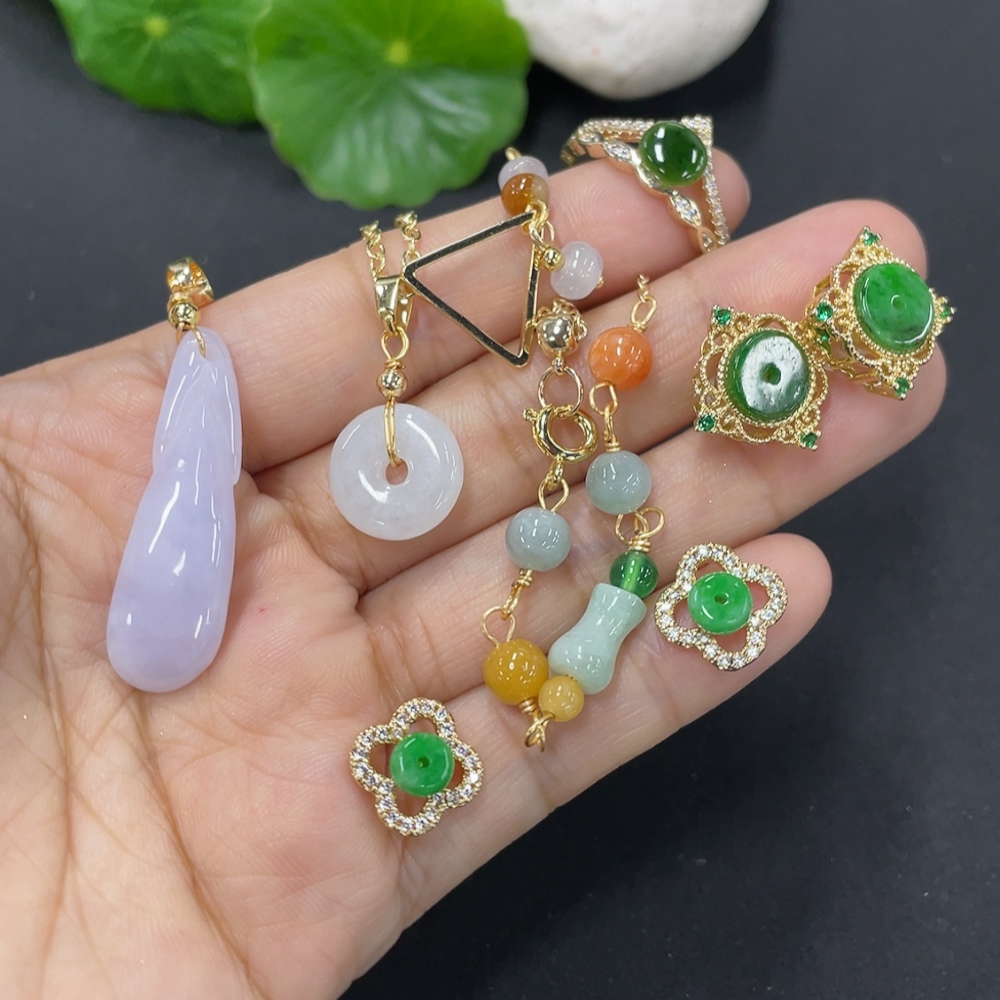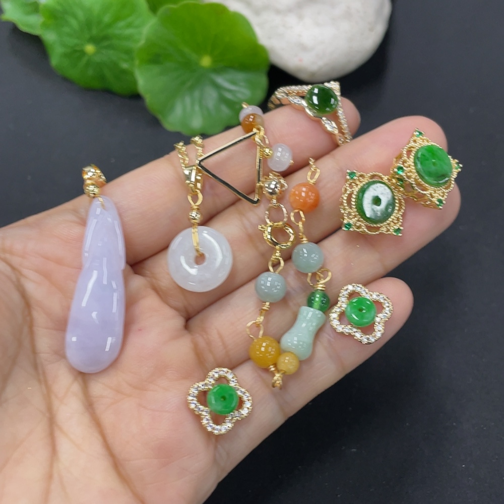 Jadeite inlaid jewelry with non-A grade stones, non-gold inlaid, adjustable ring size, total weight approx. 21g, with miscellaneous stones