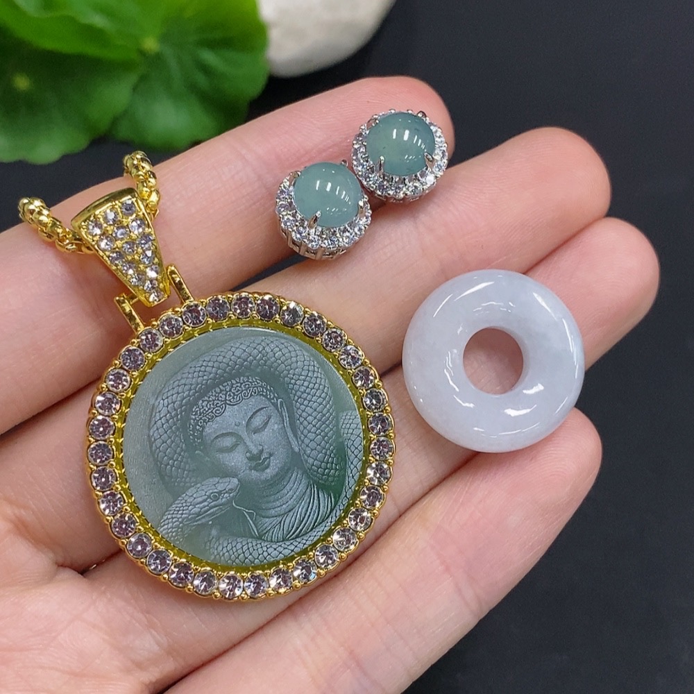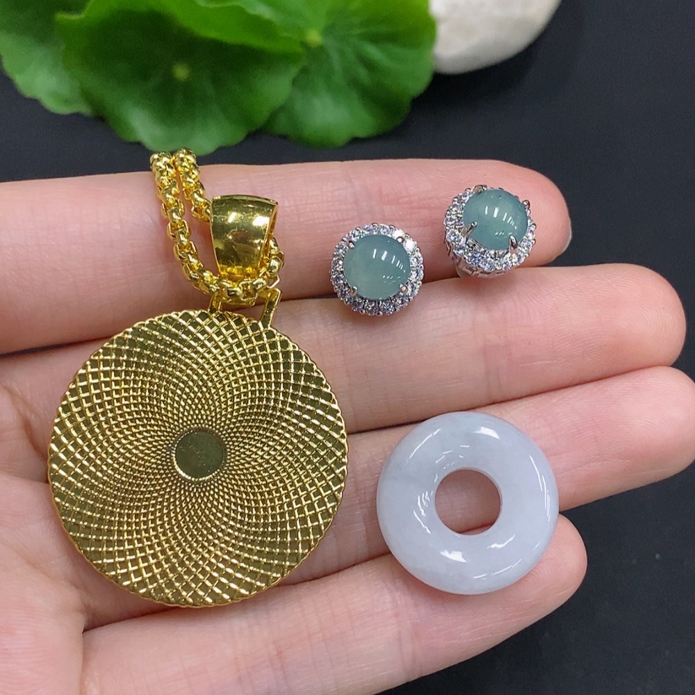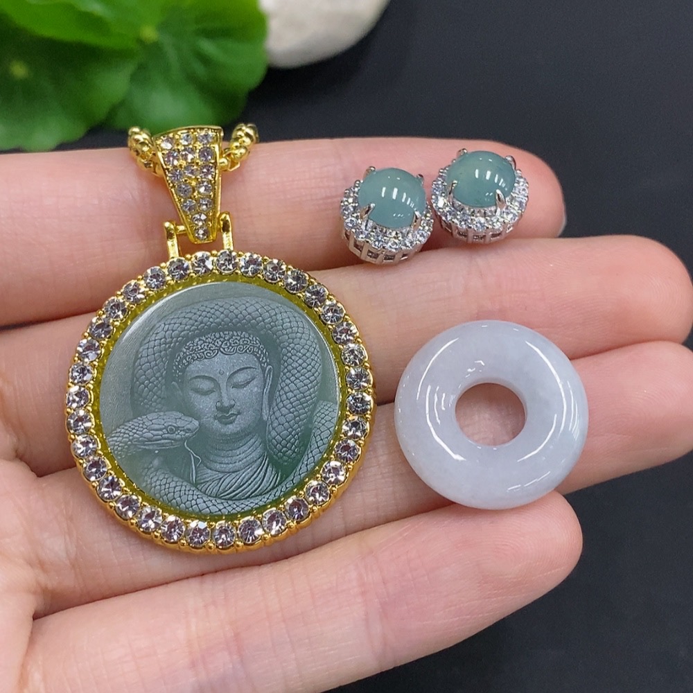 Jadeite Pendant with Earrings Sell as a Lot Non-Gold Inlaid