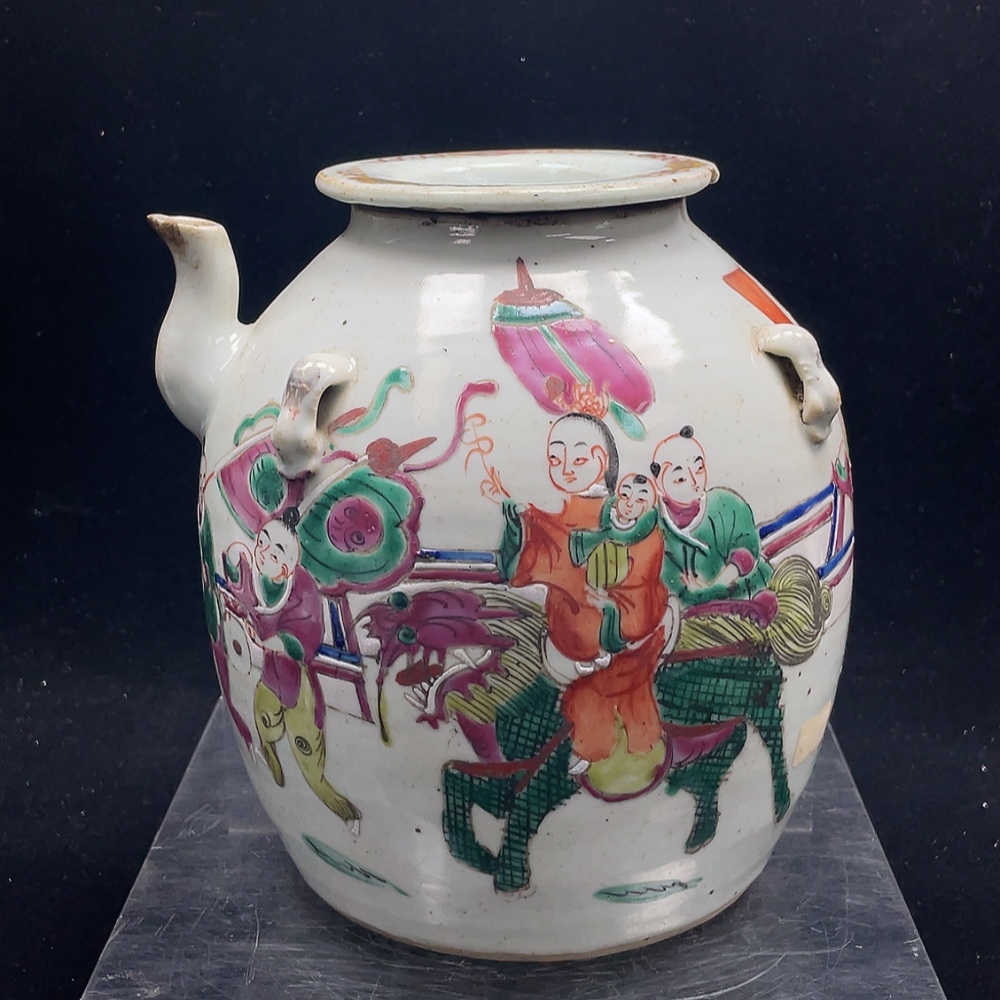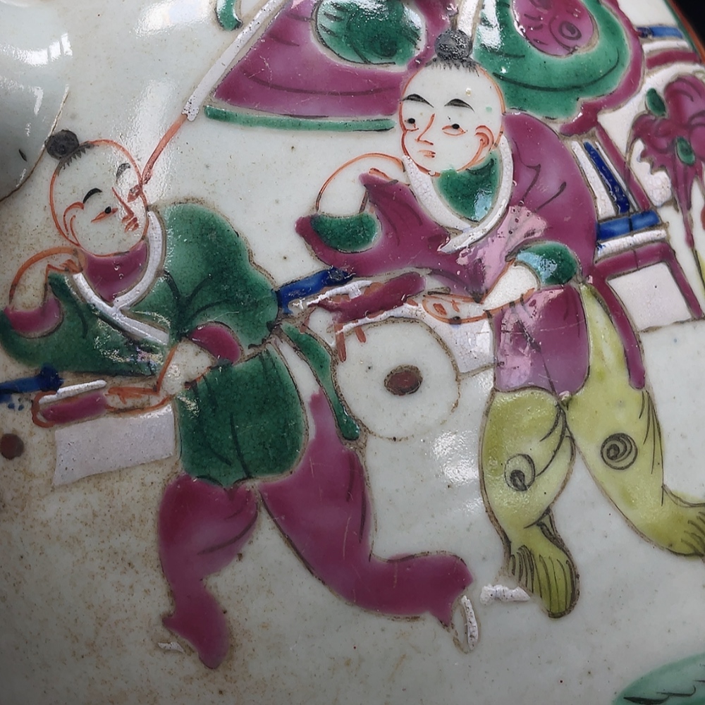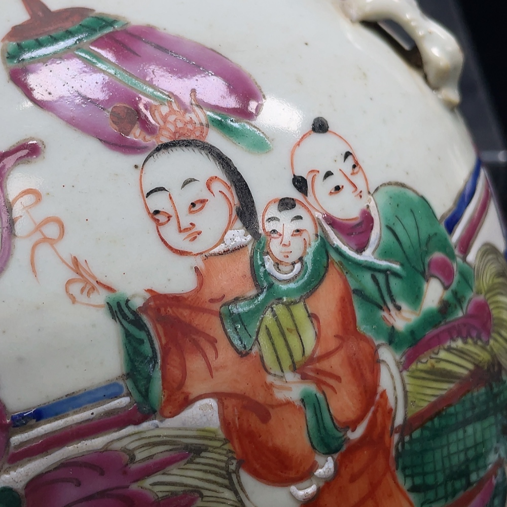 Porcelain, 2 pieces, with chips and cracks, Late Qing Dynasty famille-rose "Kirin Bringing a Son" four-handled pot
