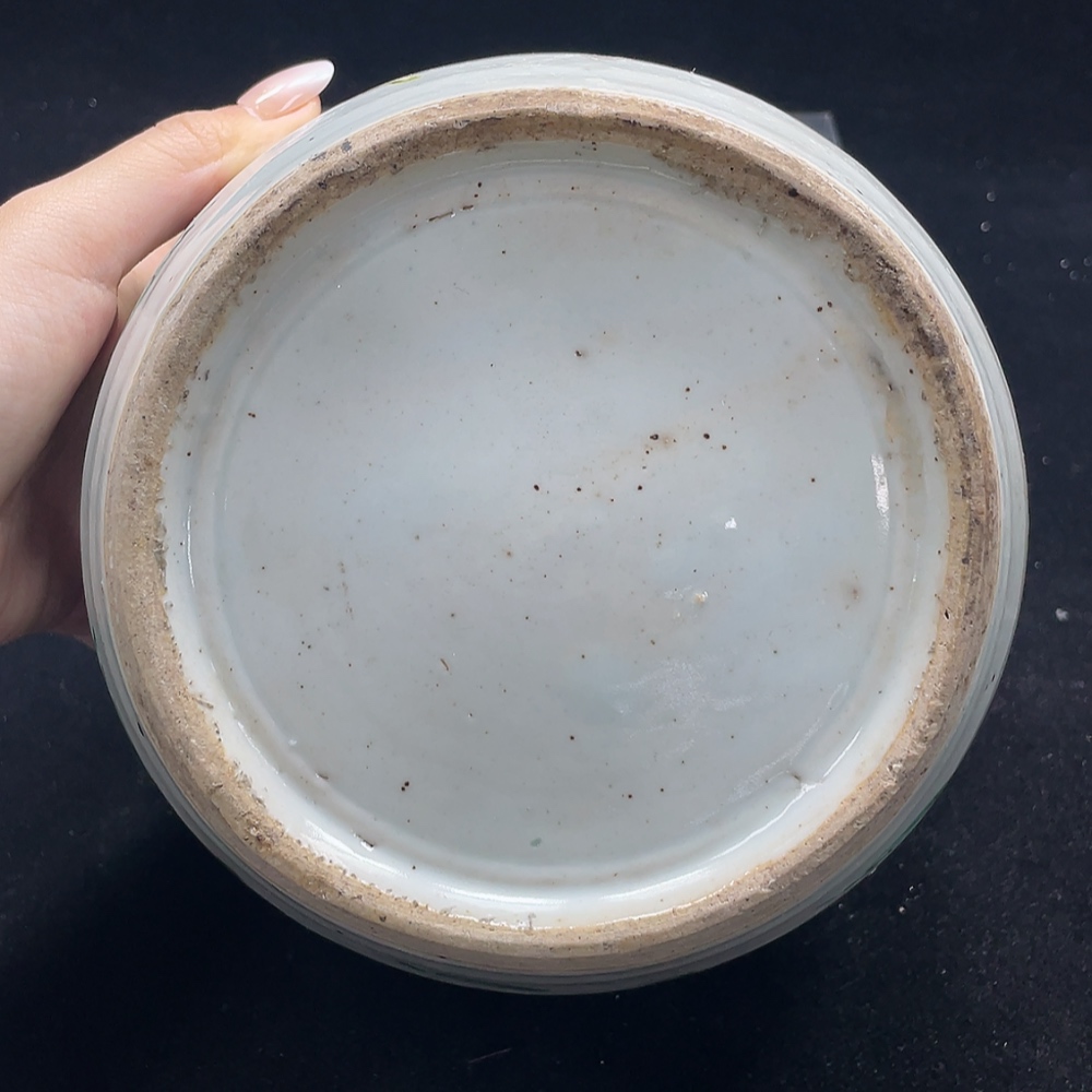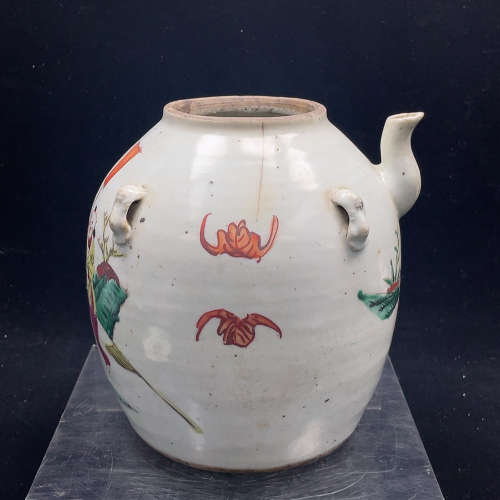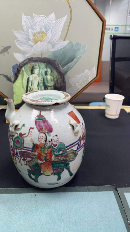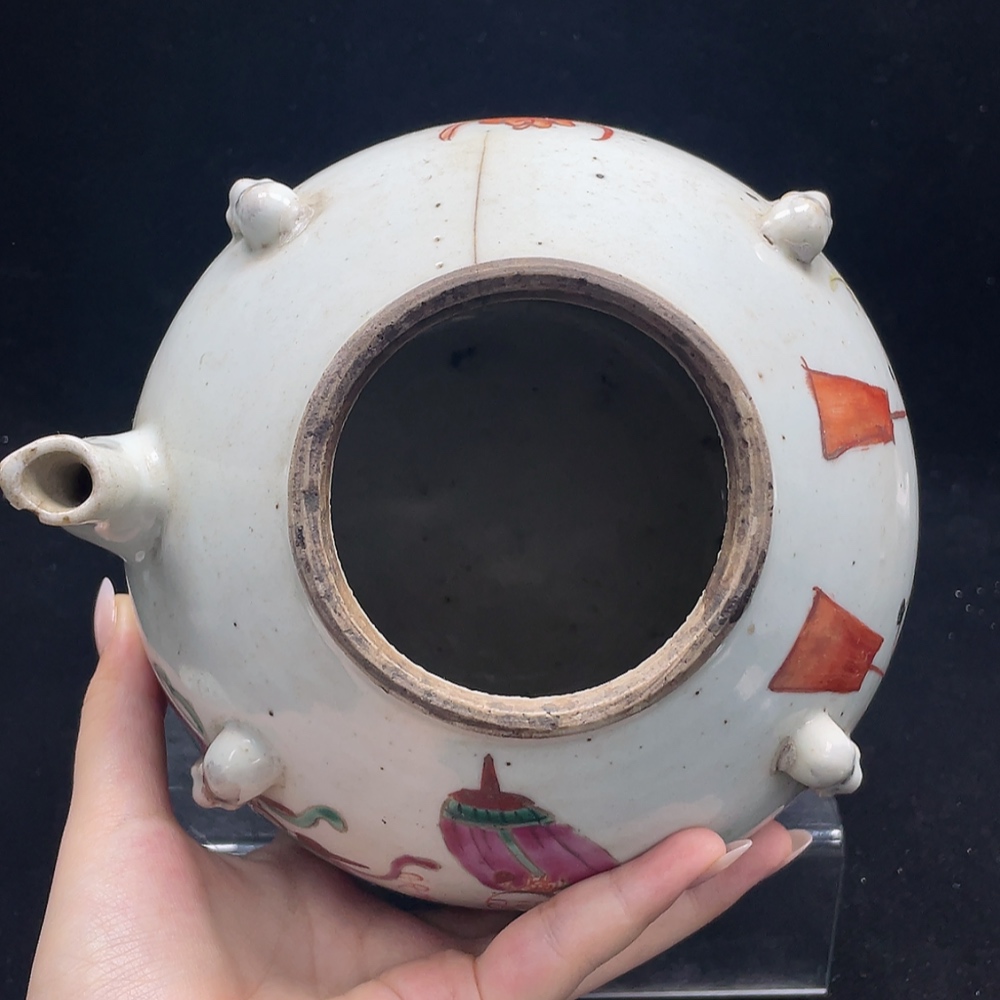 Porcelain, 2 pieces, with chips and cracks, Late Qing Dynasty famille-rose "Kirin Bringing a Son" four-handled pot