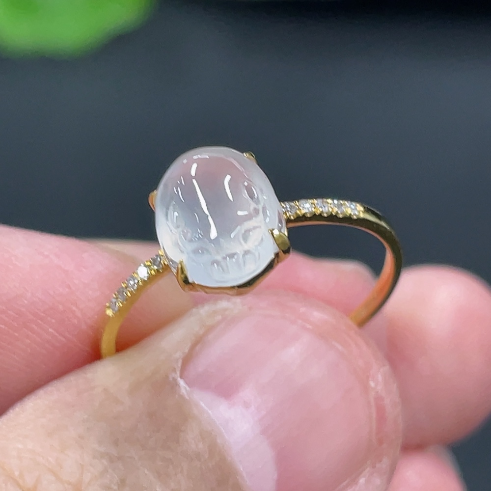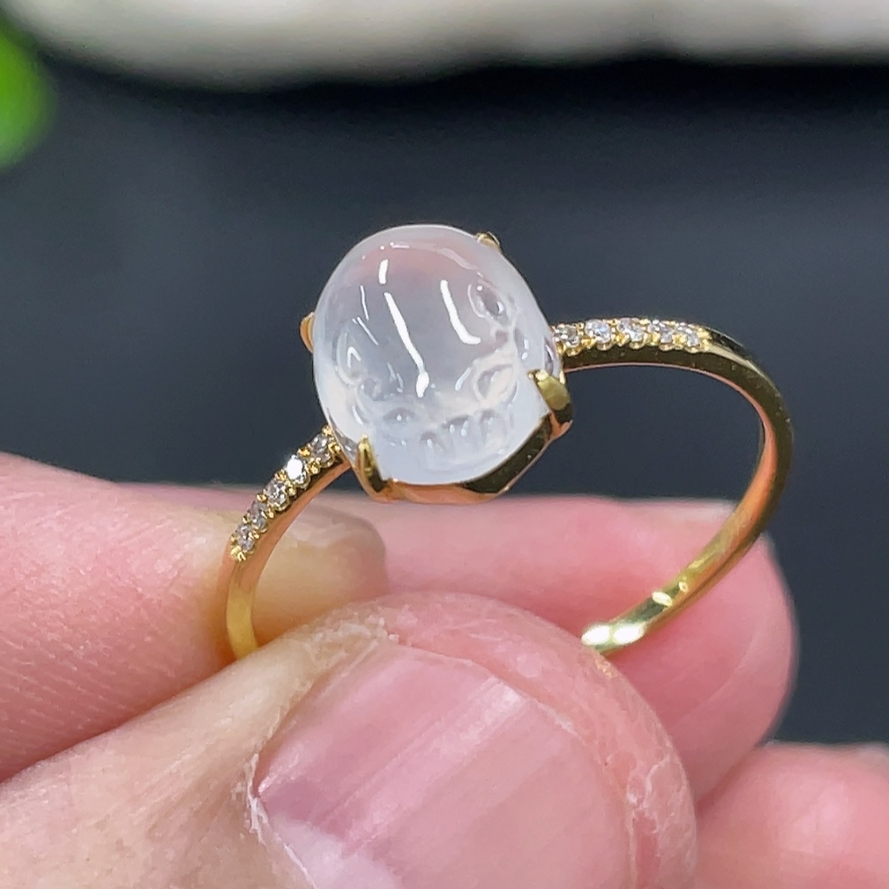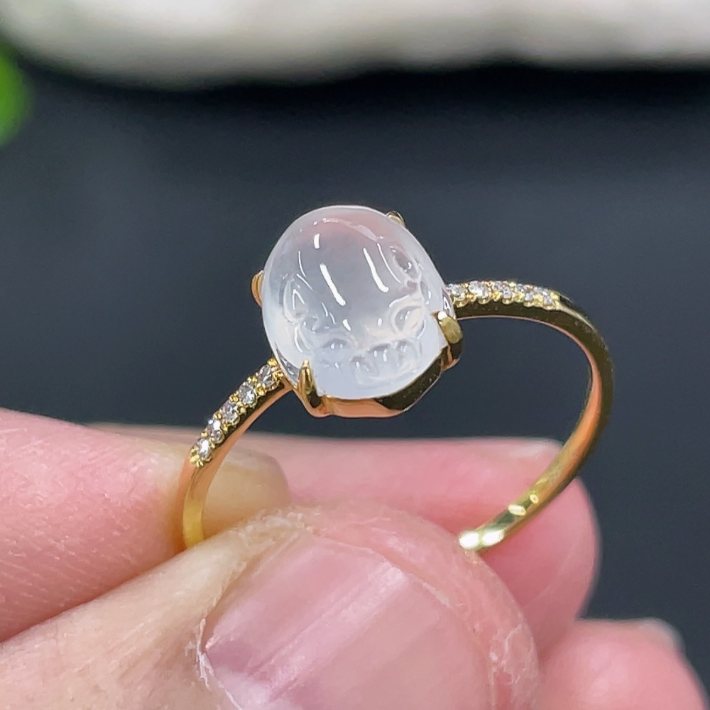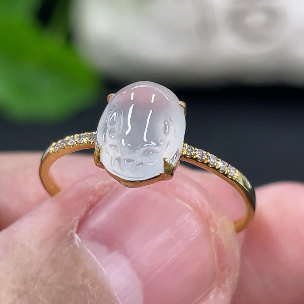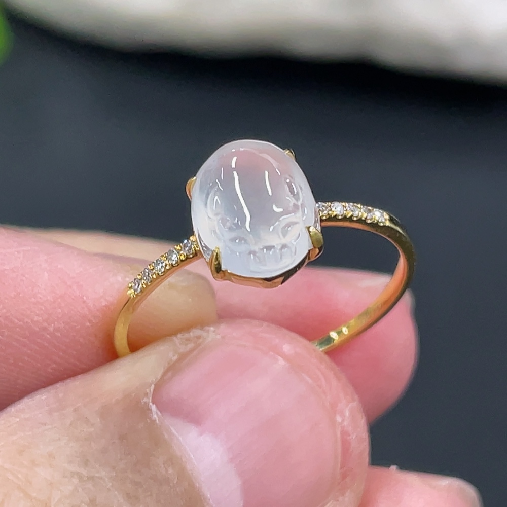 Jadeite Three-Legged Golden Toad Inlaid Ring 18k Gold Setting Size 14 Total Weight Approx. 1.25g with Diamond Accents