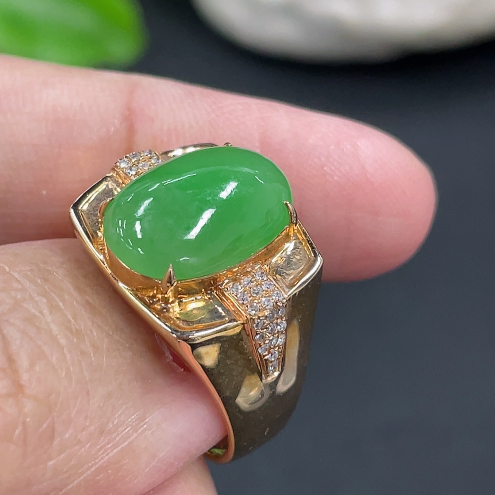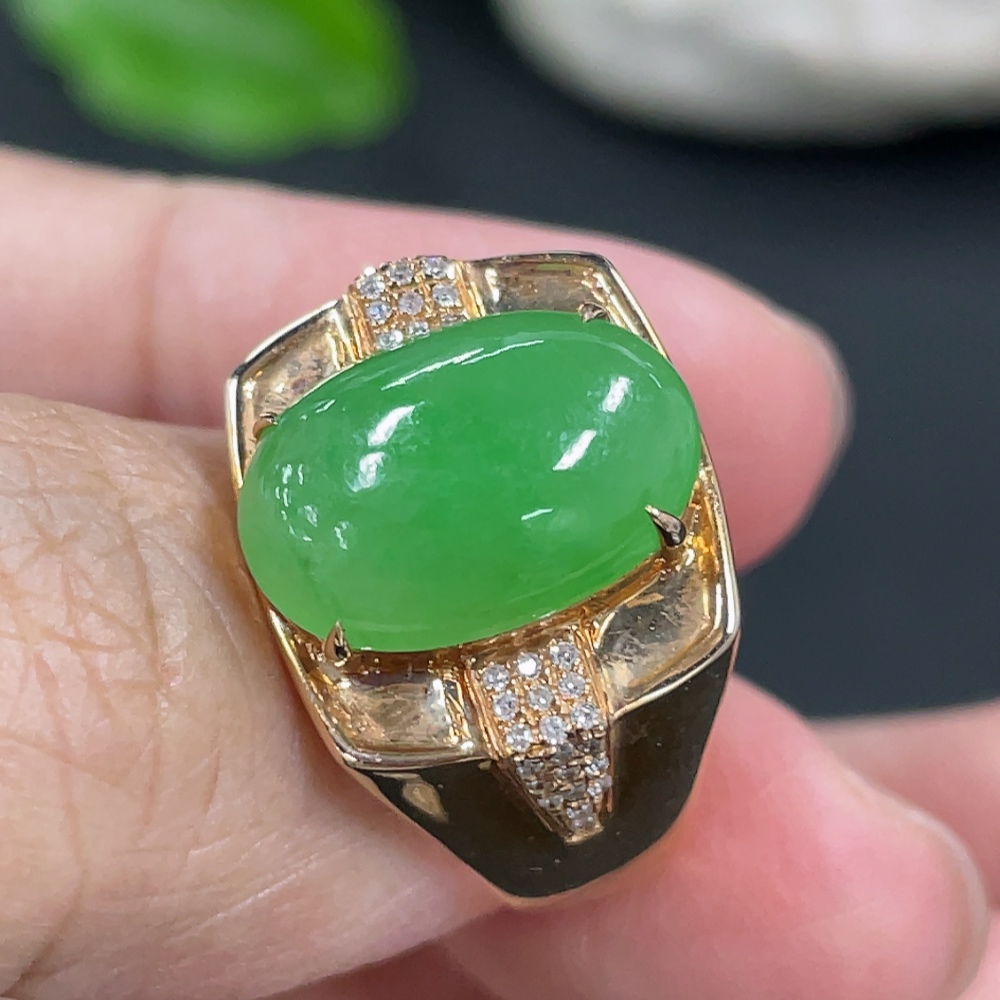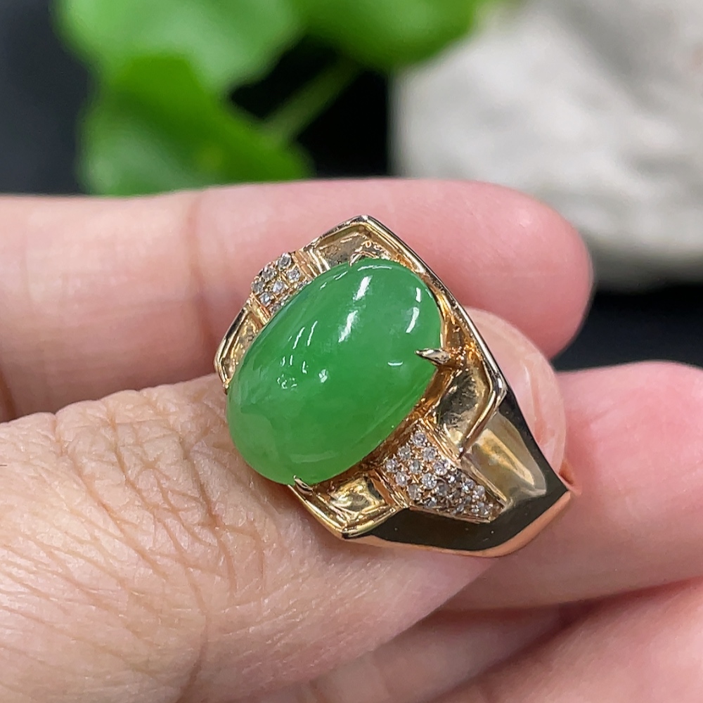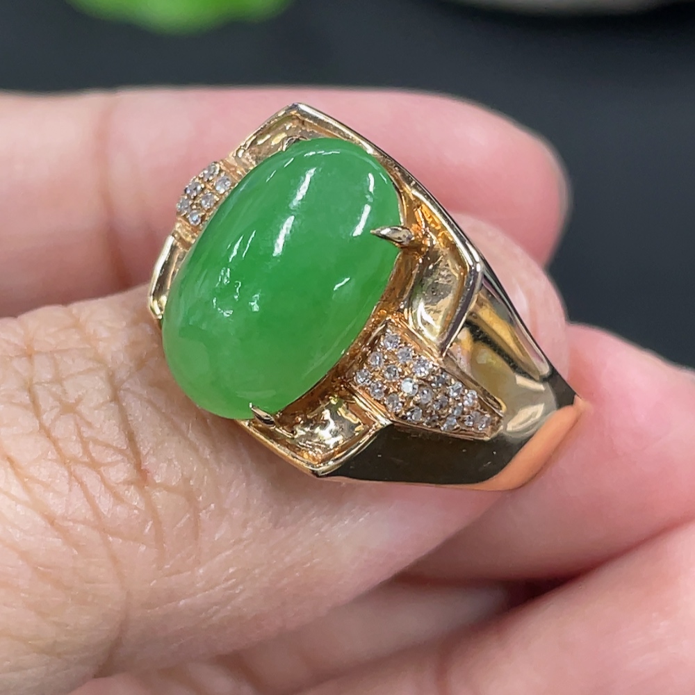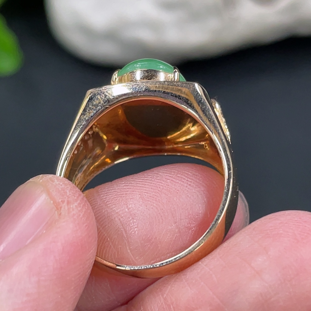 Jadeite Cabochon Ring with 18K Gold Setting, Size 17.5, Total Weight Approx. 6g, Accented with Diamonds