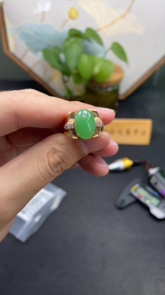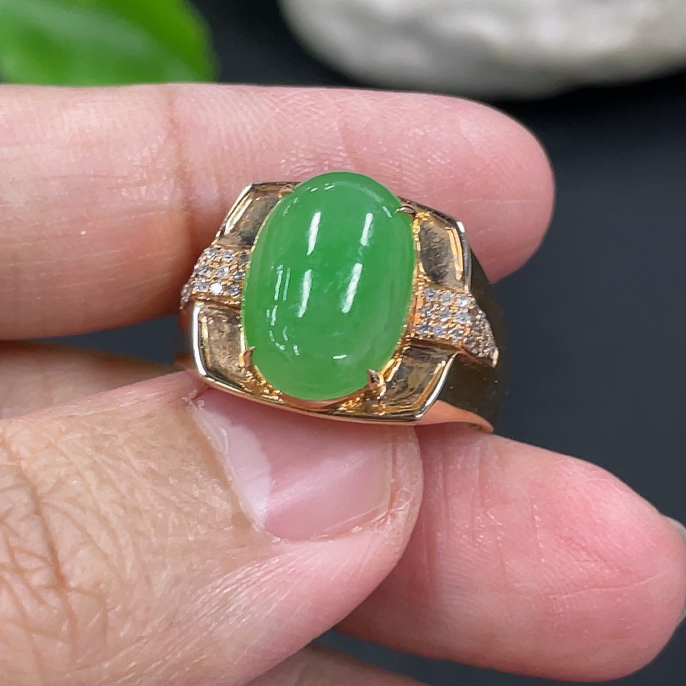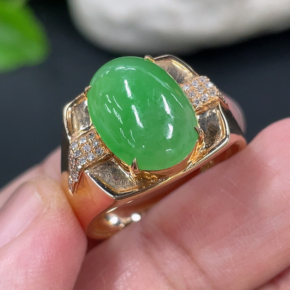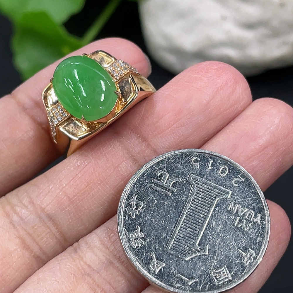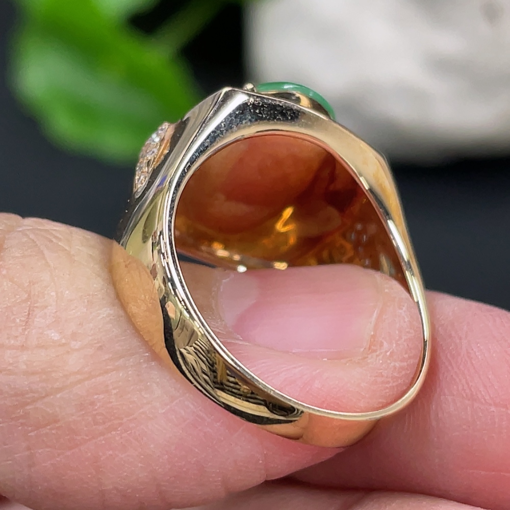 Jadeite Cabochon Ring with 18K Gold Setting, Size 17.5, Total Weight Approx. 6g, Accented with Diamonds