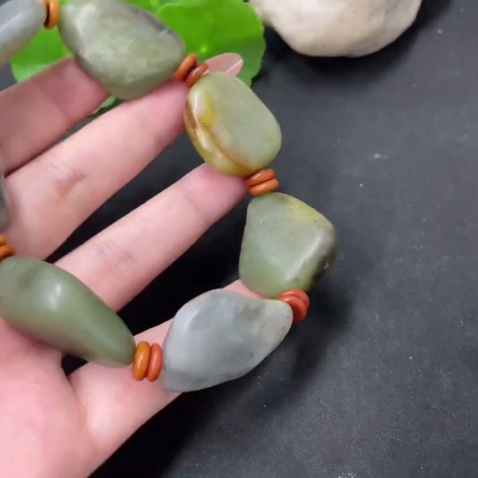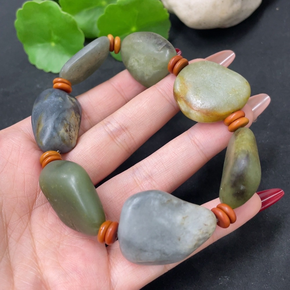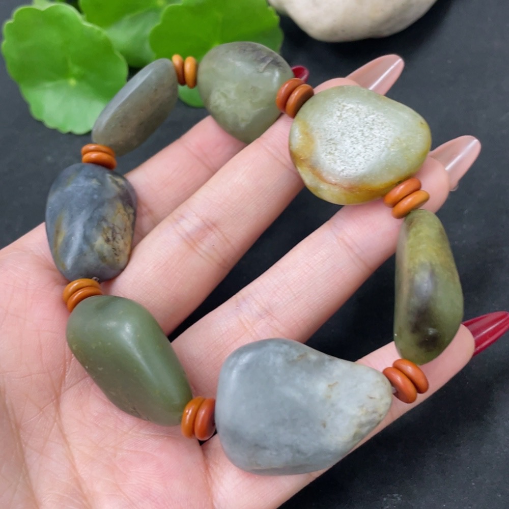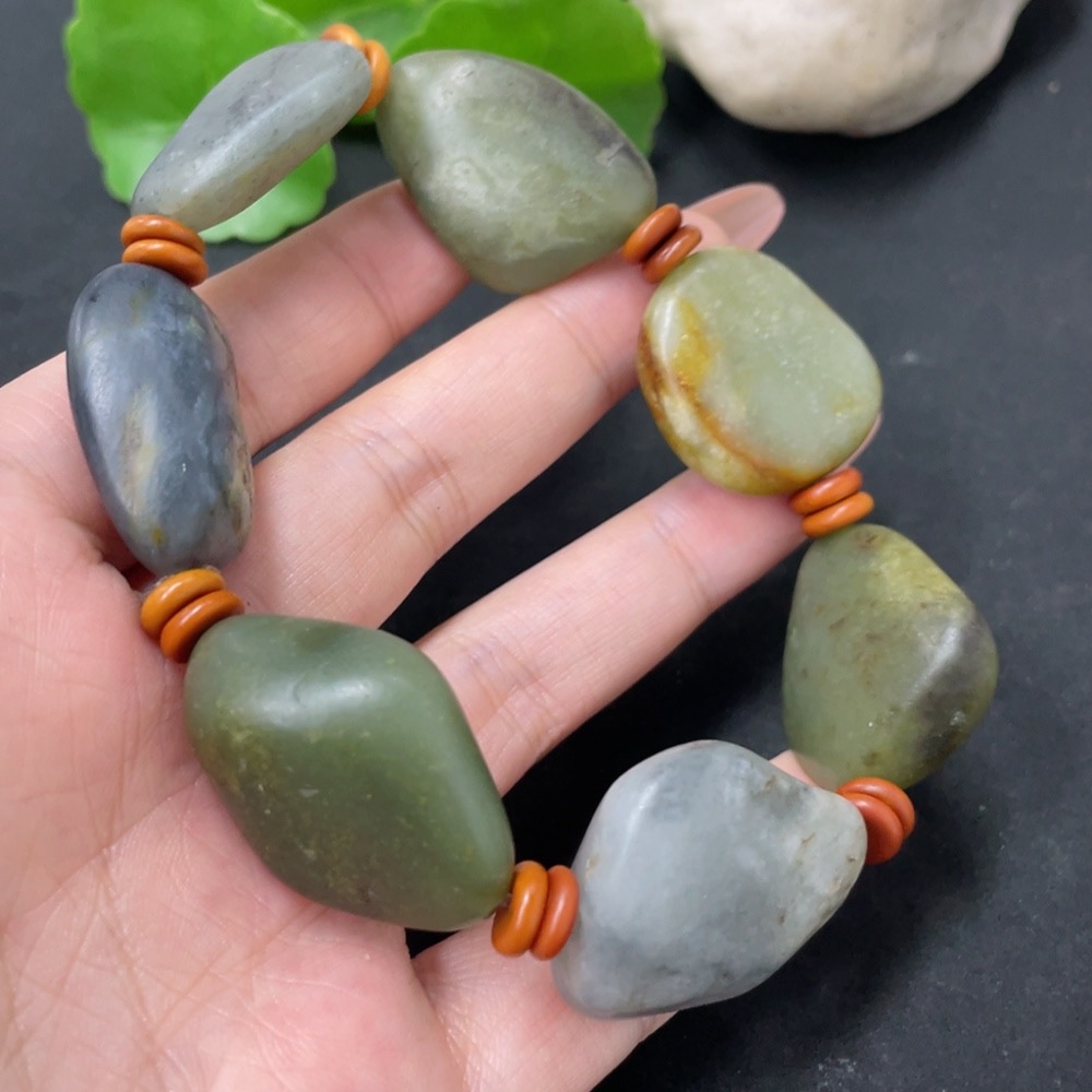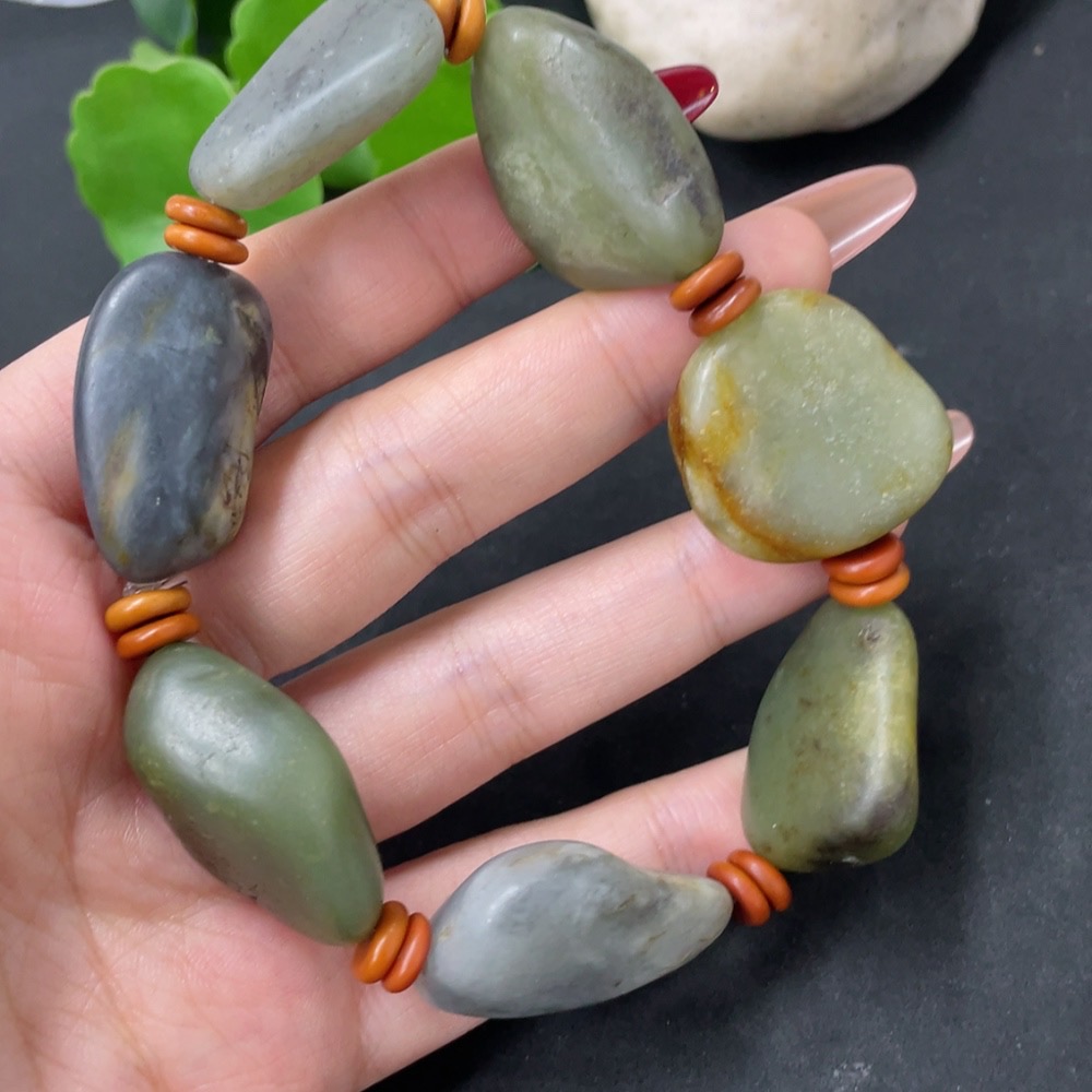 Hetian Jade Bracelet with Non-Hetian Jade Beads, Undetermined Skin Color Origin, Containing Other Mineral Components, Total Weight Approximately 80.3g