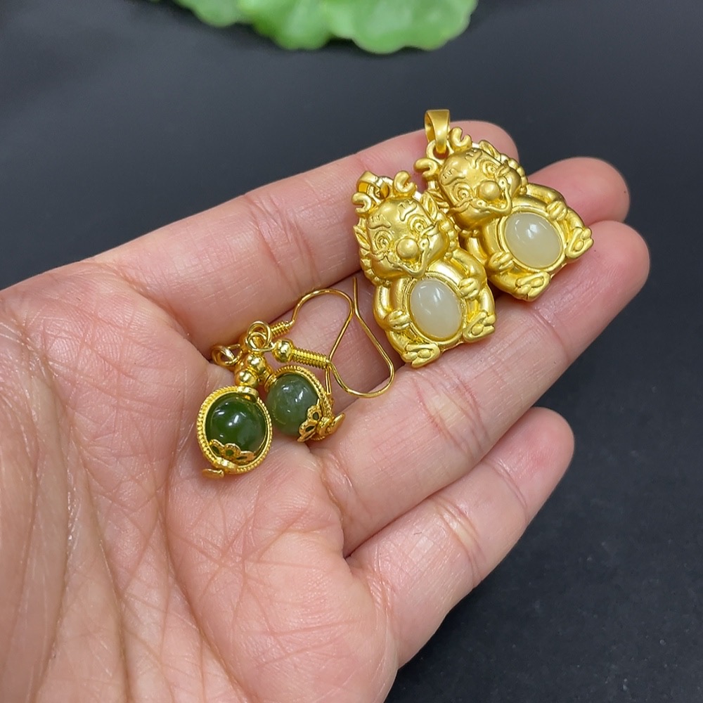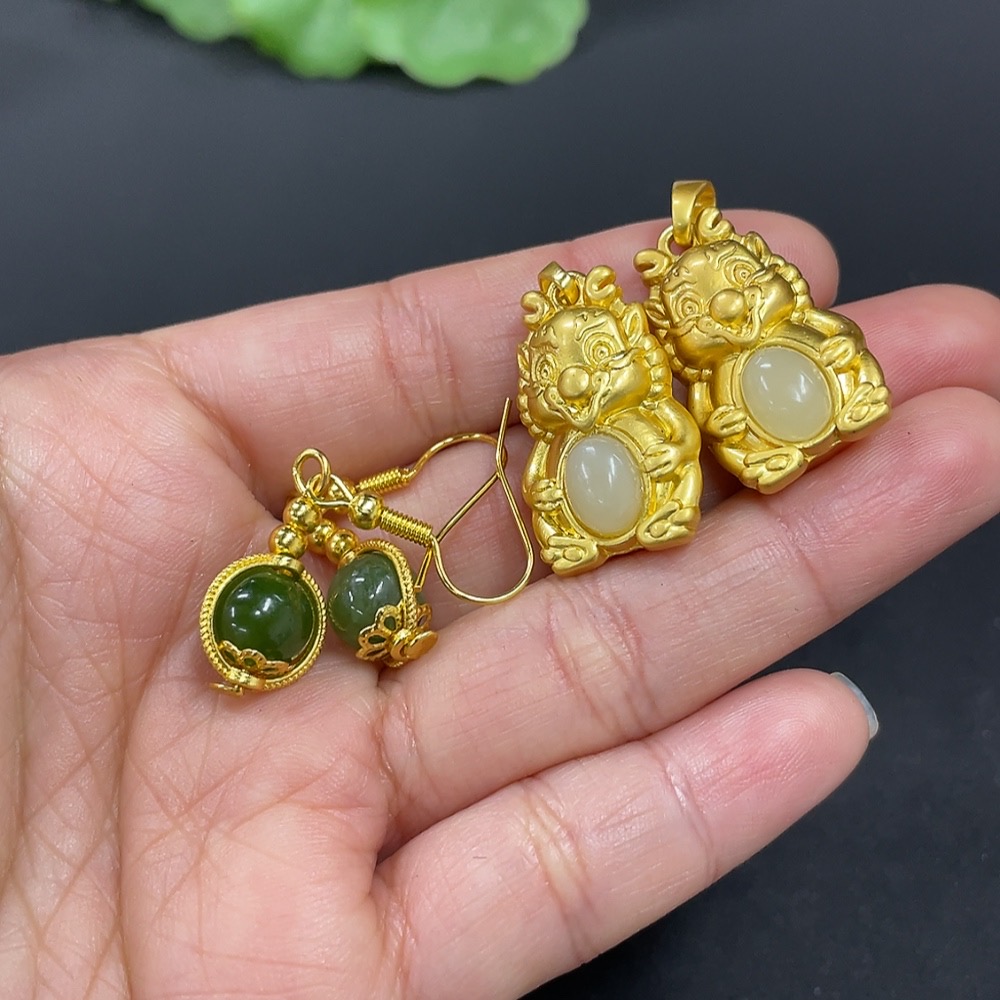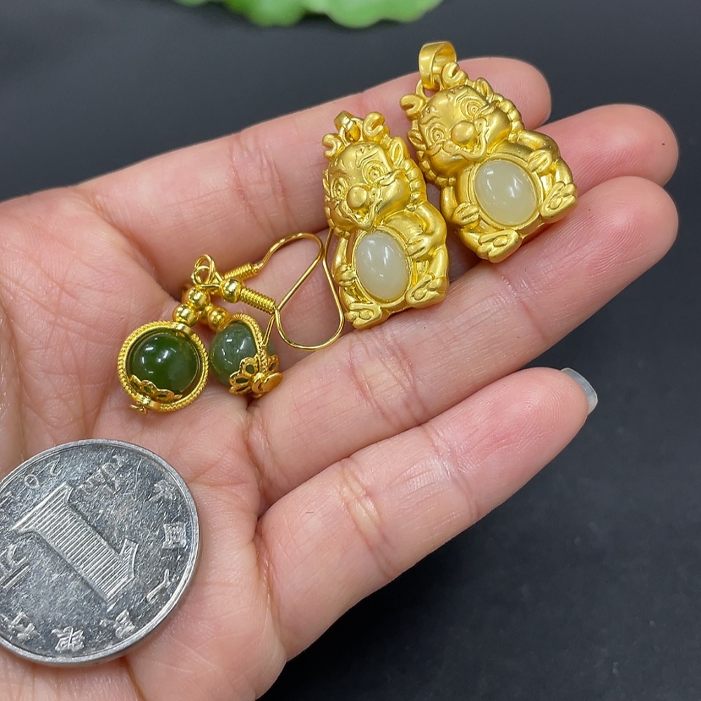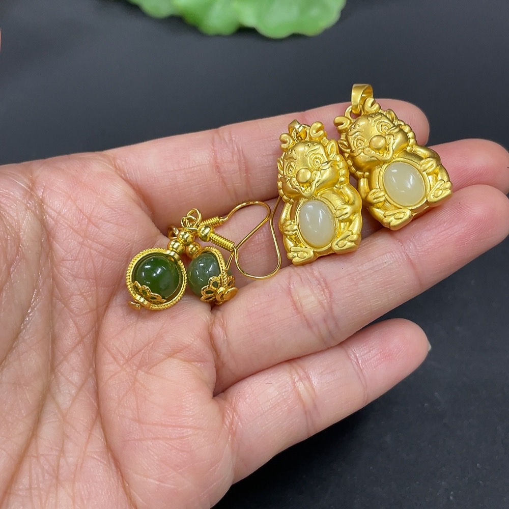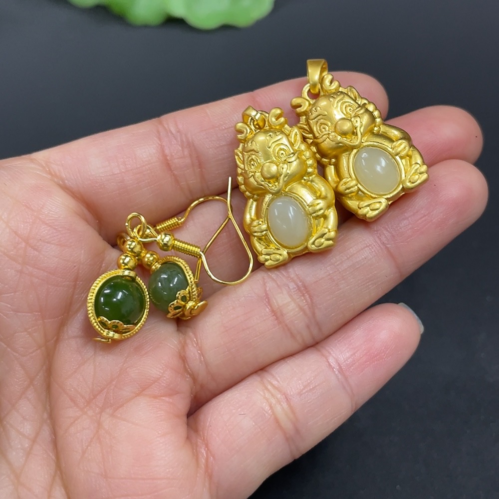 Hetian Jade Inlaid Earrings + Pendant Non-Gold Total Weight Approx. 24.3g
