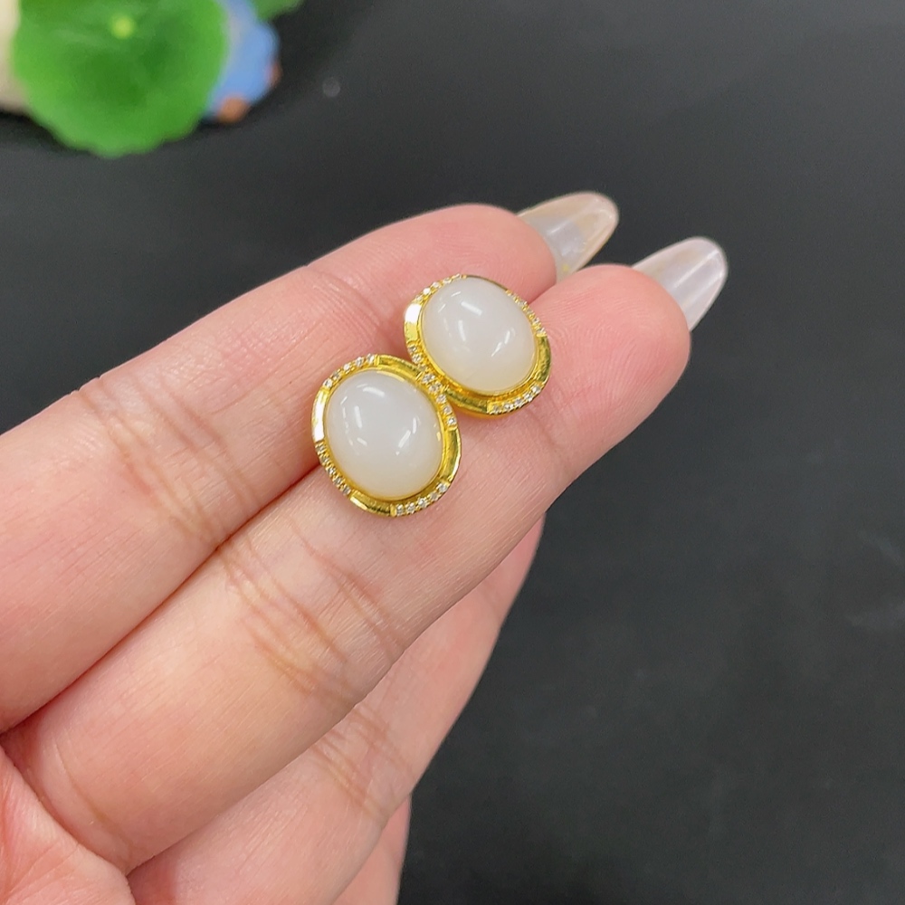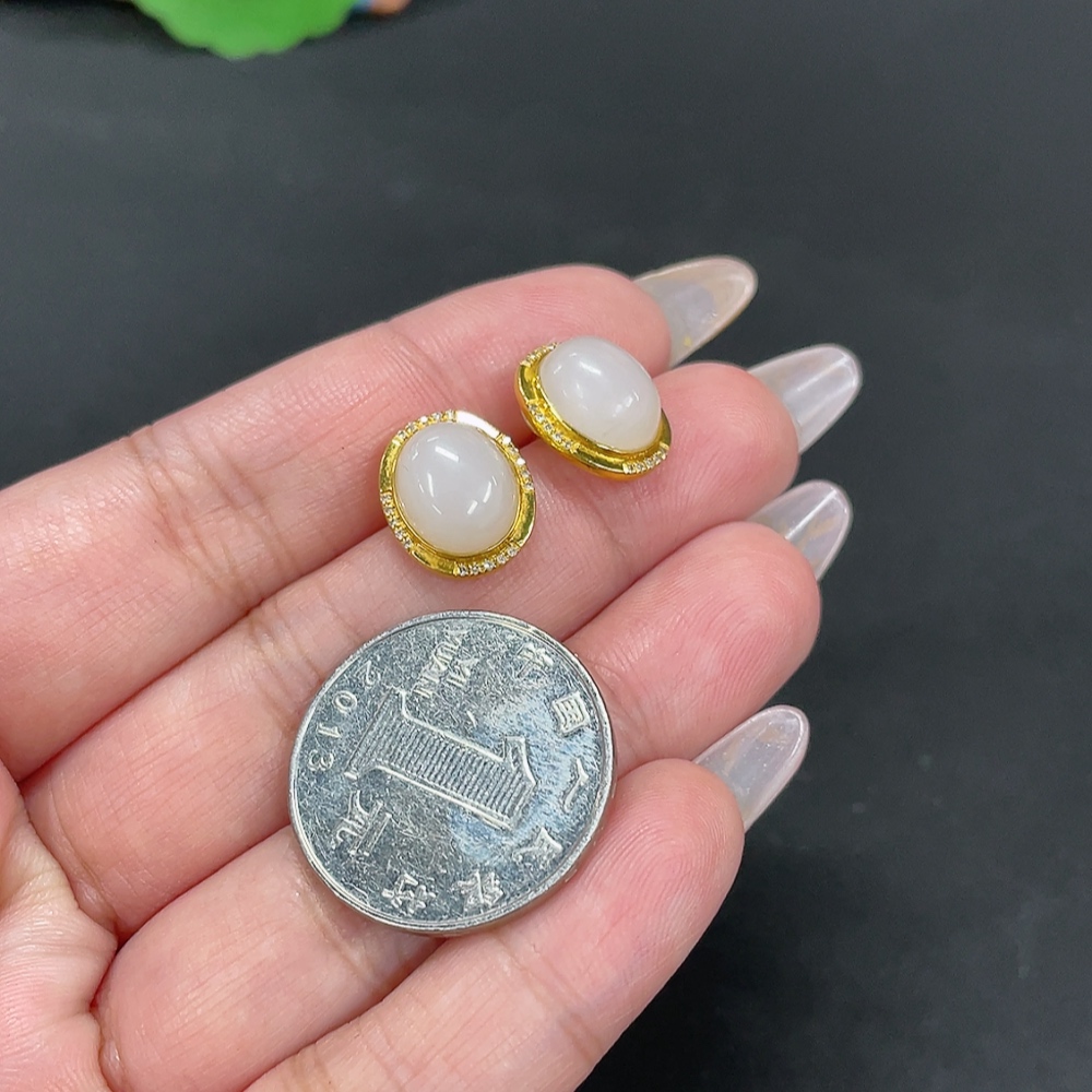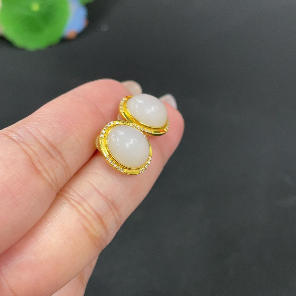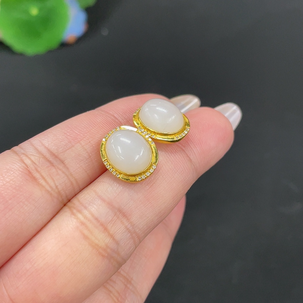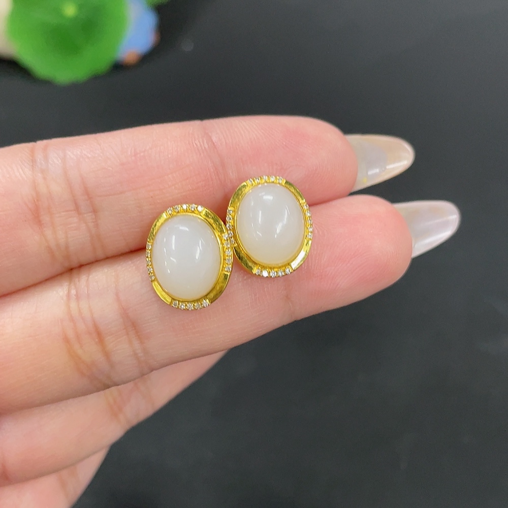 Hetian Jade Inlaid Earrings Total Weight Approx. 3.5g 18k with Diamond Accents