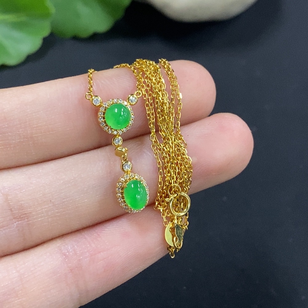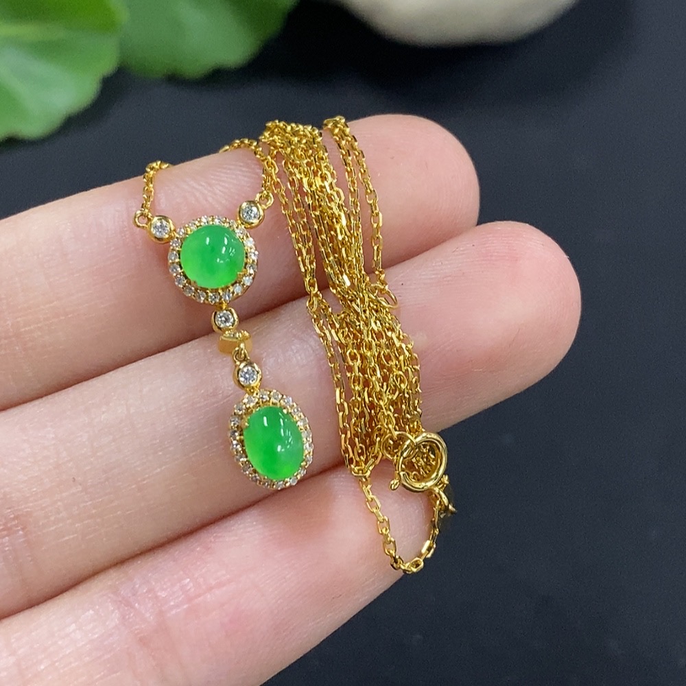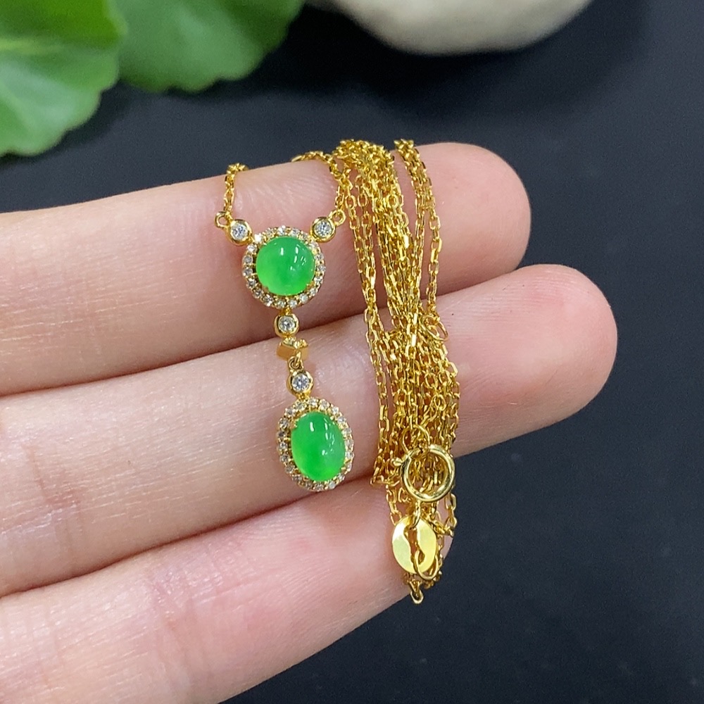 Jadeite Cabochon Pendant, 18K Gold with Diamond Accents, Total Weight Approx. 2.4g Including Chain