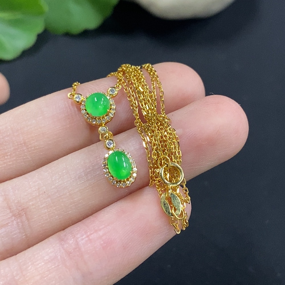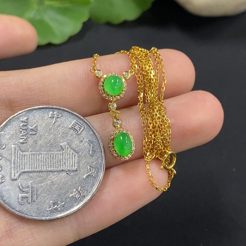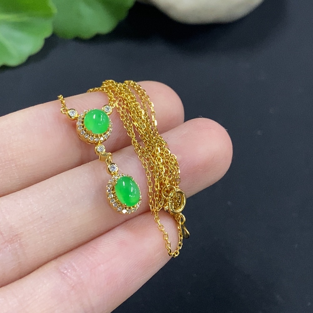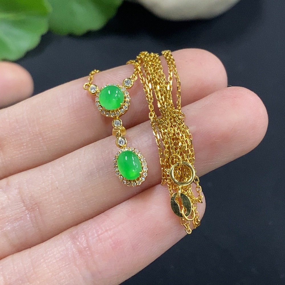 Jadeite Cabochon Pendant, 18K Gold with Diamond Accents, Total Weight Approx. 2.4g Including Chain