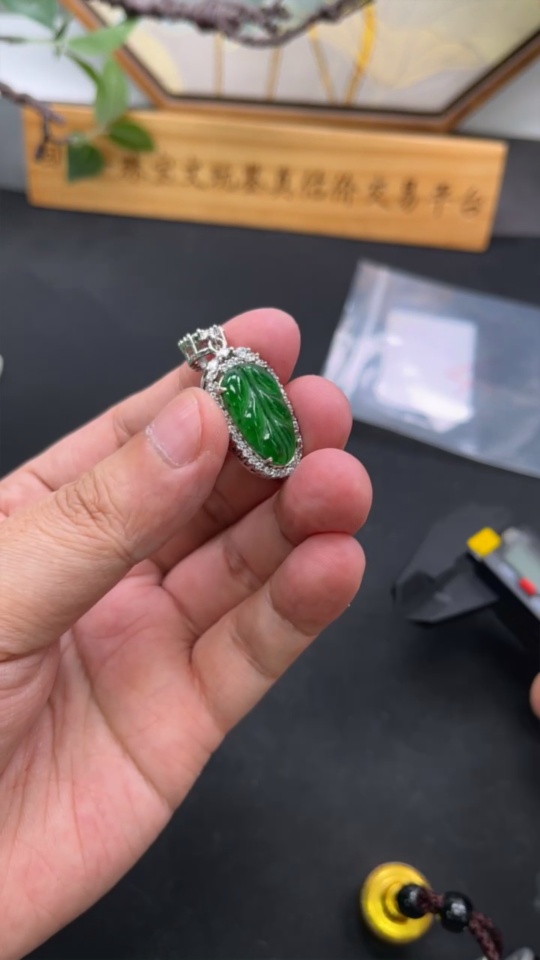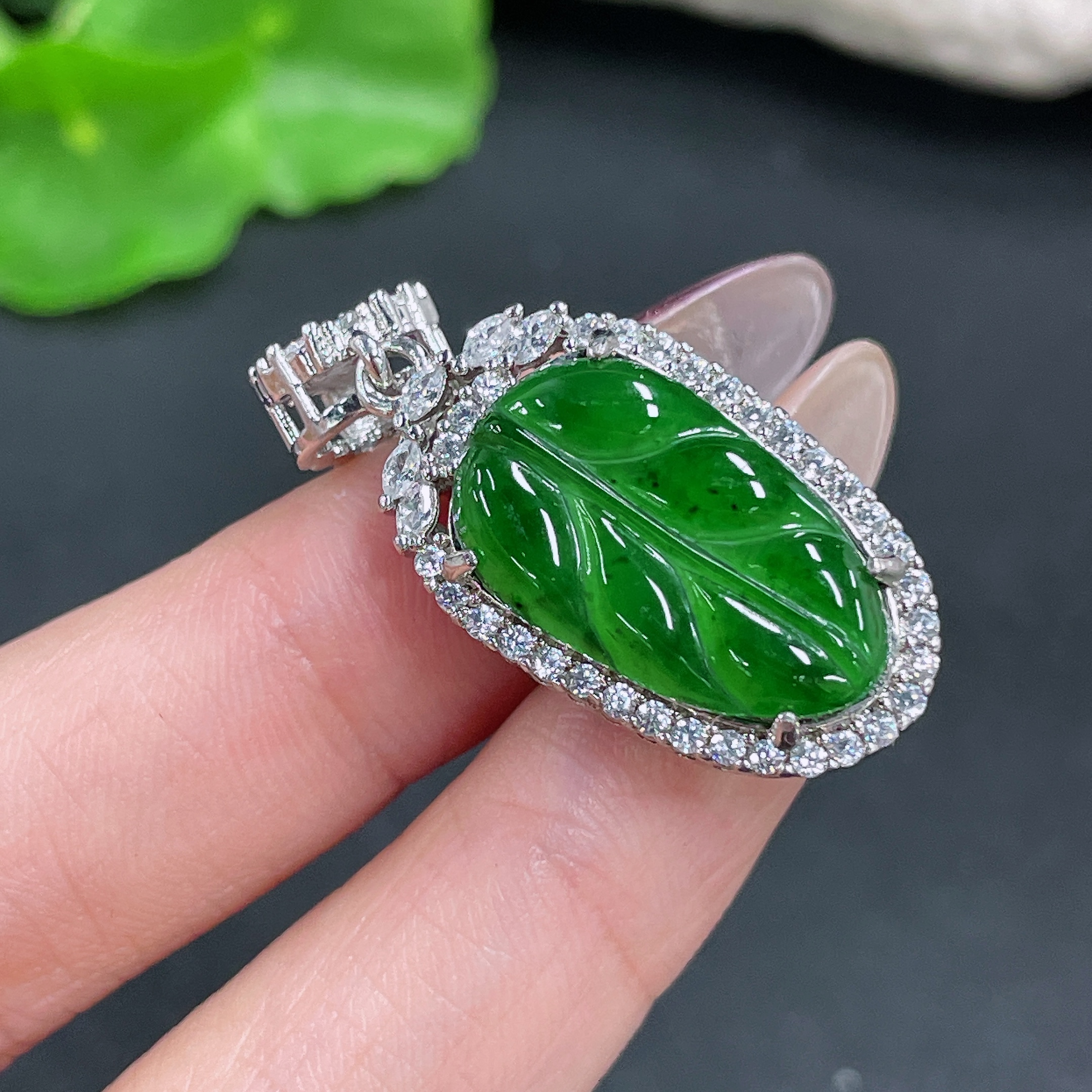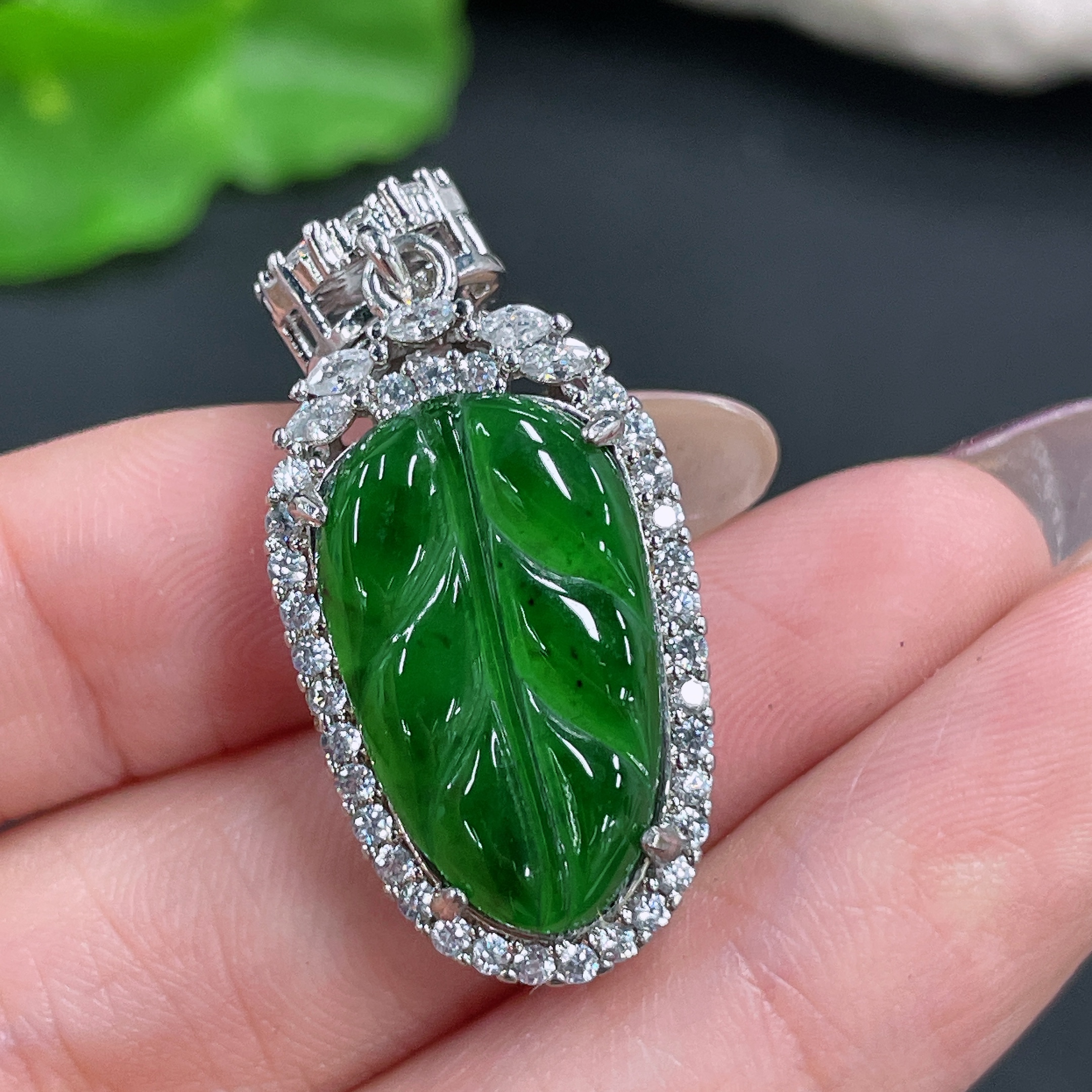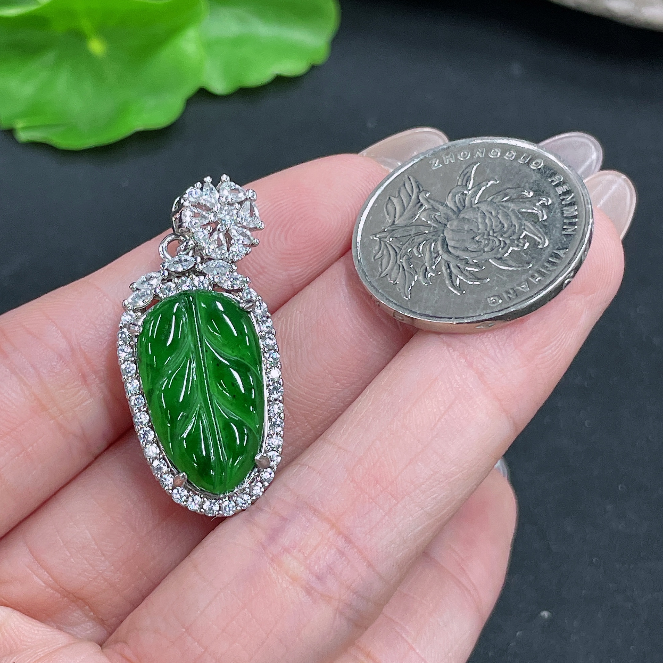 Jadeite Leaf Inlaid Pendant Non-Gold Total Weight Approx. 6g