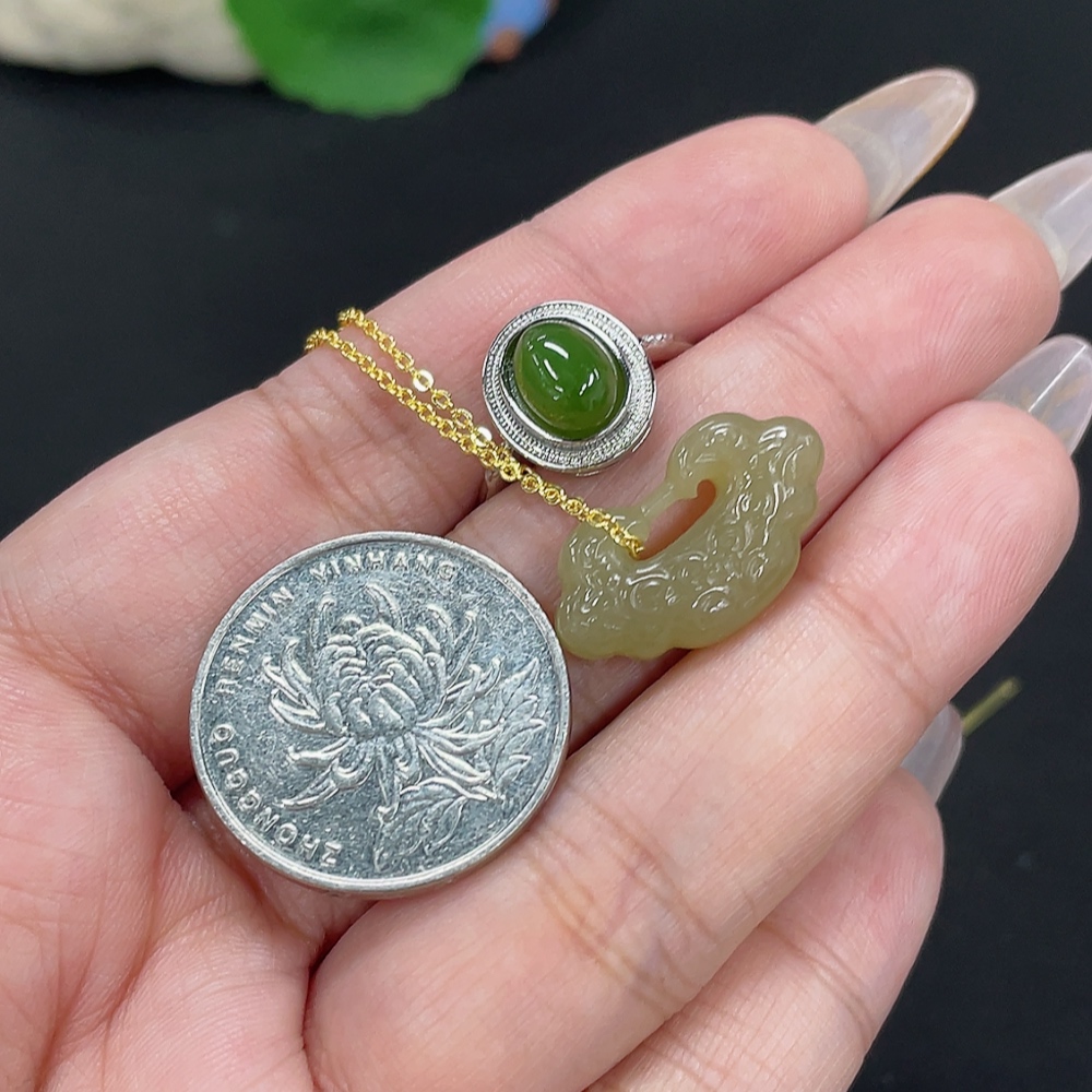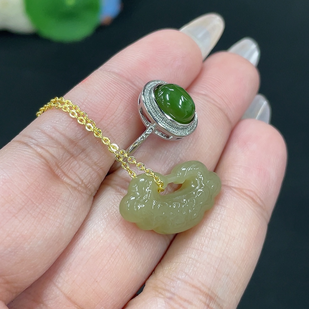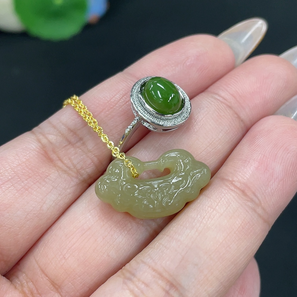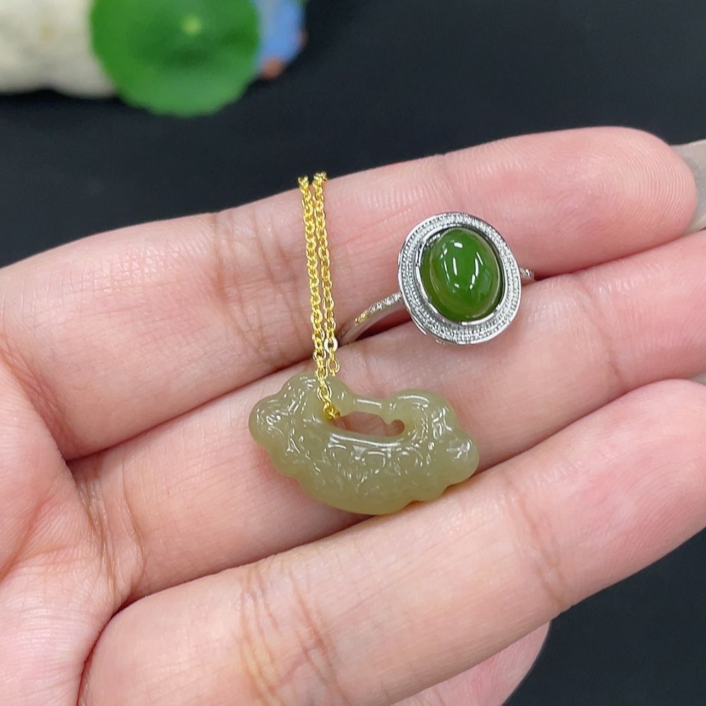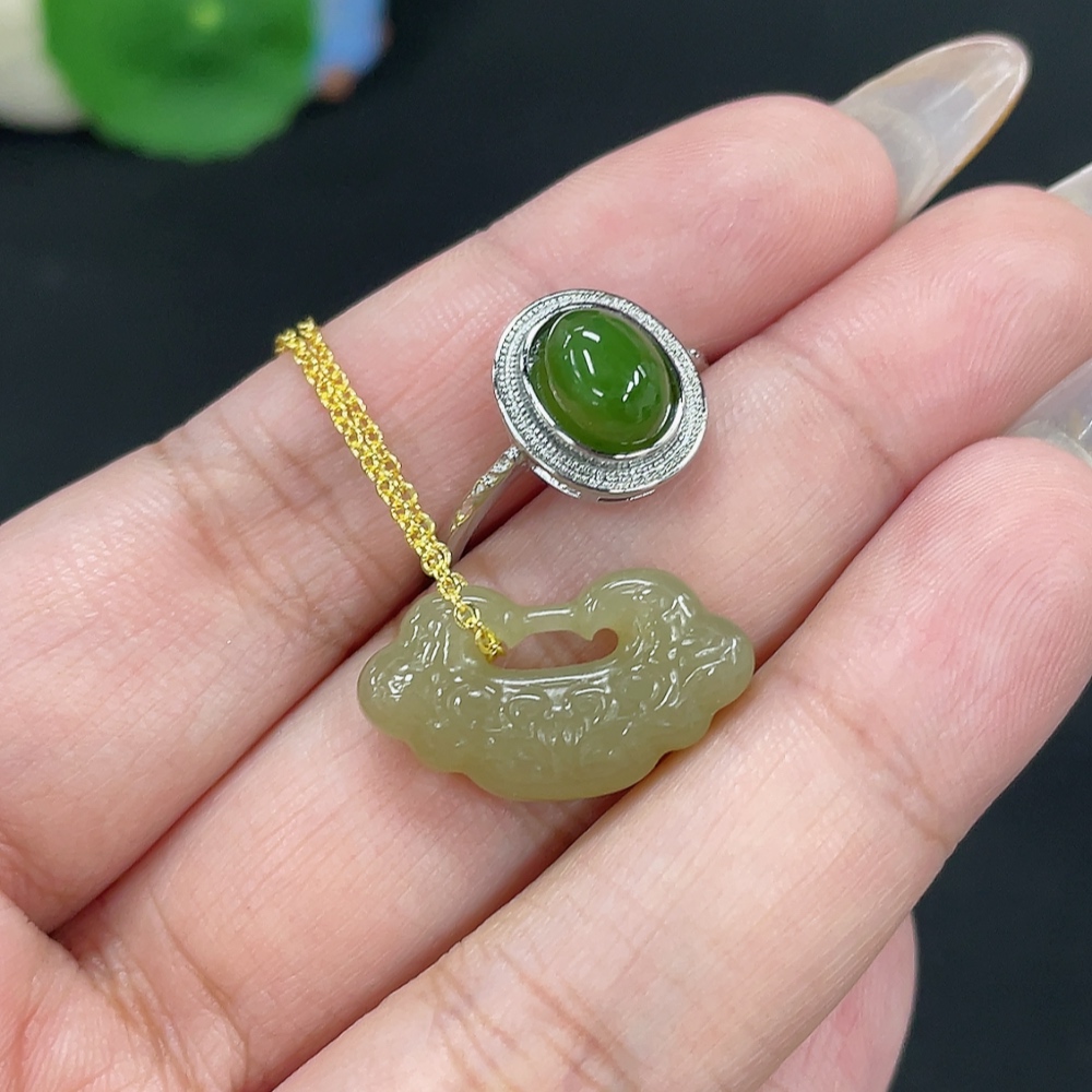Hetian Jade Pendant Ruyi Adjustable Ring Non-Gold-Inlaid Total Weight Approx. (Including Chain) 6.8g