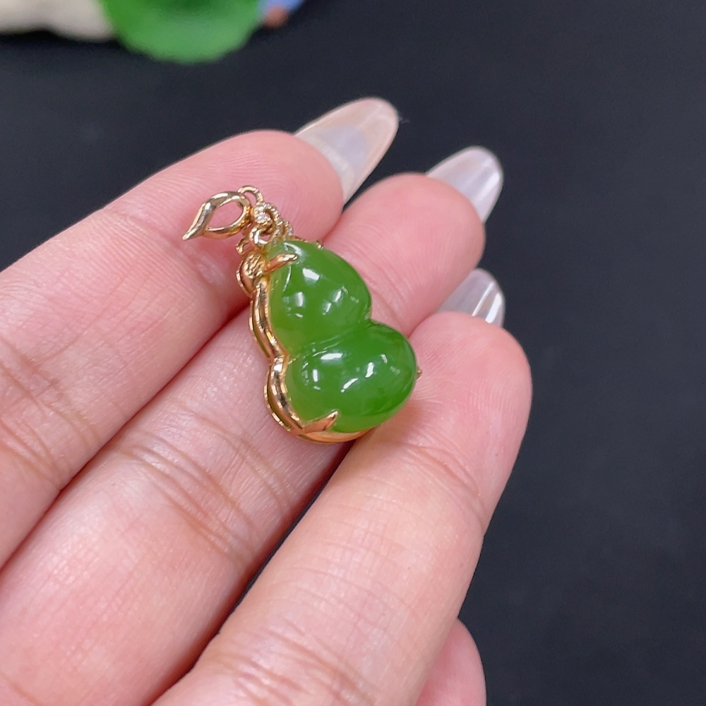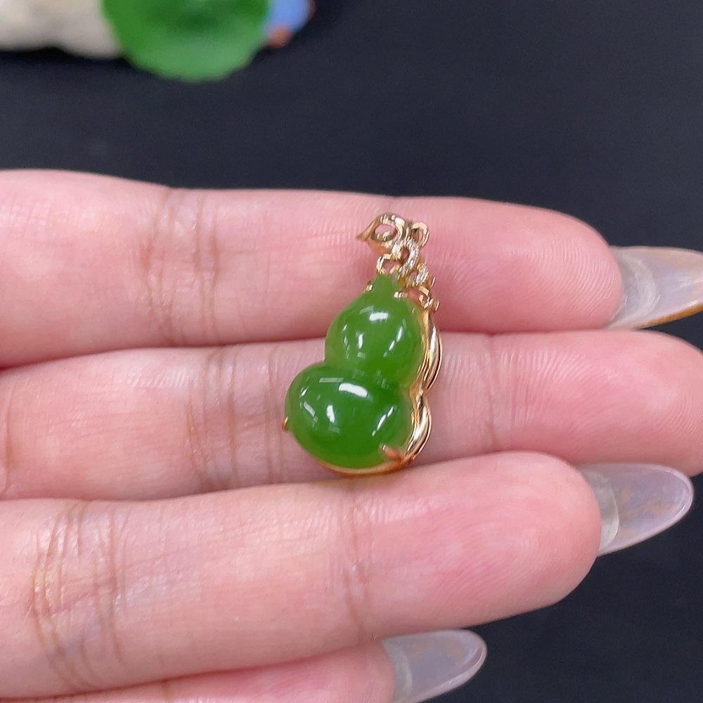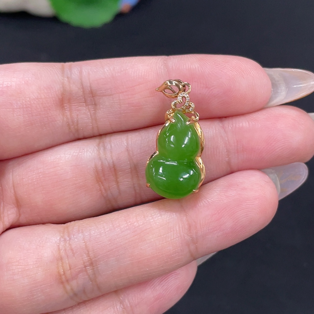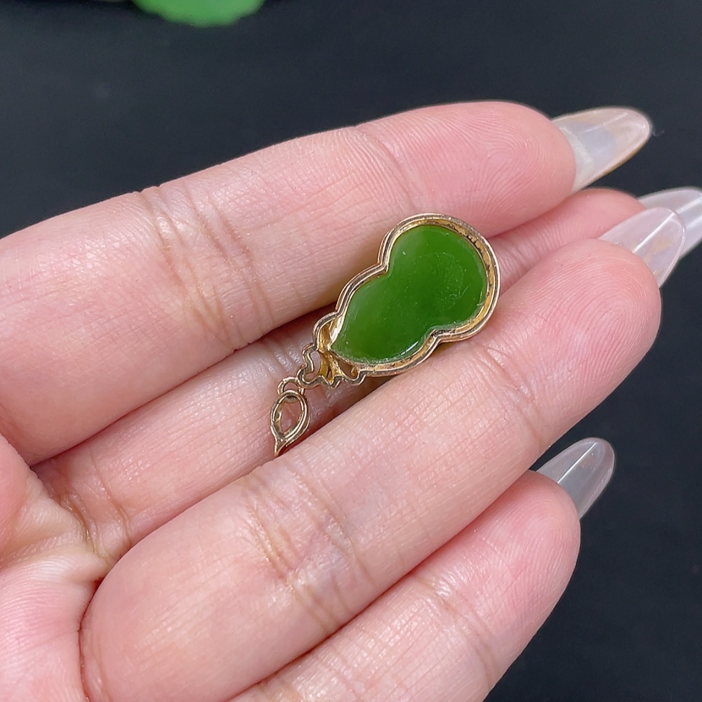 Hetian Jade Jasper Inlaid Pendant Gourd Total Weight Approx. 3.4g 18k Gold with Diamond Accents