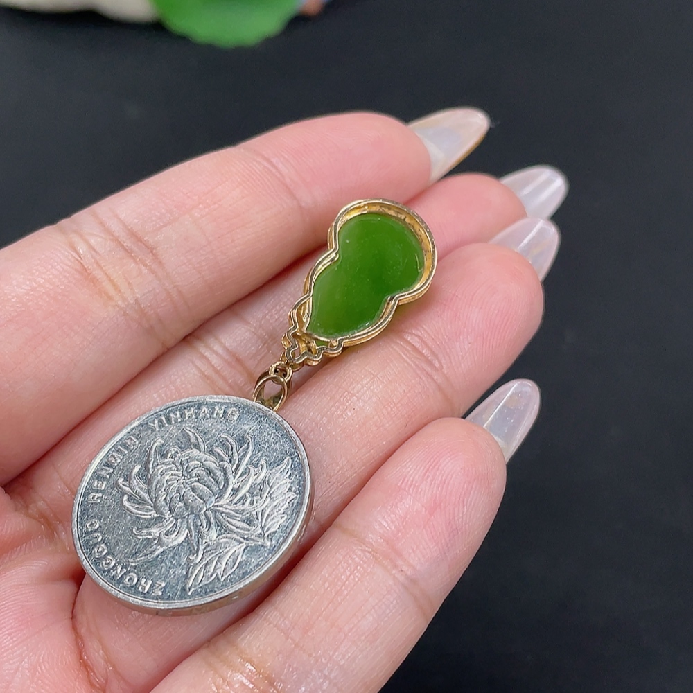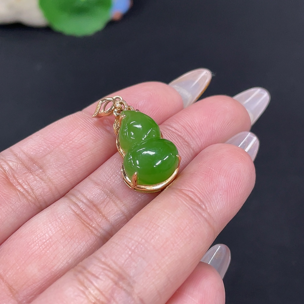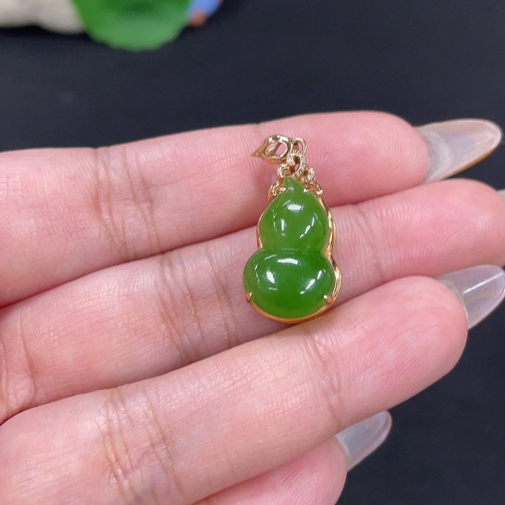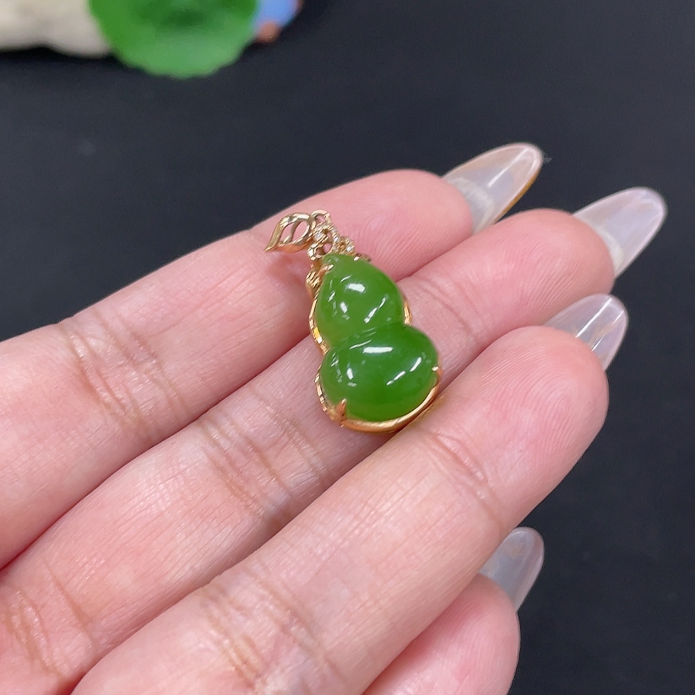 Hetian Jade Jasper Inlaid Pendant Gourd Total Weight Approx. 3.4g 18k Gold with Diamond Accents