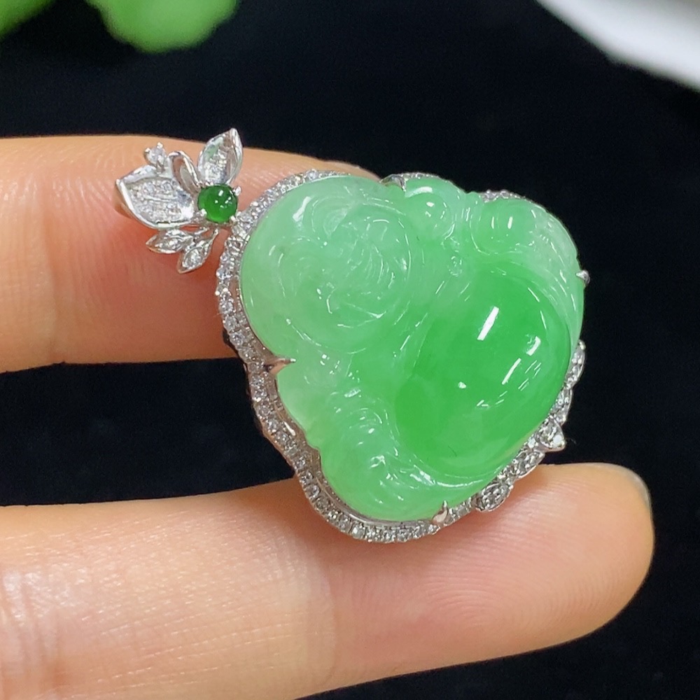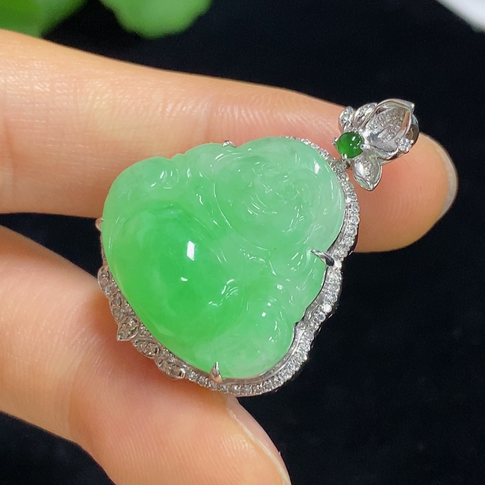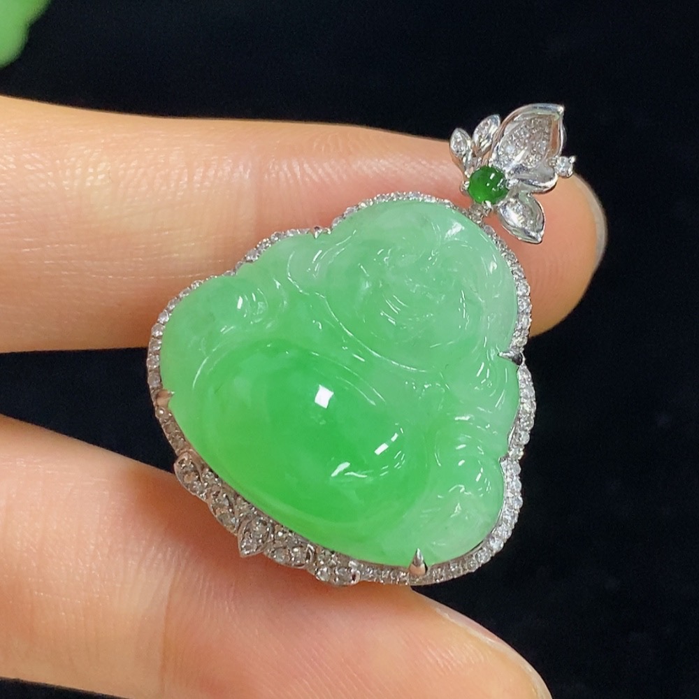 Jadeite Buddha Pendant with 18K Gold and Diamond Accents, Total Weight Approximately 8.58g