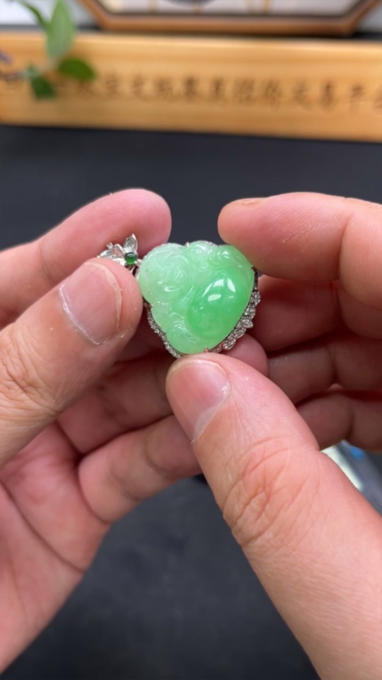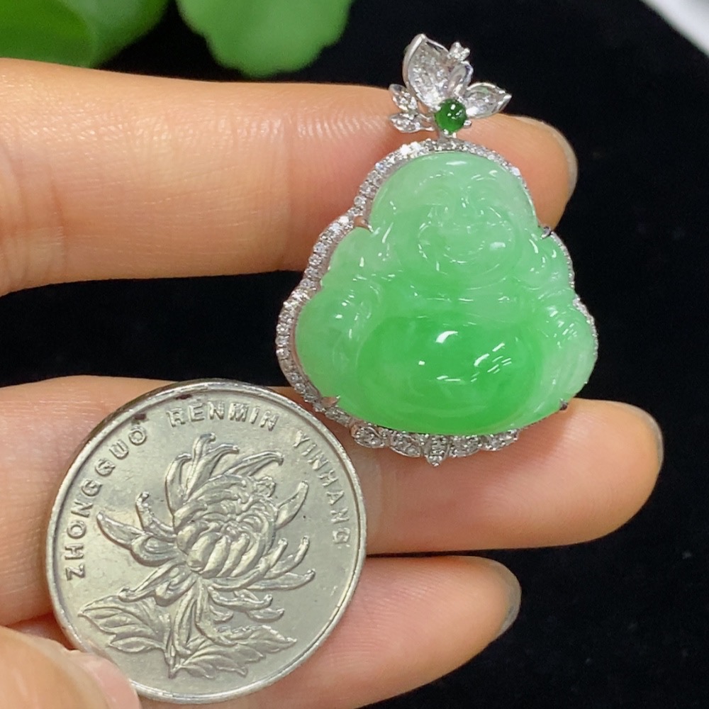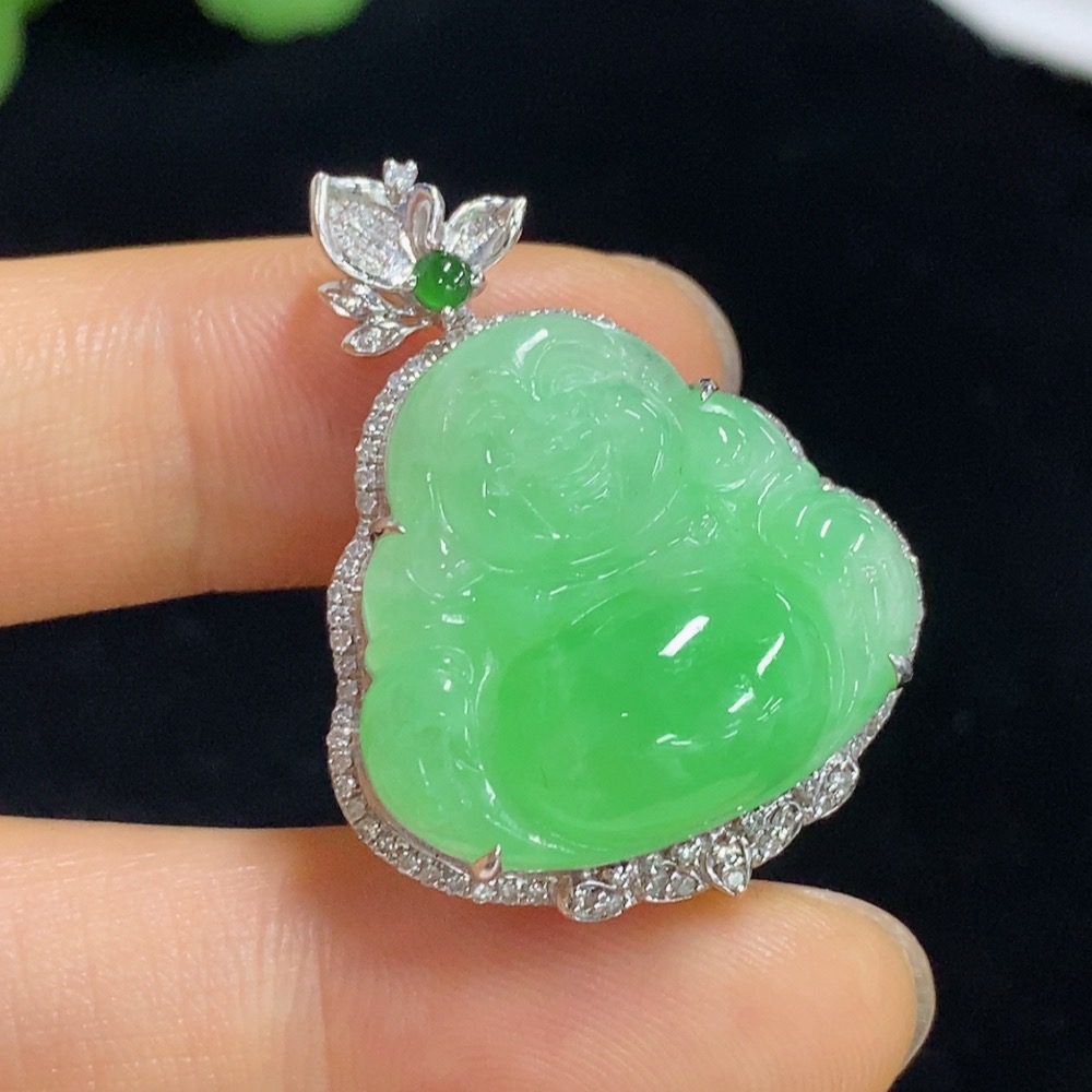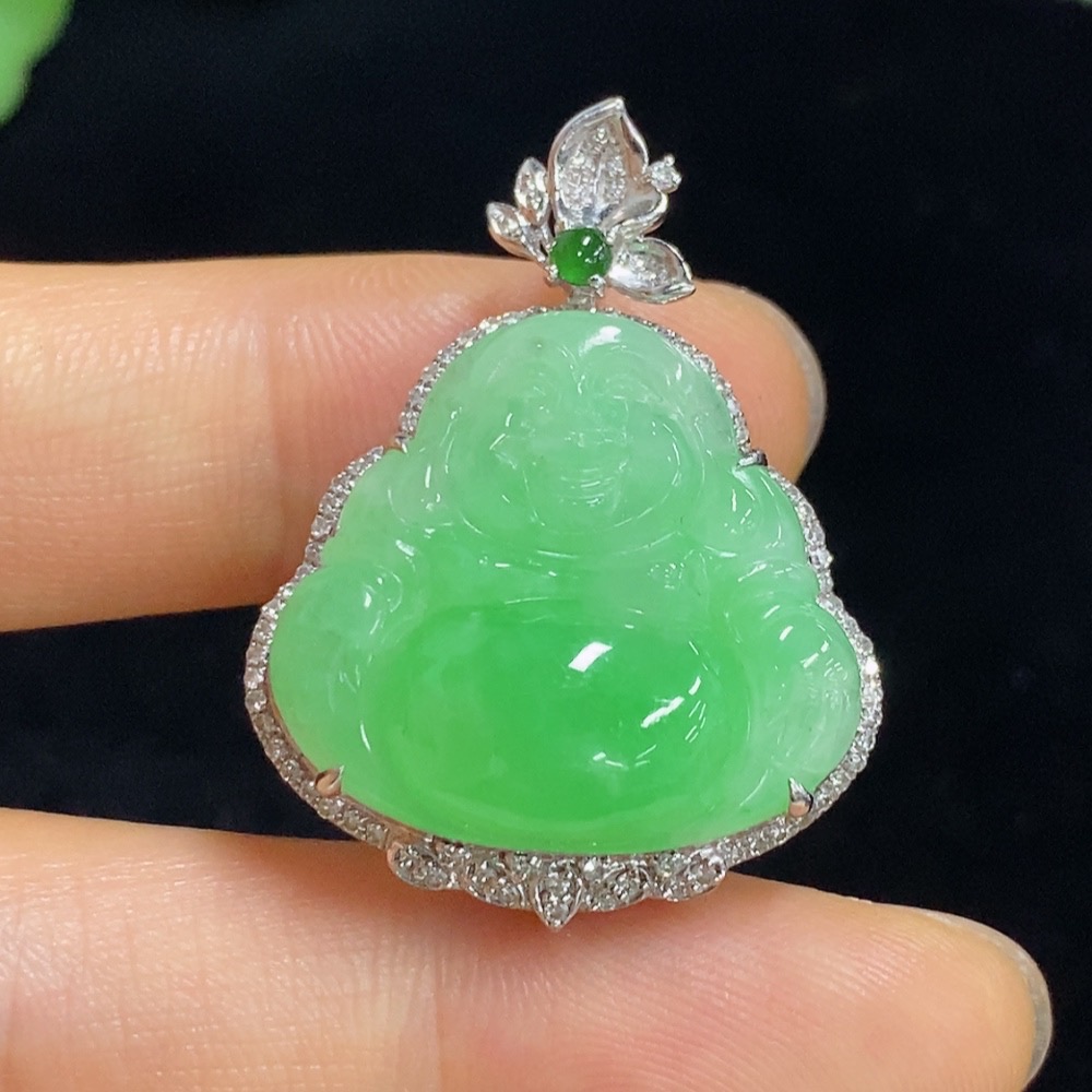 Jadeite Buddha Pendant with 18K Gold and Diamond Accents, Total Weight Approximately 8.58g