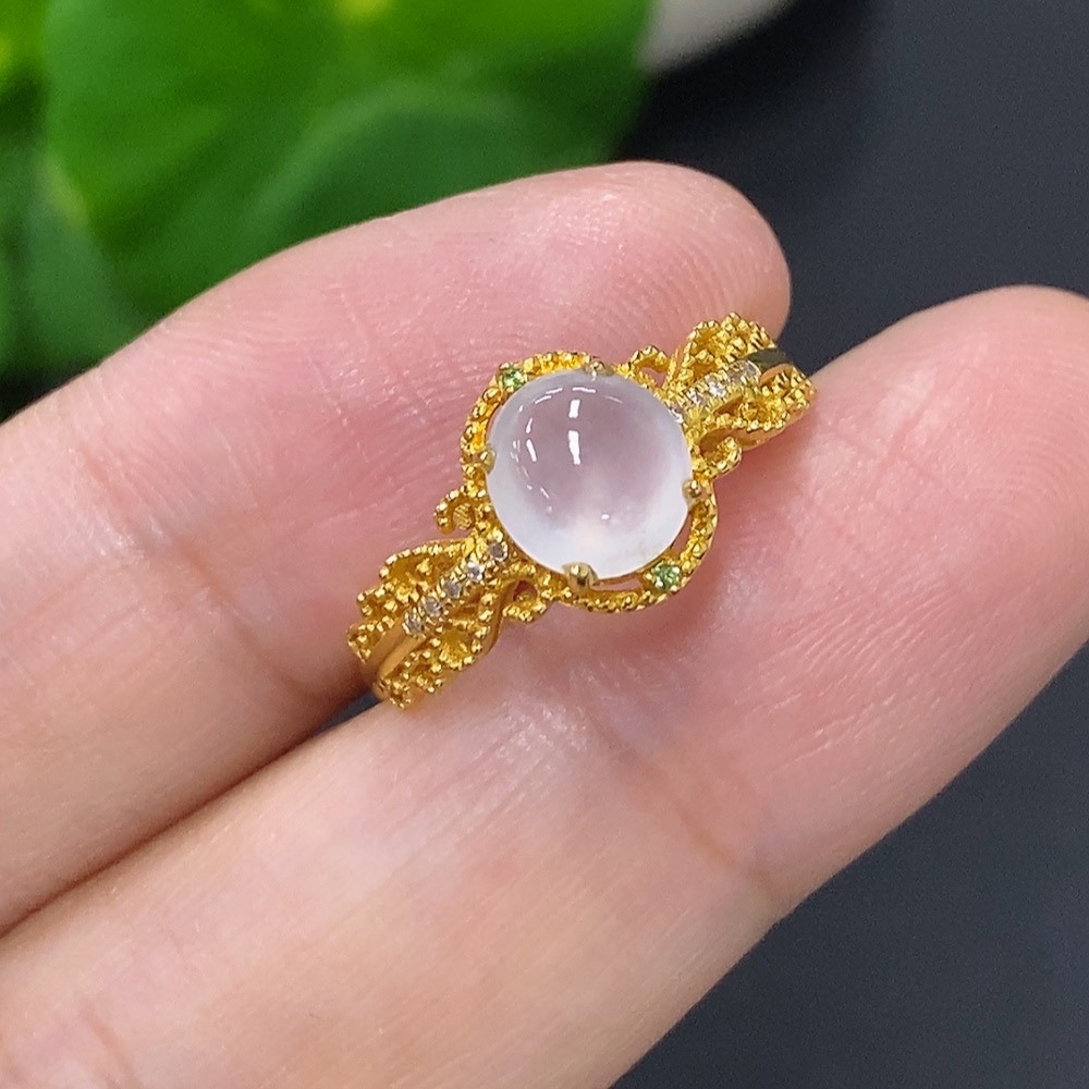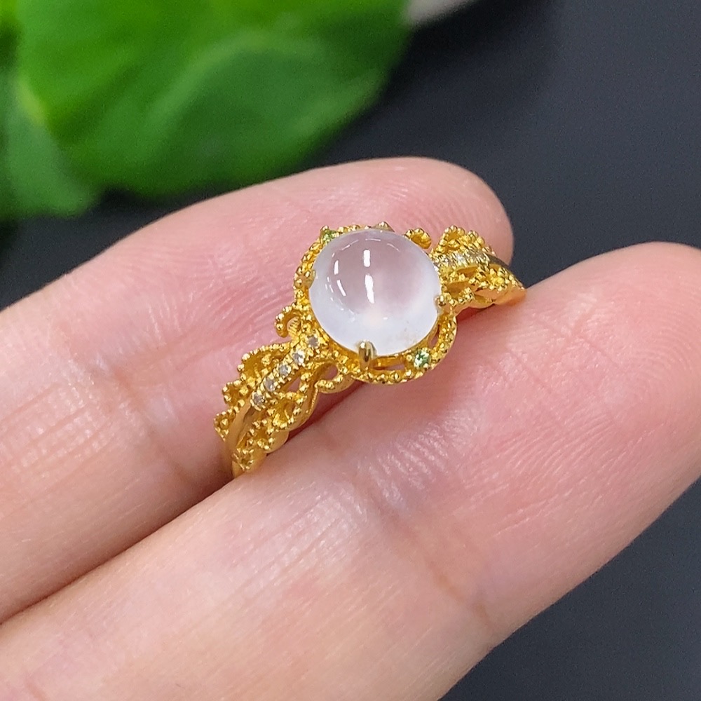 Jadeite Cabochon Ring with 18K Gold Size 13 Total Weight Approx. 1.7g (Accented with Diamonds)