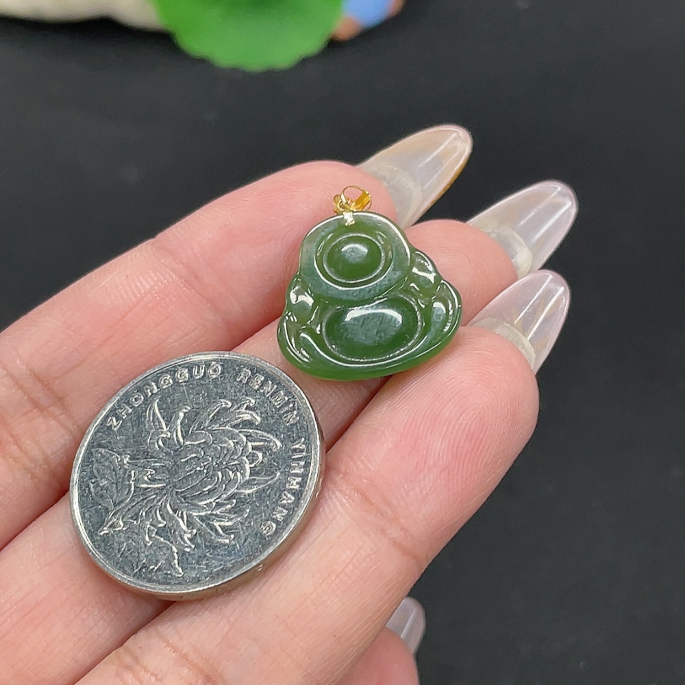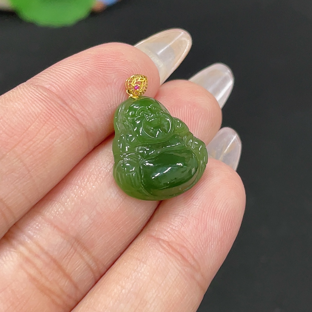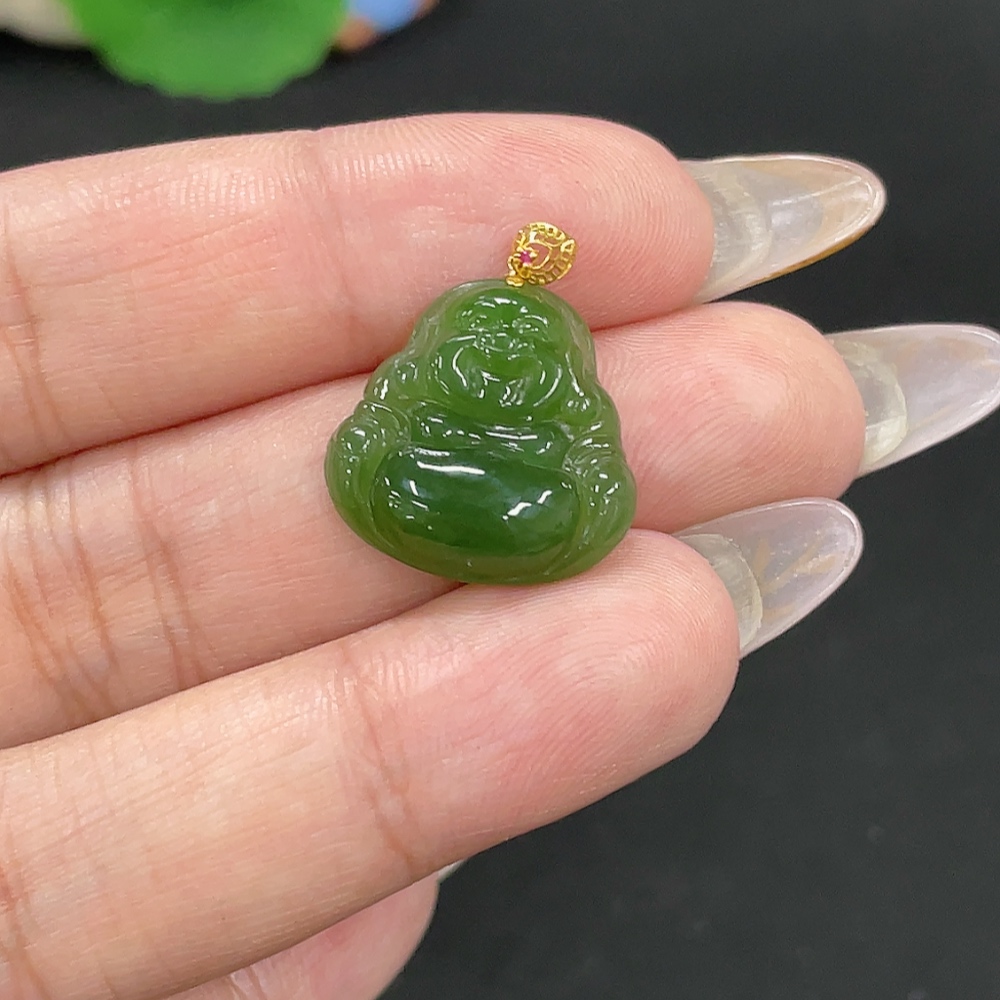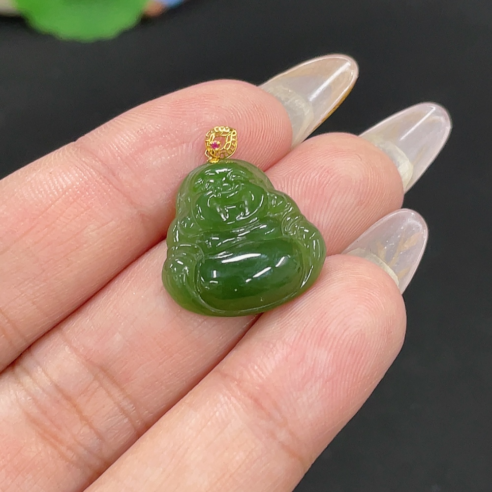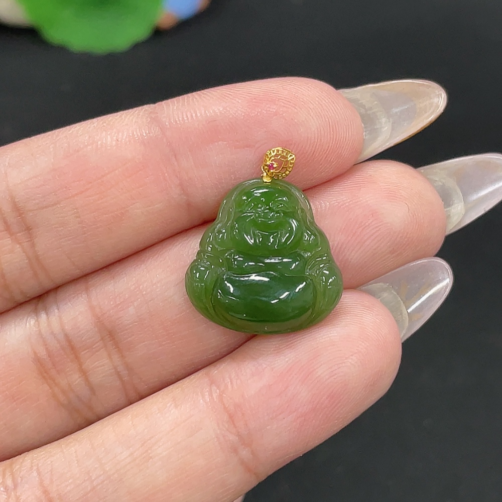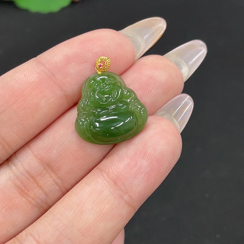 Hetian Jade Jasper Pendant - Buddha - 18K Gold Clasp - Total Weight Approx. 2.2g